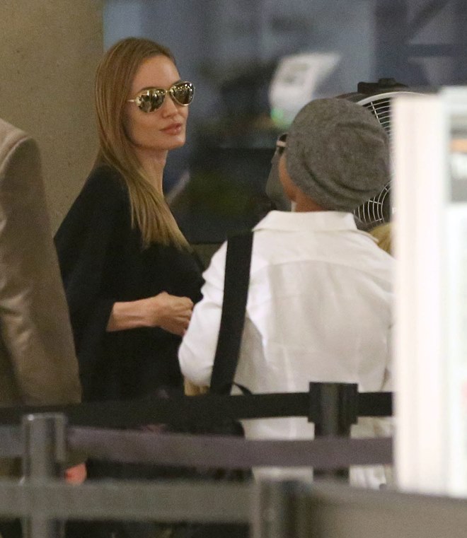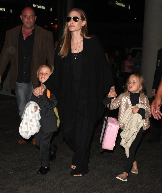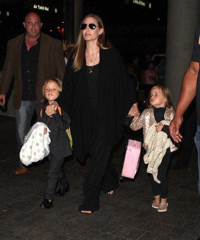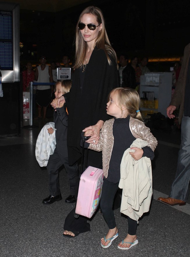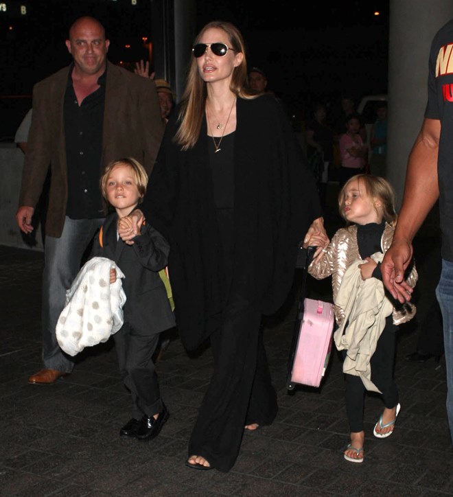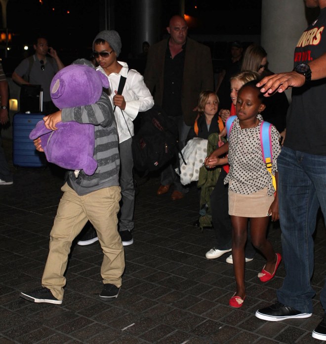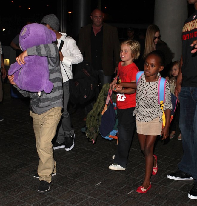 Angelina Jolie and all 6 children were photographed at LAX yesterday on their way to Australia where she’s supposed to begin directing Unbroken. Do they book out the entire first class cabin? Or were there other first class passengers allowed on? Would it bother you less if it was Shiloh the Chosen One running up and down the aisles?