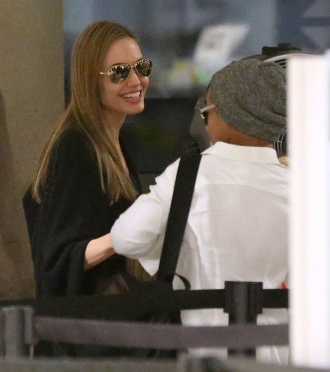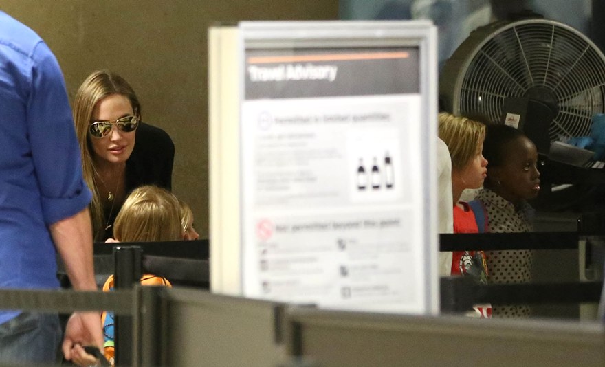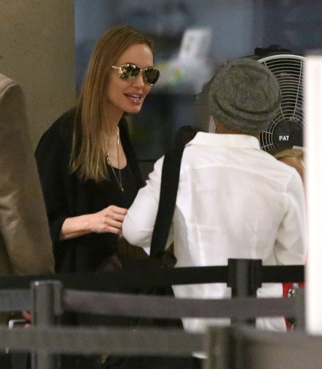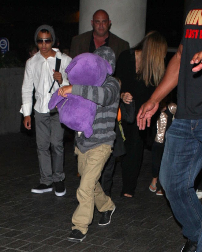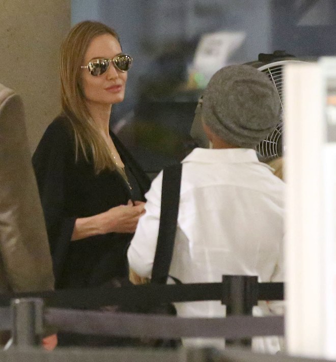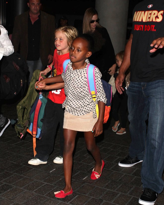 Angelina Jolie and all 6 children were photographed at LAX yesterday on their way to Australia where she’s supposed to begin directing Unbroken. Do they book out the entire first class cabin? Or were there other first class passengers allowed on? Would it bother you less if it was Shiloh the Chosen One running up and down the aisles?