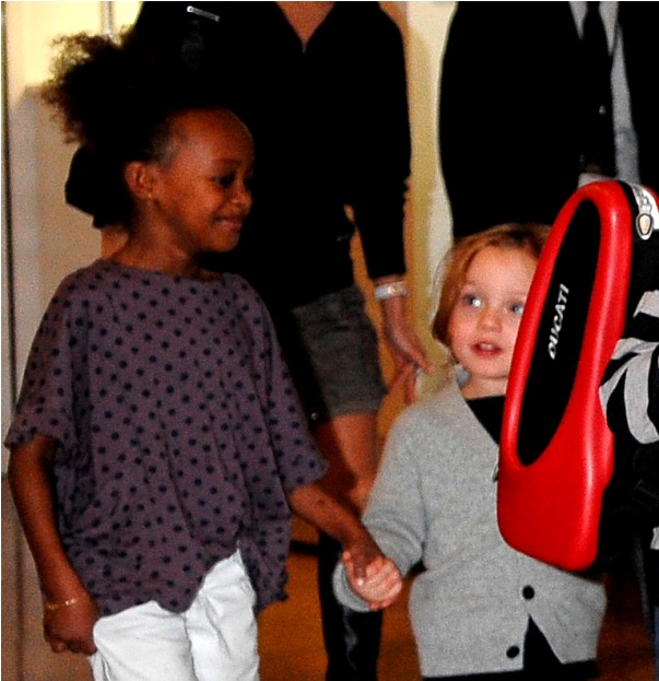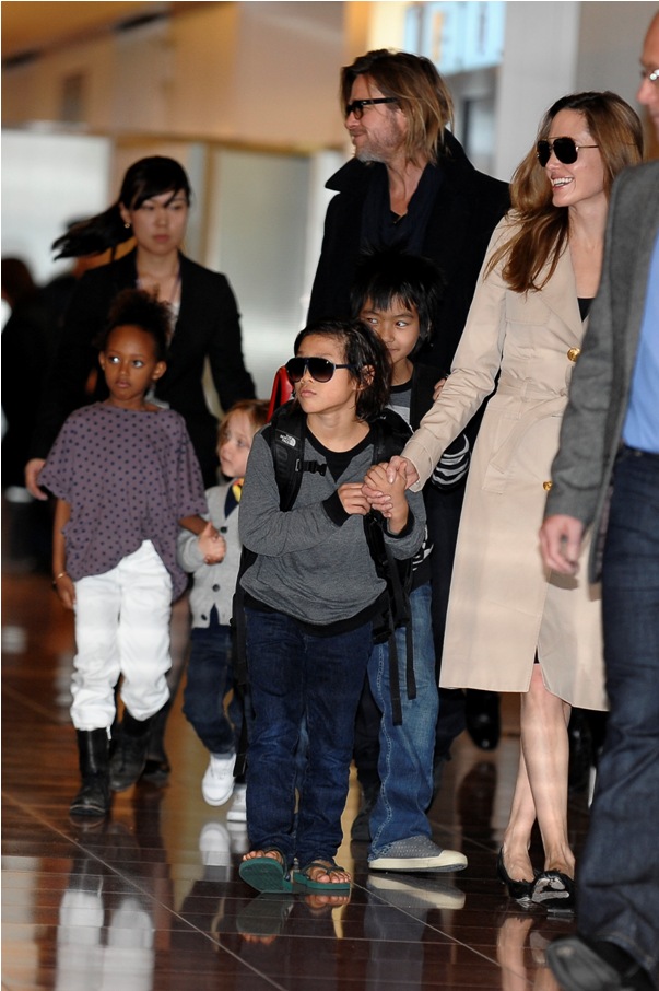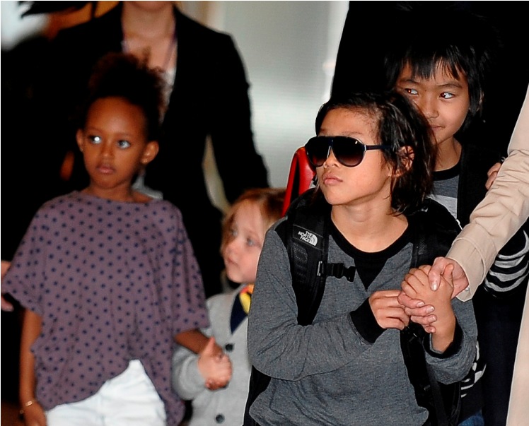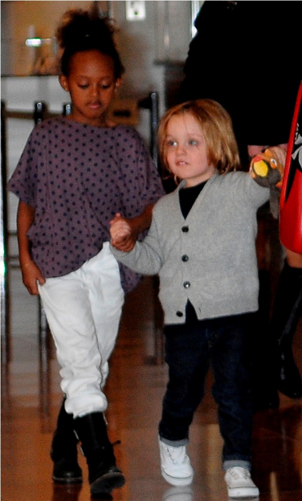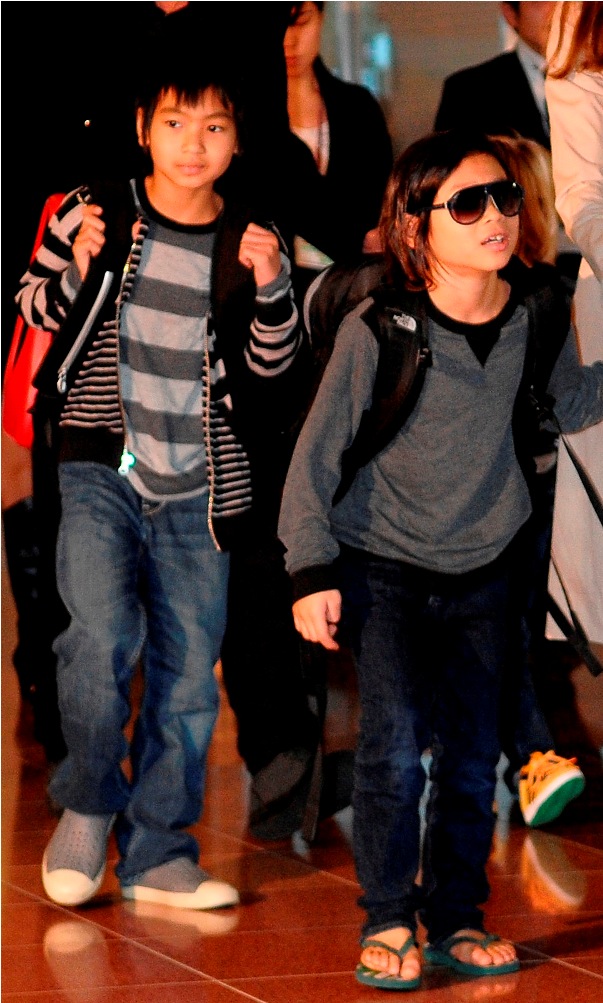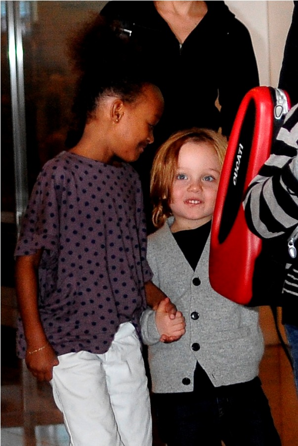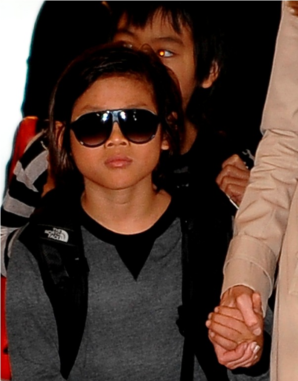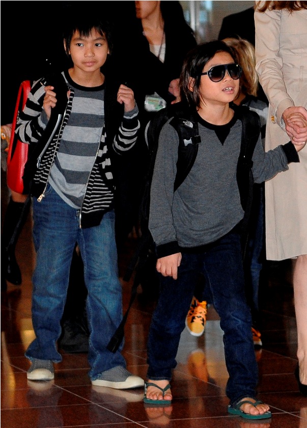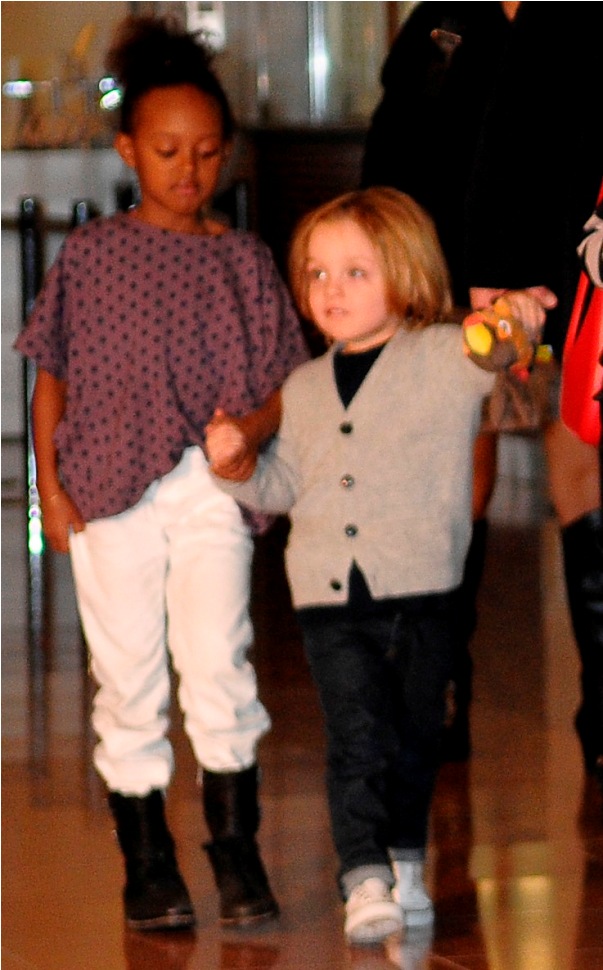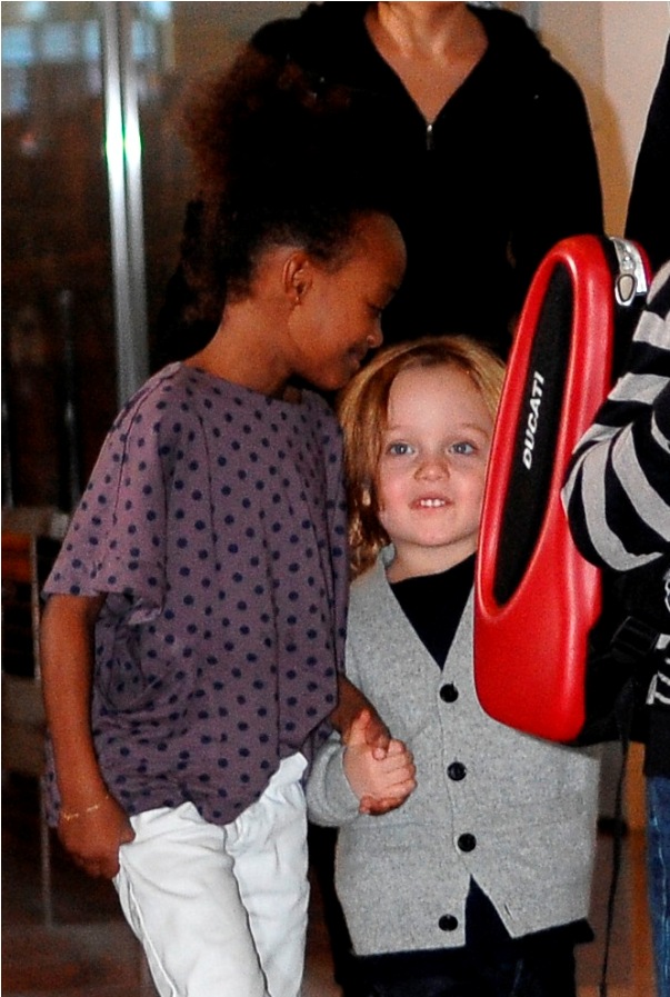 How much do I love that Pax is working the shades like his ma and pa? How much do I love that Miss Zahara and her brother Knox appear to be sharing some kind of inside joke? A lot!!! And the Chosen One, in a shirt that matches her big brother Maddox, and, also like Maddox, carrying a satchel that’s the size of her torso!? I like to think she mirrors him, worships him, and has her own sh-t she needs to schlep around. (Hand up, in Jolie’s face) Please don’t go in my bag, mom. It’s top secret.