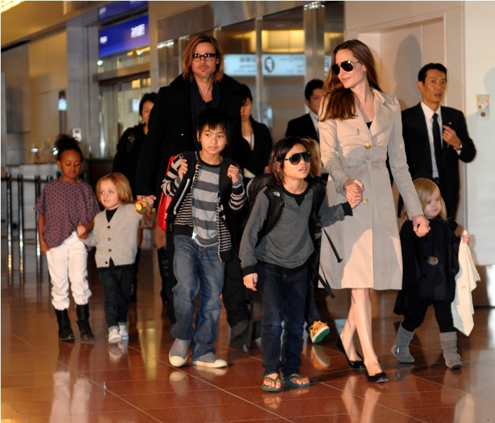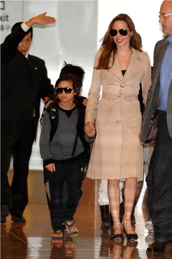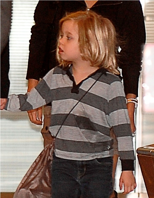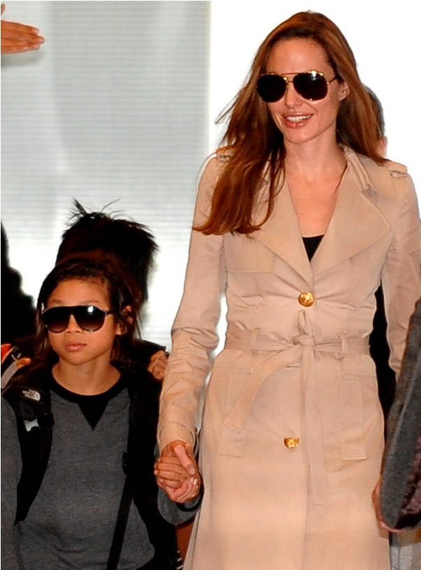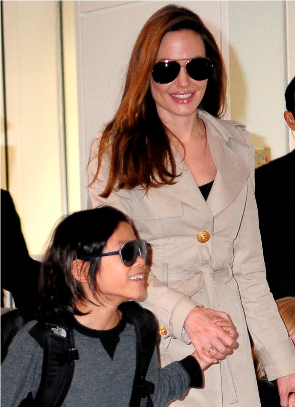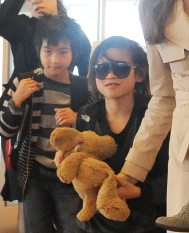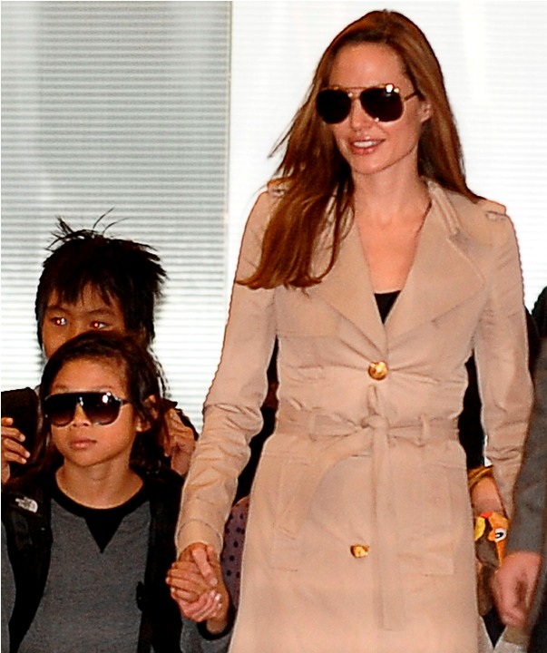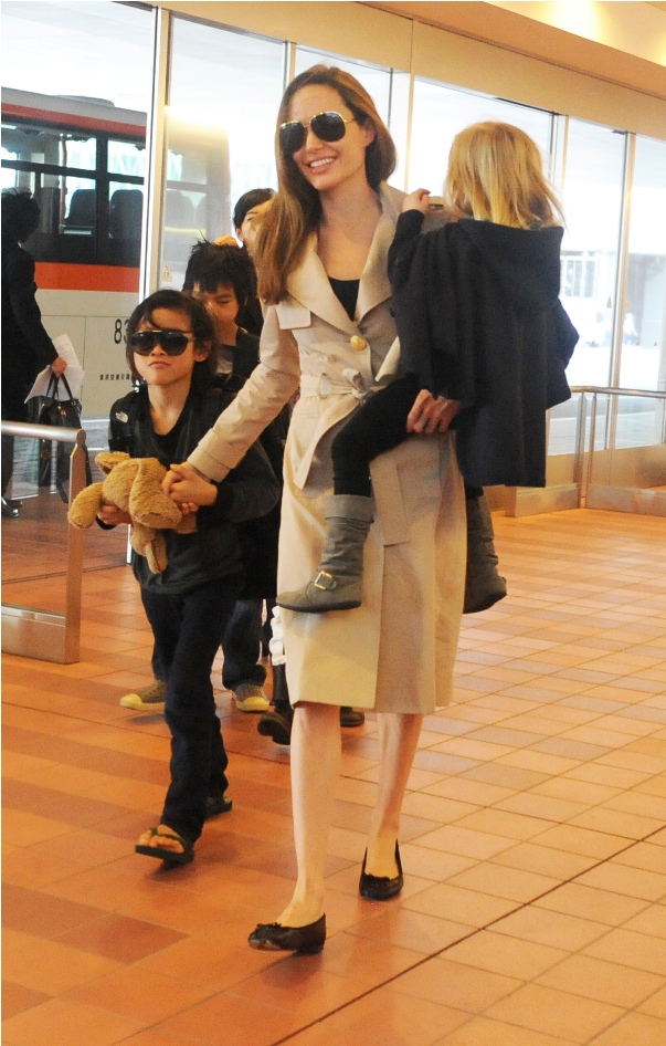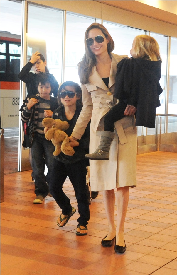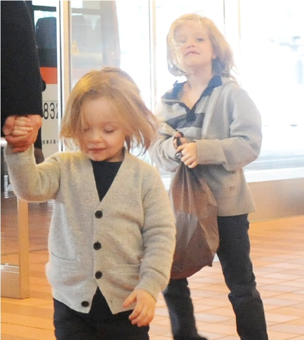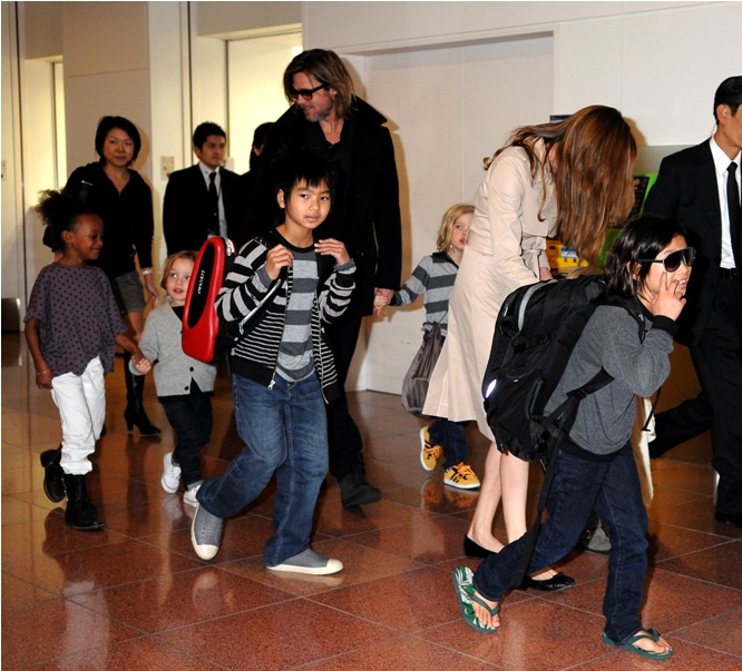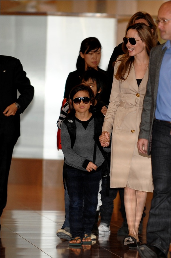 How much do I love that Pax is working the shades like his ma and pa? How much do I love that Miss Zahara and her brother Knox appear to be sharing some kind of inside joke? A lot!!! And the Chosen One, in a shirt that matches her big brother Maddox, and, also like Maddox, carrying a satchel that’s the size of her torso!? I like to think she mirrors him, worships him, and has her own sh-t she needs to schlep around. (Hand up, in Jolie’s face) Please don’t go in my bag, mom. It’s top secret.