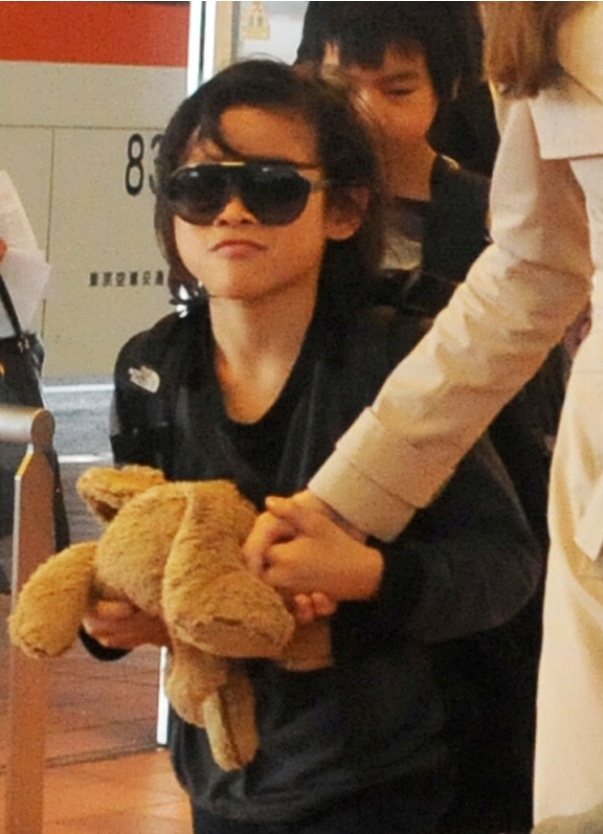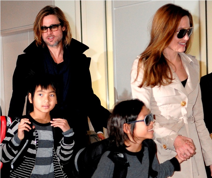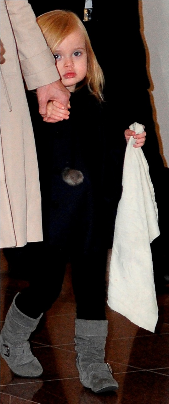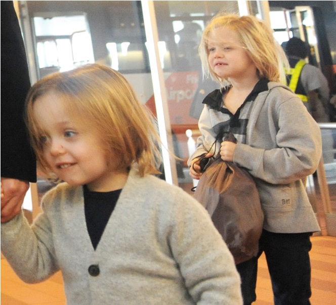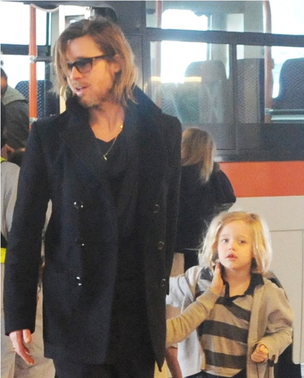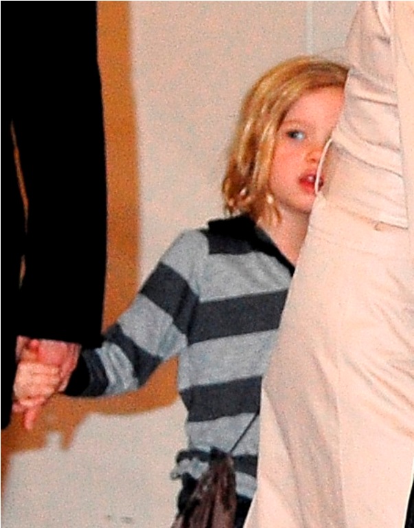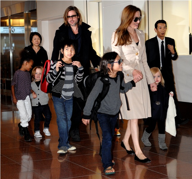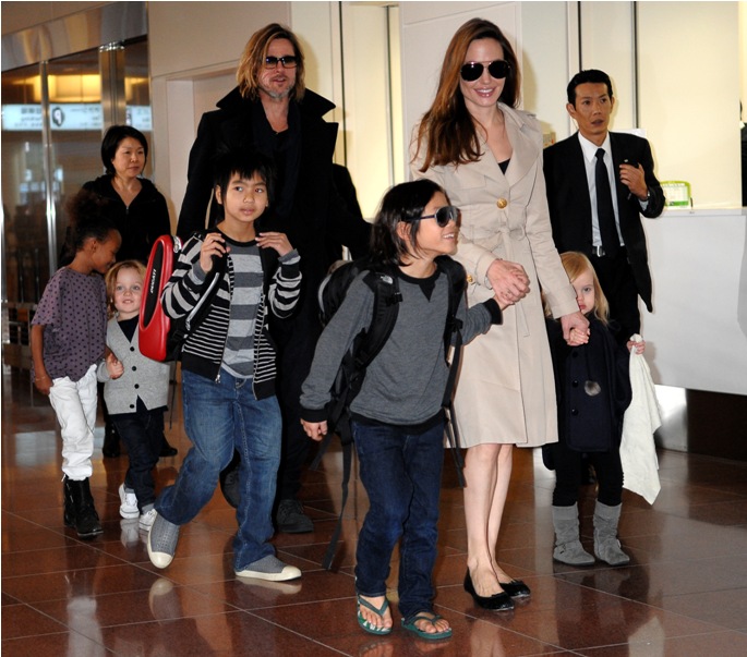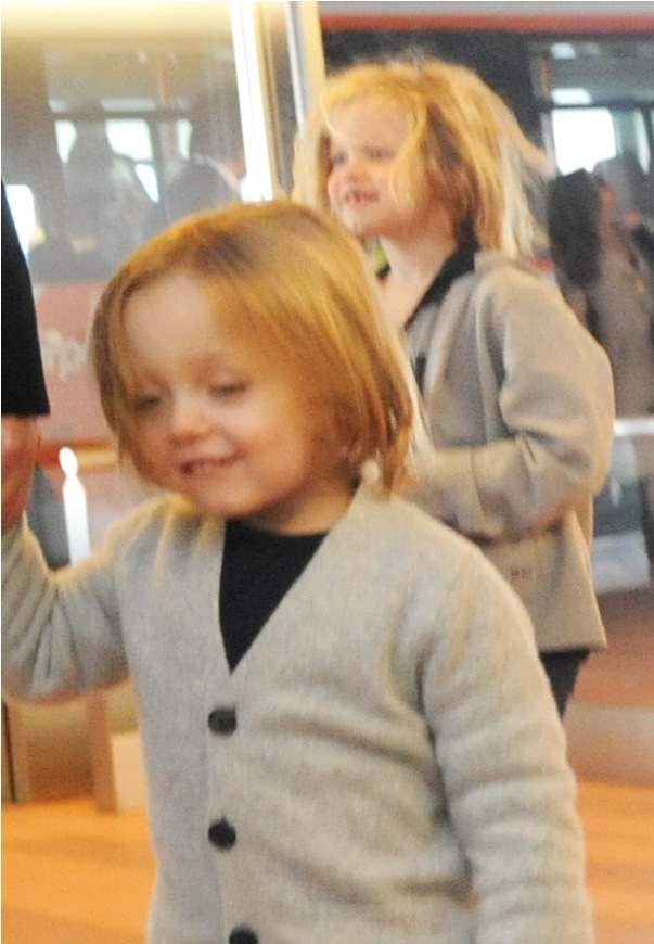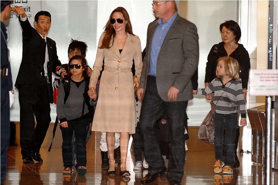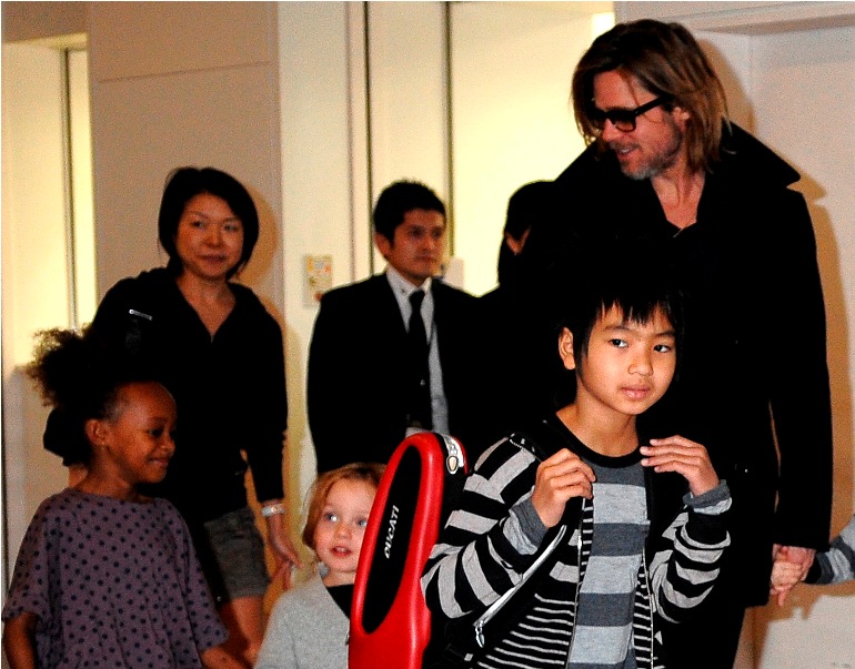 How much do I love that Pax is working the shades like his ma and pa? How much do I love that Miss Zahara and her brother Knox appear to be sharing some kind of inside joke? A lot!!! And the Chosen One, in a shirt that matches her big brother Maddox, and, also like Maddox, carrying a satchel that’s the size of her torso!? I like to think she mirrors him, worships him, and has her own sh-t she needs to schlep around. (Hand up, in Jolie’s face) Please don’t go in my bag, mom. It’s top secret.
