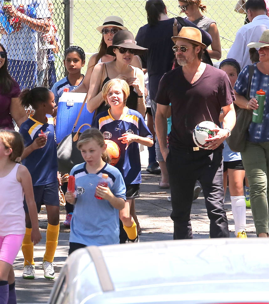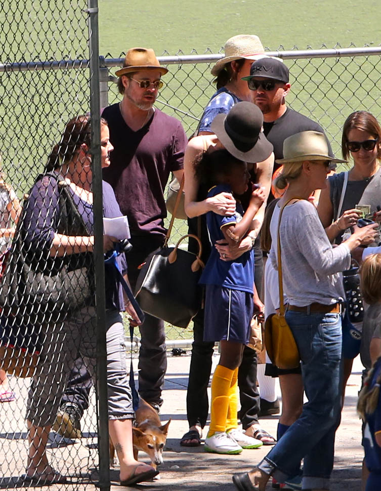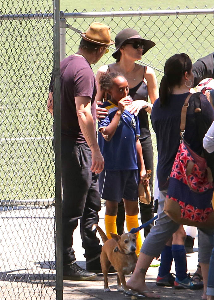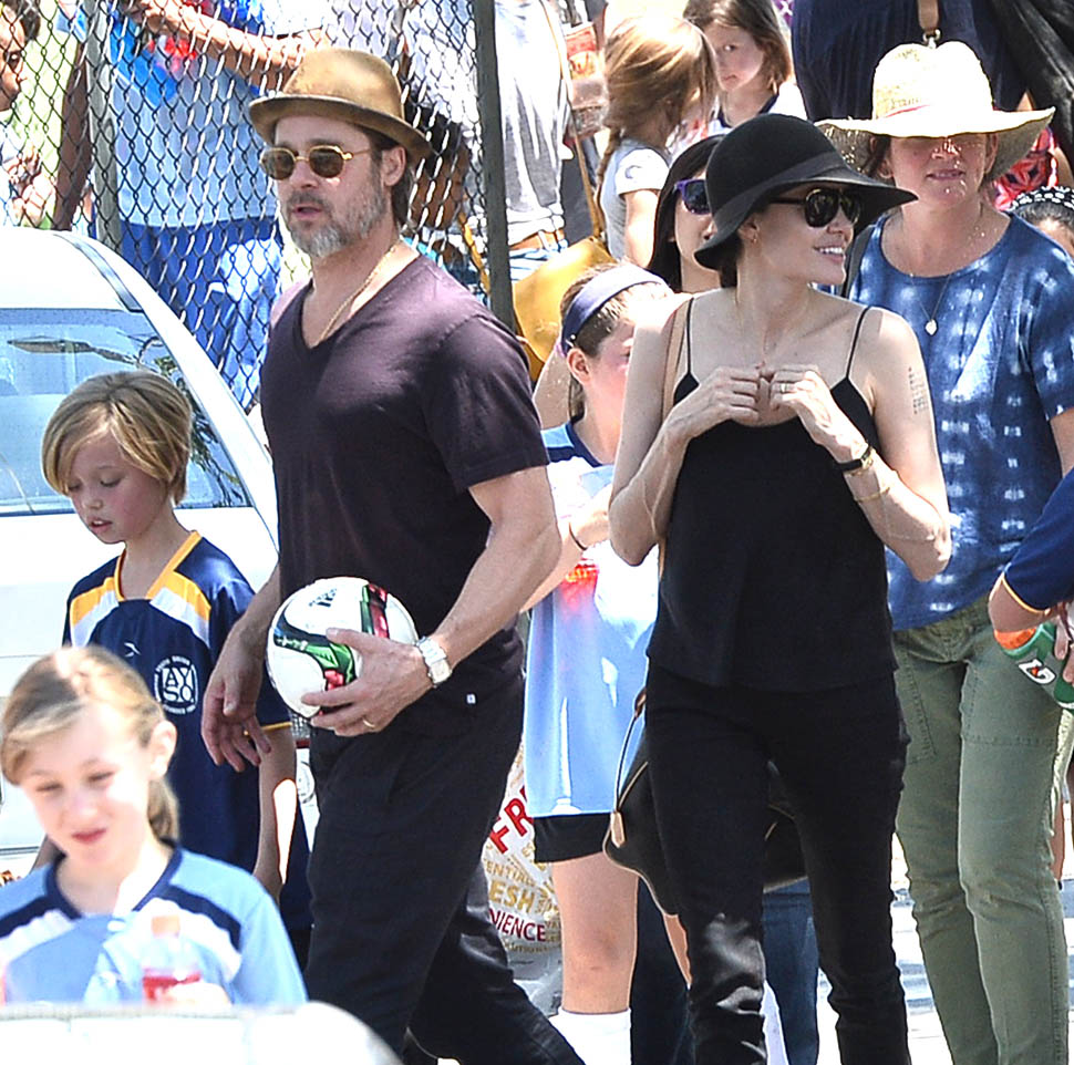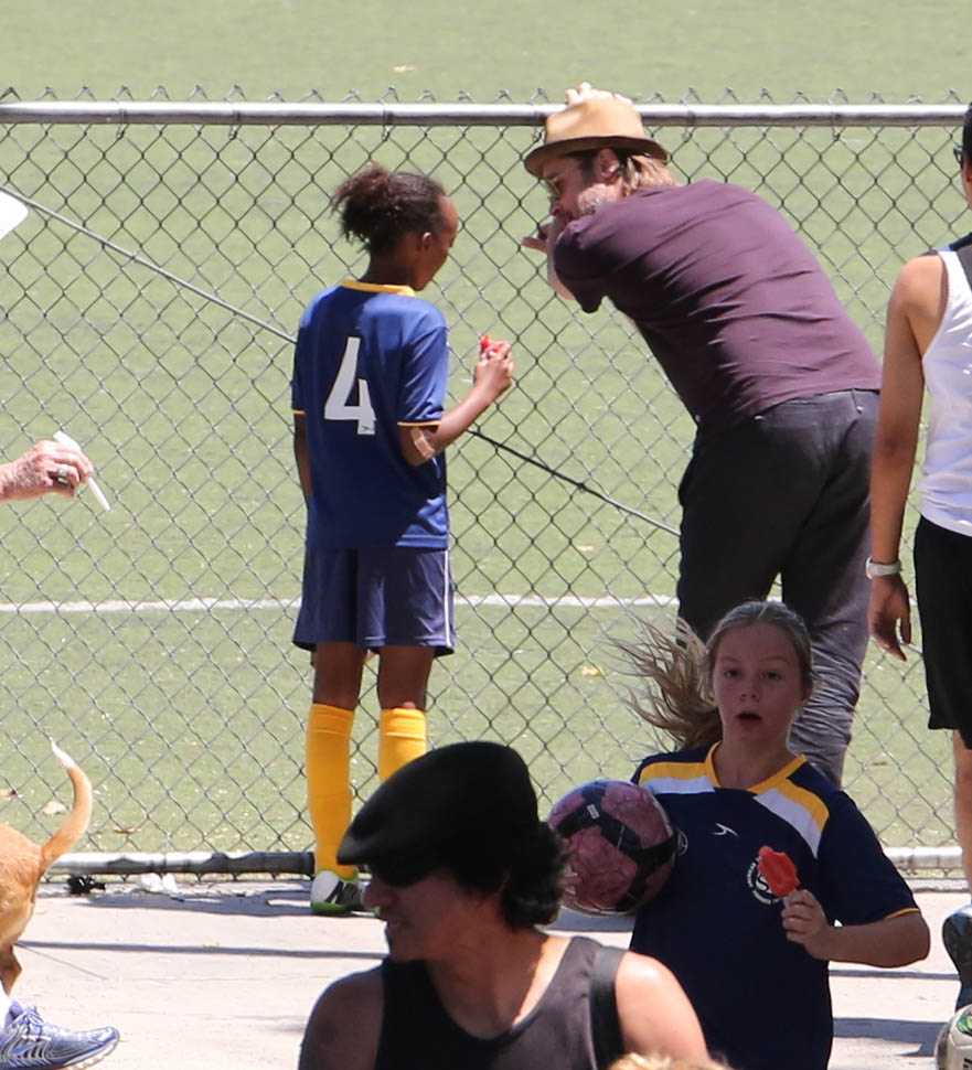 The MET Gala is questionable but the little league soccer game with her daughters is totally on-brand. We saw this for the first time in March. And it happened again this weekend – Angelina and Brad Pitt with Miss Zahara and Shiloh the Chosen on Saturday, just like all the other parents (with security carefully blending in or out of the shots).