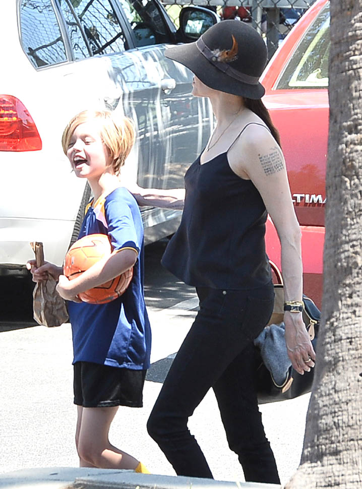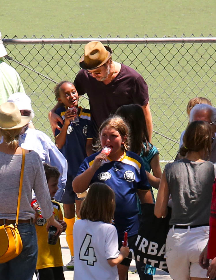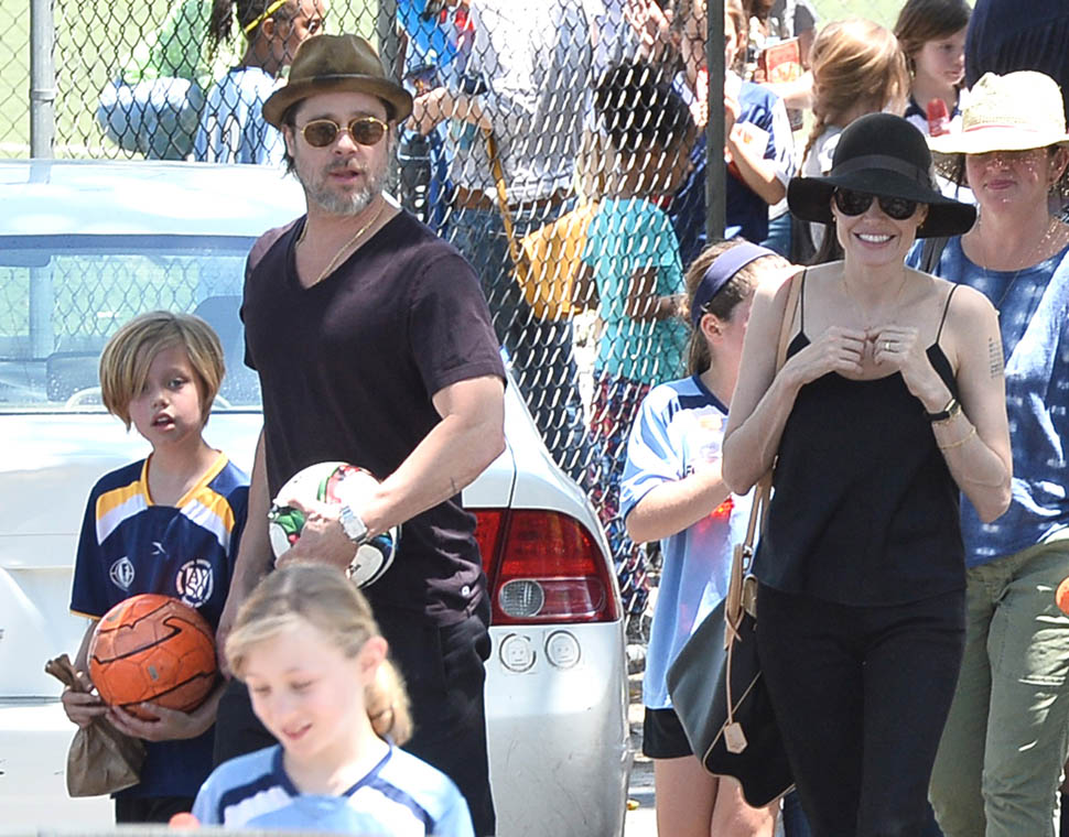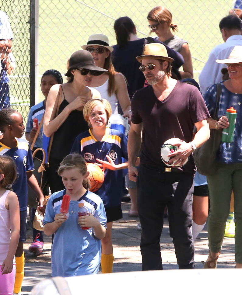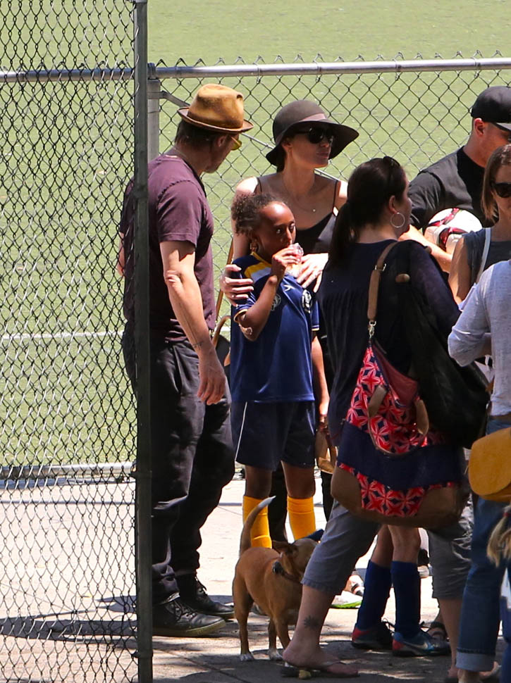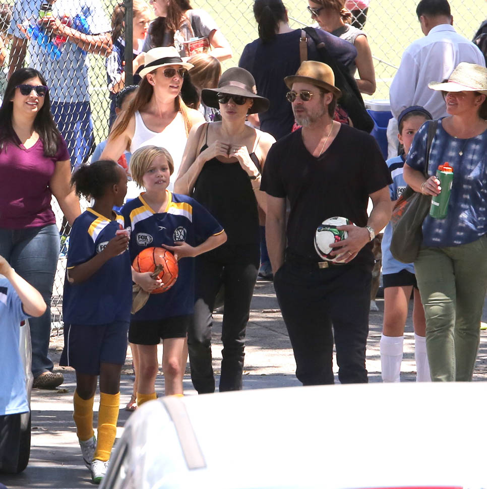 The MET Gala is questionable but the little league soccer game with her daughters is totally on-brand. We saw this for the first time in March. And it happened again this weekend – Angelina and Brad Pitt with Miss Zahara and Shiloh the Chosen on Saturday, just like all the other parents (with security carefully blending in or out of the shots).
