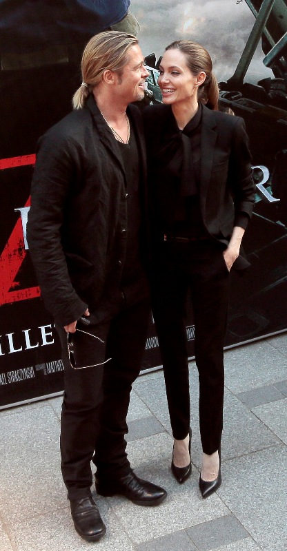 We might be getting Brange pictures every few days or so during this World War Z press tour. After the premiere in London on Sunday, Brange was in Paris last night to promote the movie. I heard there was no junket for this film which was why there was such a high concentration of media -- even more so than usual -- for the UK event. And if that’s the case, if there really is no junket, these carpets become even more important for the marketing.