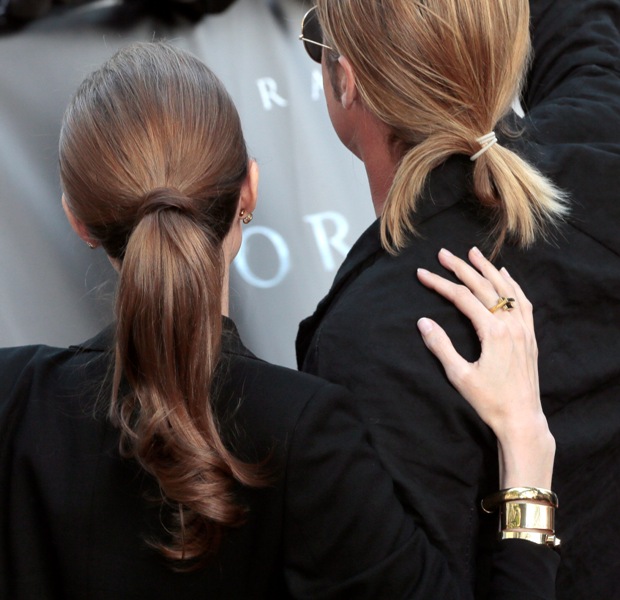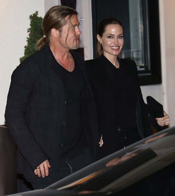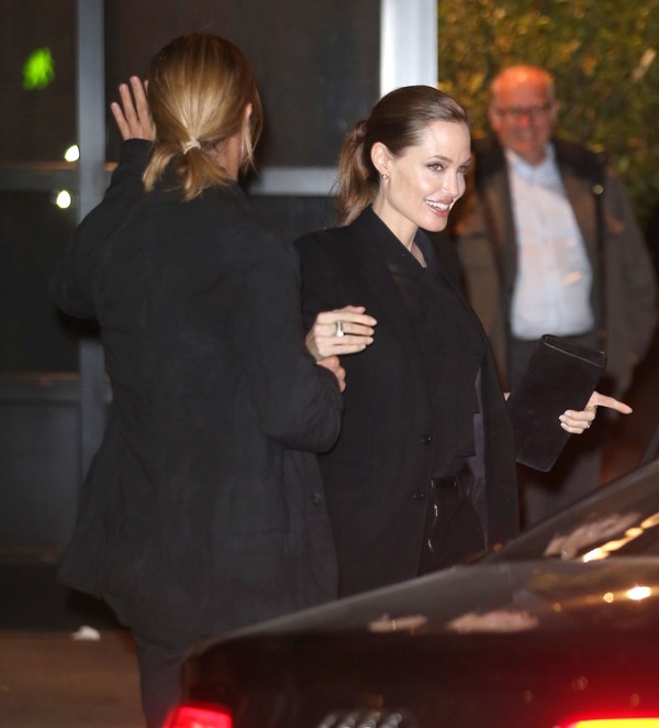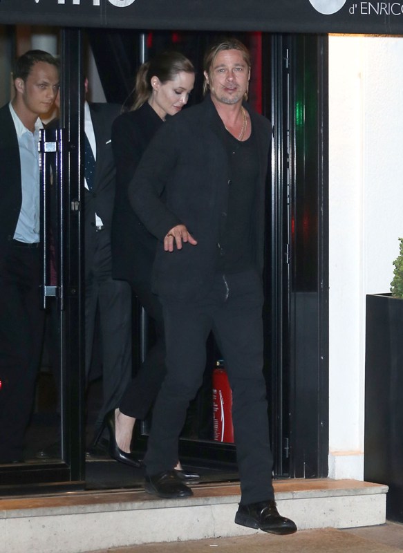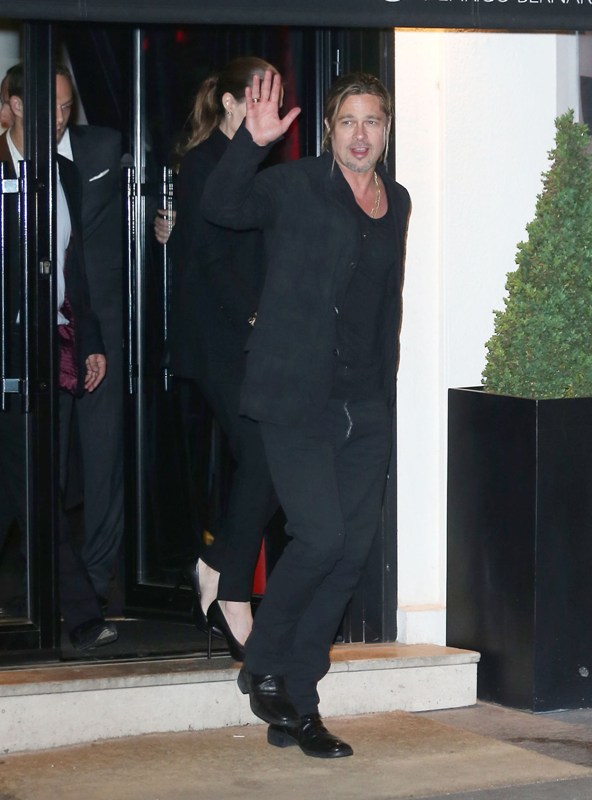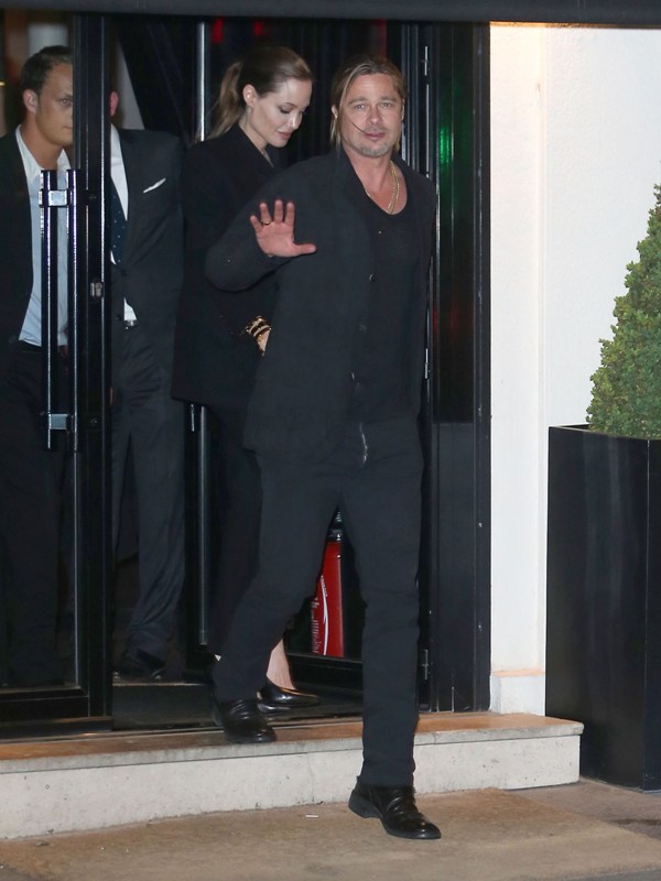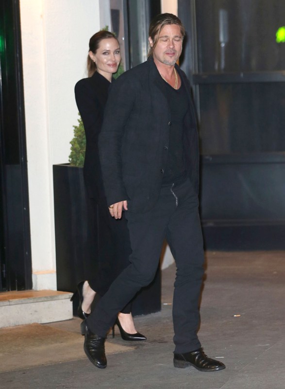 So here they are at work, Brad Pitt and Angelina Jolie, both in black. Her suit is custom Saint Laurent. It may be the best thing I’ve seen from Hedi Slimane since he took over. I love it. She looks so good in that fit. A little androgynous, and very, very stylish ...for a change. When was the last time we called the Jolie “stylish”? What’s especially brilliant about this outfit is that while it’s totally fashionable, at the same time it holds back to complement that amazing face. There it is, right? That crazy, ridiculously beautiful face.