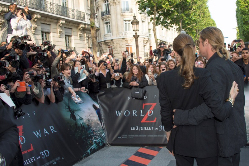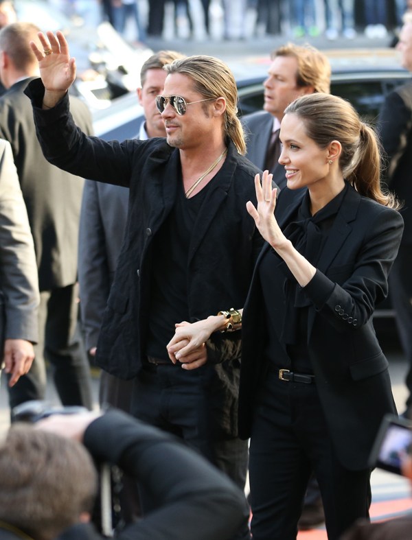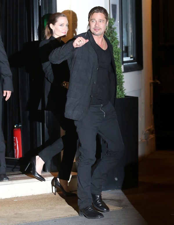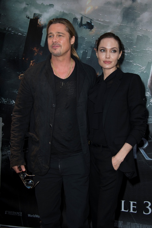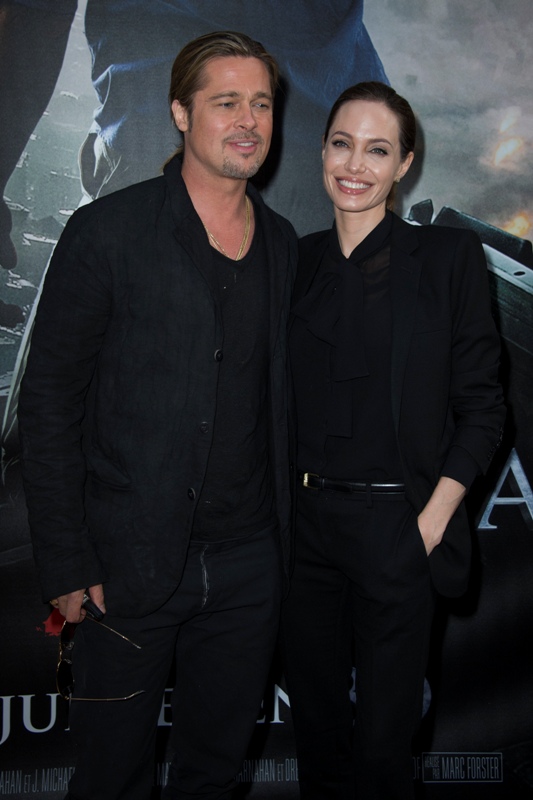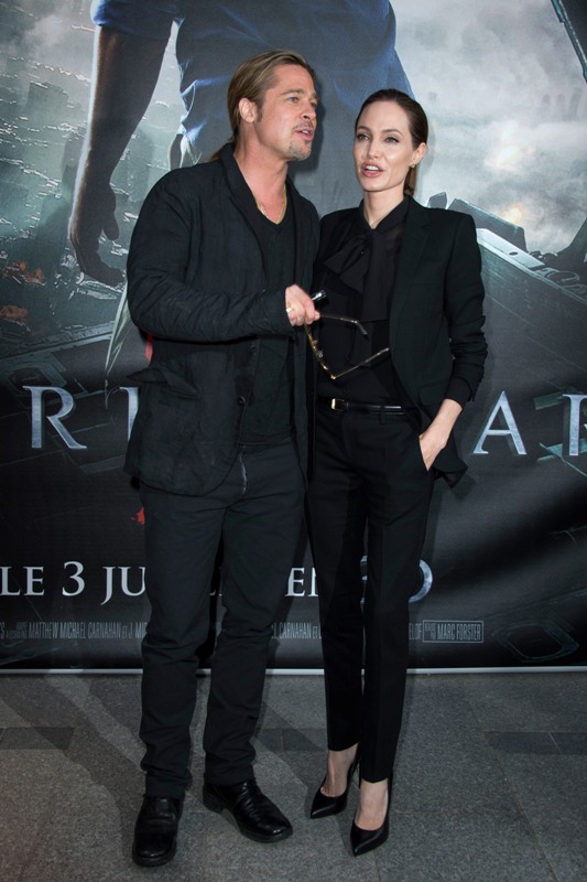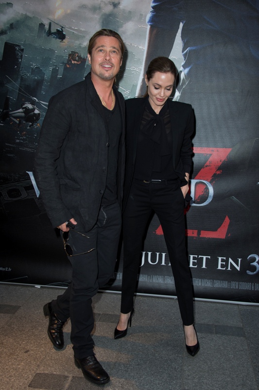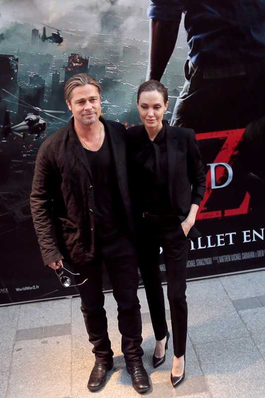 We might be getting Brange pictures every few days or so during this World War Z press tour. After the premiere in London on Sunday, Brange was in Paris last night to promote the movie. I heard there was no junket for this film which was why there was such a high concentration of media -- even more so than usual -- for the UK event. And if that’s the case, if there really is no junket, these carpets become even more important for the marketing.