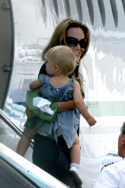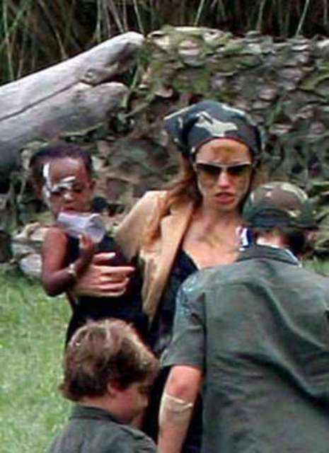 Angelina Jolie arrived holding the Chosen One to resume work on Wanted in Chicago but only after celebrating Maddox’s 6th birthday at the weekend dressed in camouflage with matching face paint. Am jealous. My parties always involved cheap Chinese relatives who made a habit of re-gifting lame presents. One year my cousin Cat and I both received globes. WTF???