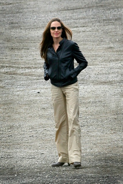 As for the family’s Chicago stay – apparently they’re ensconced in the same hotel and the same suite as Jennifer Aniston right after the split. See photo of Angelina on set on Tuesday in a black leather jacket. Those extensions actually looks pretty good. Why is it then that the twats in Hollywood can"t ever find some quality weave?