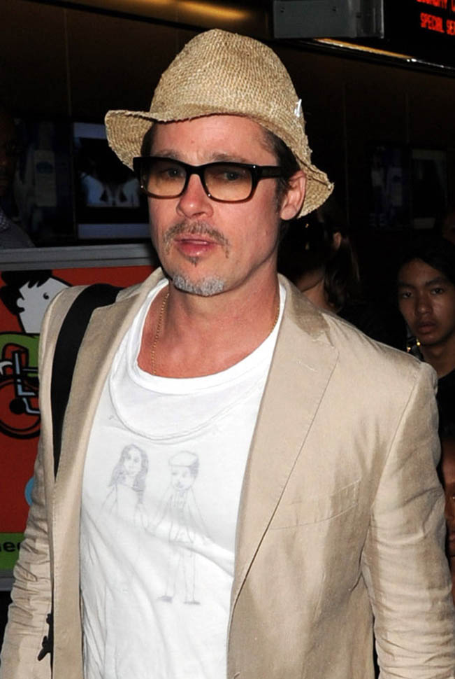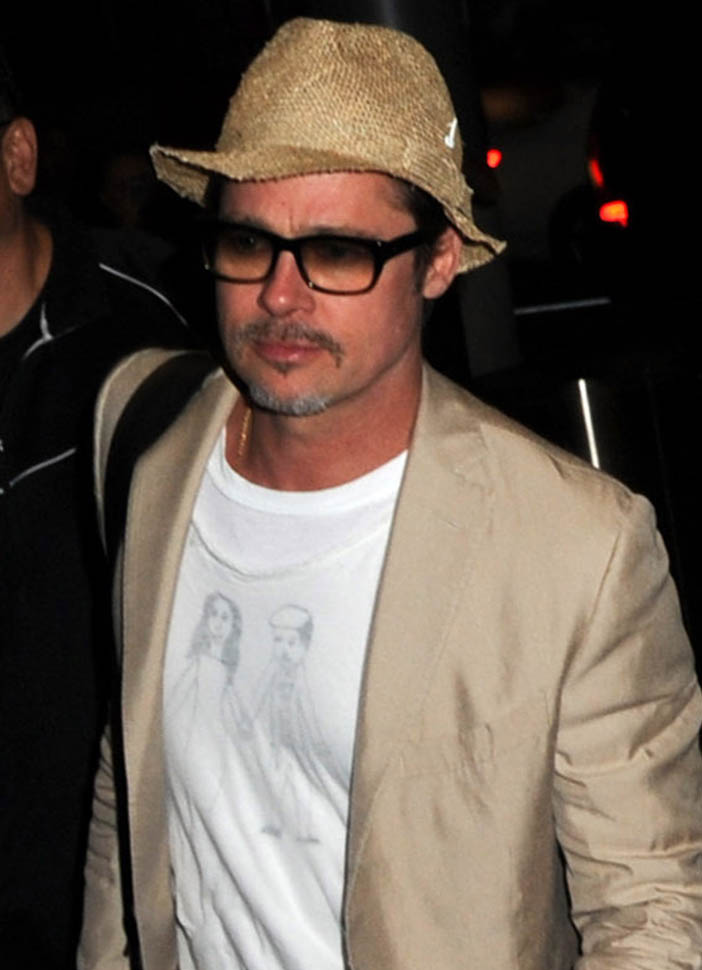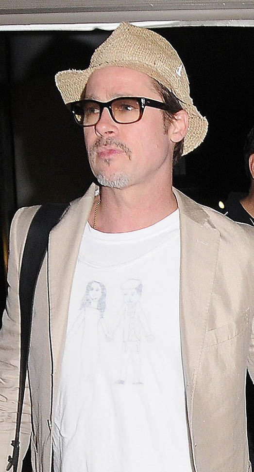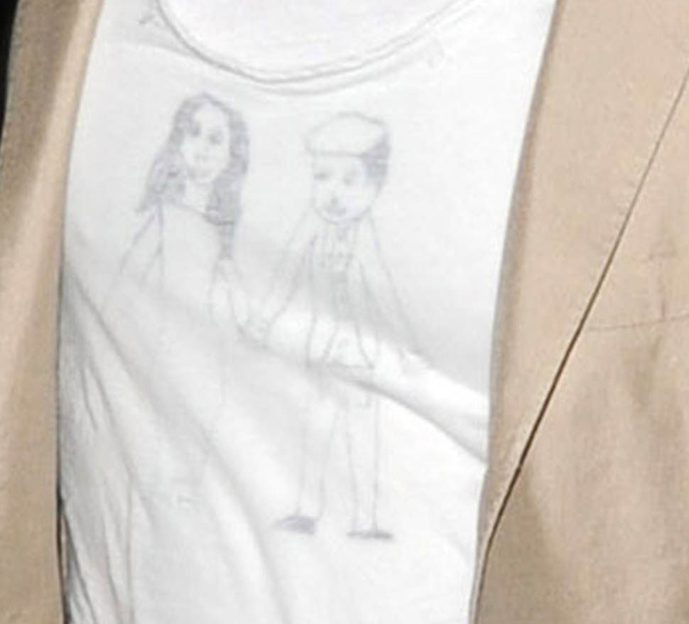 And Brad with his favourite outfit, his favourite pants, but this time with a special t-shirt. That looks like him in his pageboy cap. And I guess that’s Jolie standing beside him. And the speculation is that one of the Brange kids made this drawing. Now we have a new top contender for Father’s Day gift ideas.