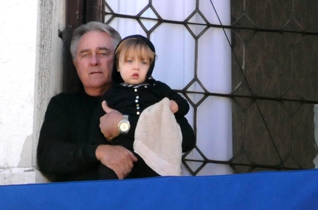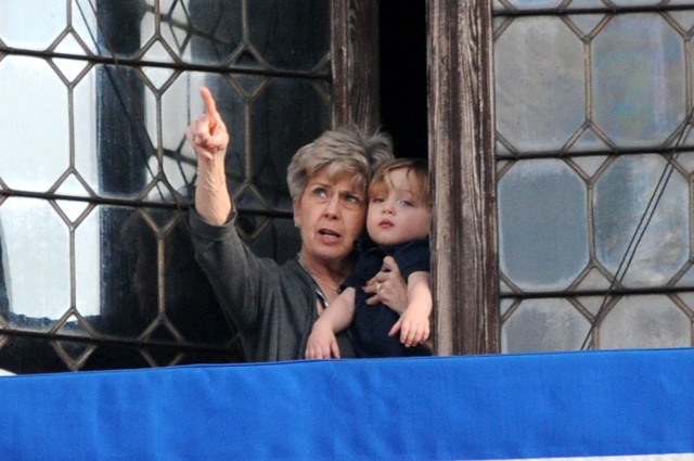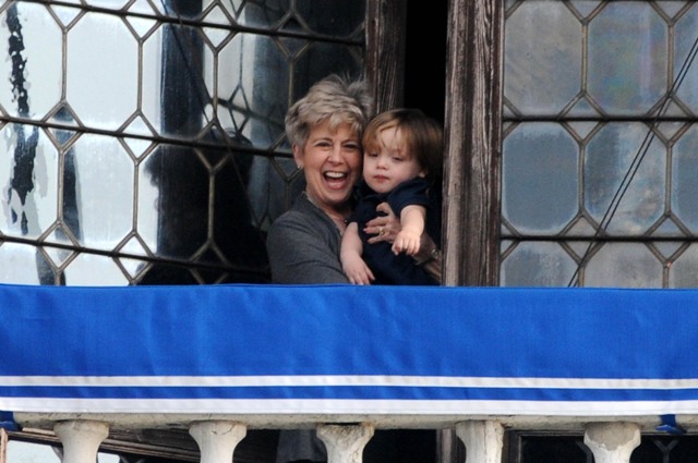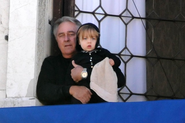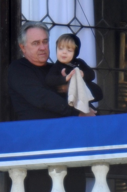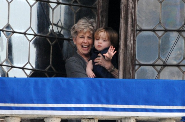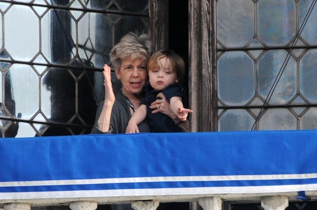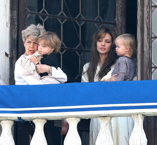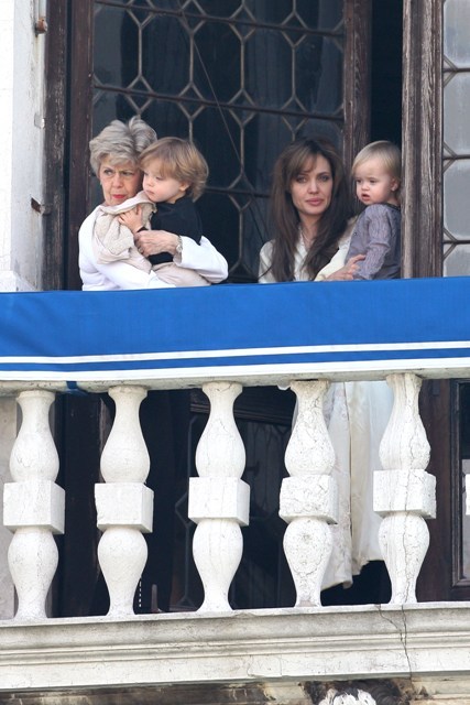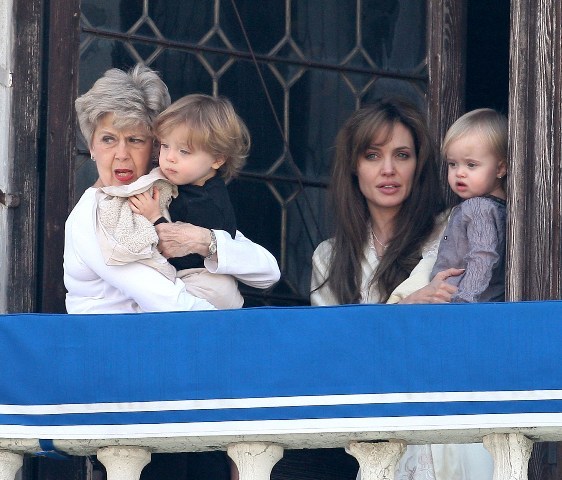 The Parent Pitts are in Venice. Apparently they were called in for babysitting duty on the Holy Twins while Brange took the other four to France for the weekend. Now everyone is at home, and Angie and Brad’s ma were photographed out with Vivienne and Knox Leon looking out at the peons. Angie looks like she just rolled out of bed. She had a night shoot with Depp on Tuesday. Am also attaching photos of KL with his grandparents from earlier this week. He really likes it out there. I really like his little heart shaped mouth. Or should I say their heart shaped mouth. Vivs has one too.