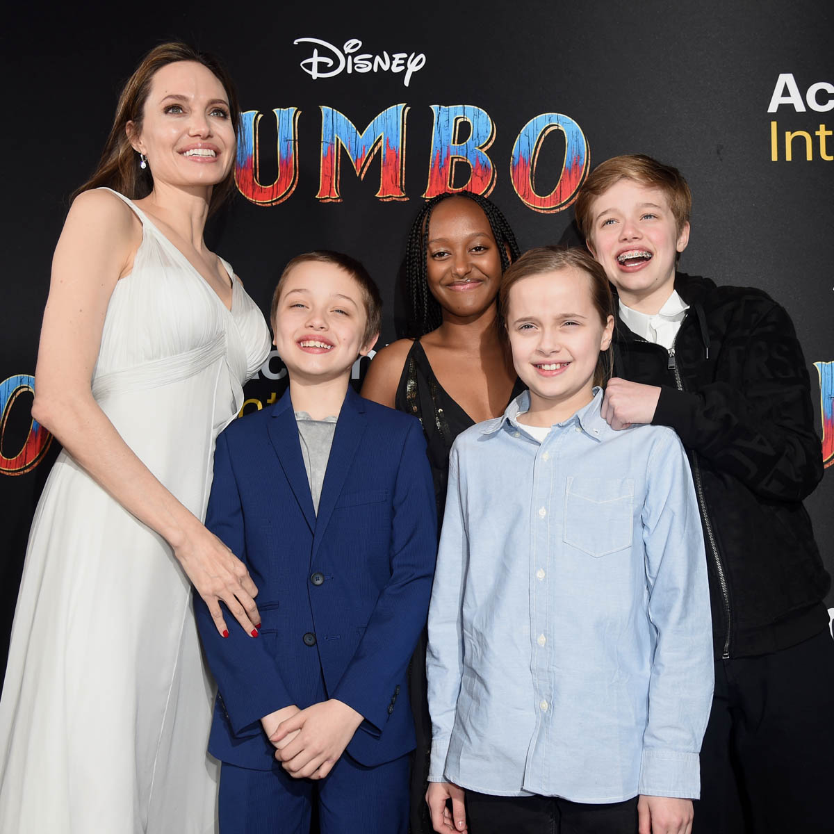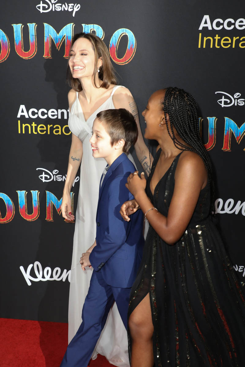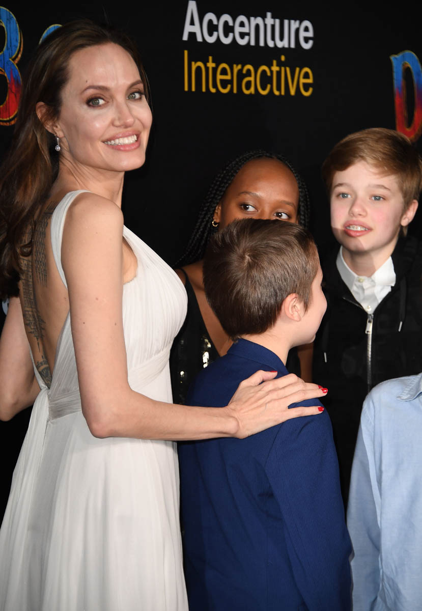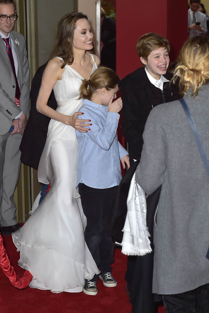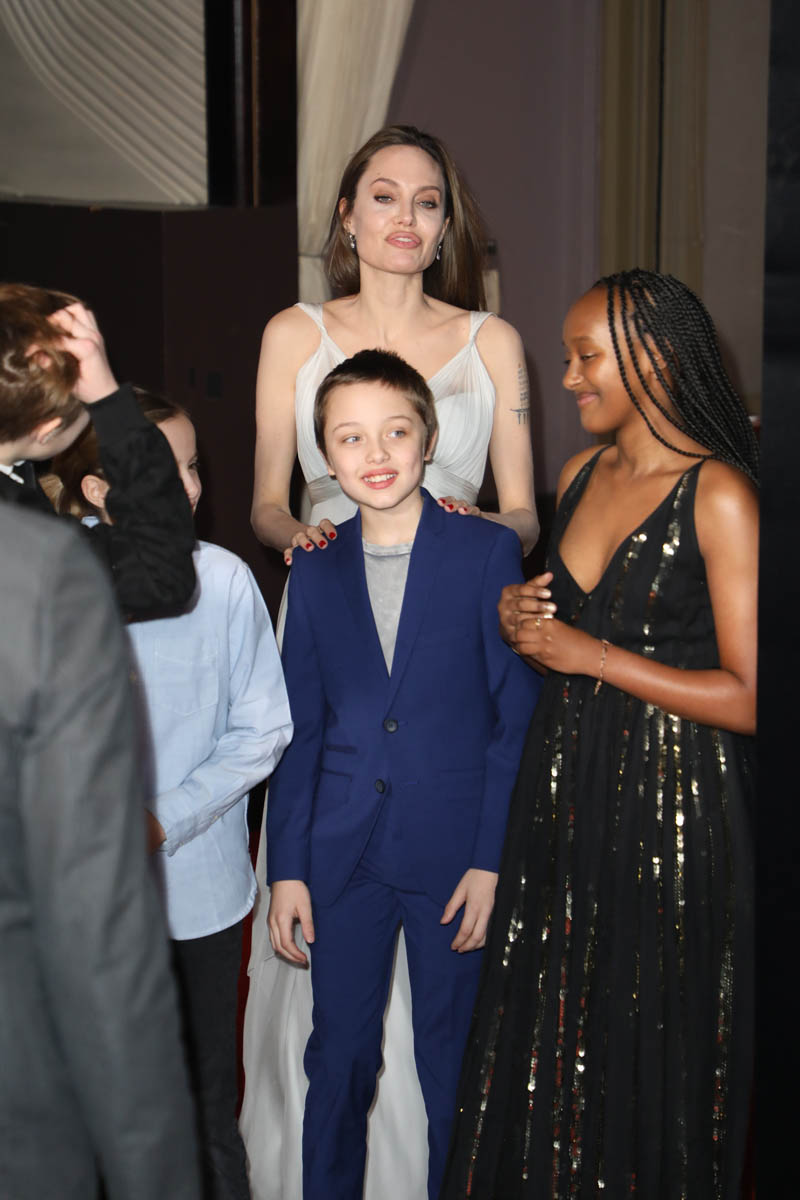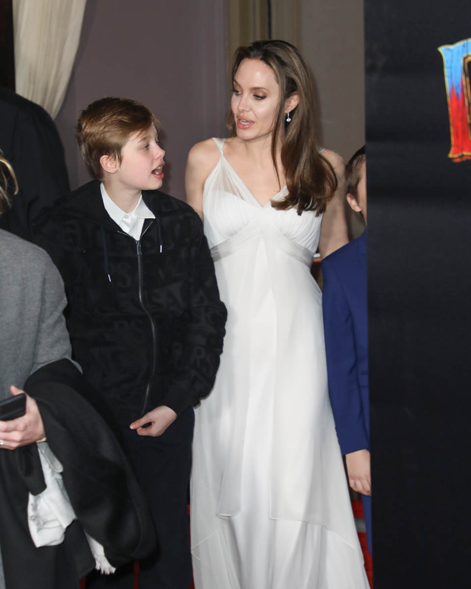 Anyway. Last night was the Hollywood premiere. And Angelina Jolie was there with Zahara, Shiloh, Vivienne, and Knox. She was the surprise guest, a Disney team player now because of Maleficent and, as you would expect, she was the main attraction. Which can’t be helped. Angelina doesn’t show up often on big splashy Hollywood red carpets. When she does, it’s a thing. This is what Disney would have wanted – extra shine on their new major release. And she delivered. I mean, she could have shown up in something black but she didn’t. She showed up in a slinky white grey gown, ready for the camera. But it wasn’t just for the photo opportunity.