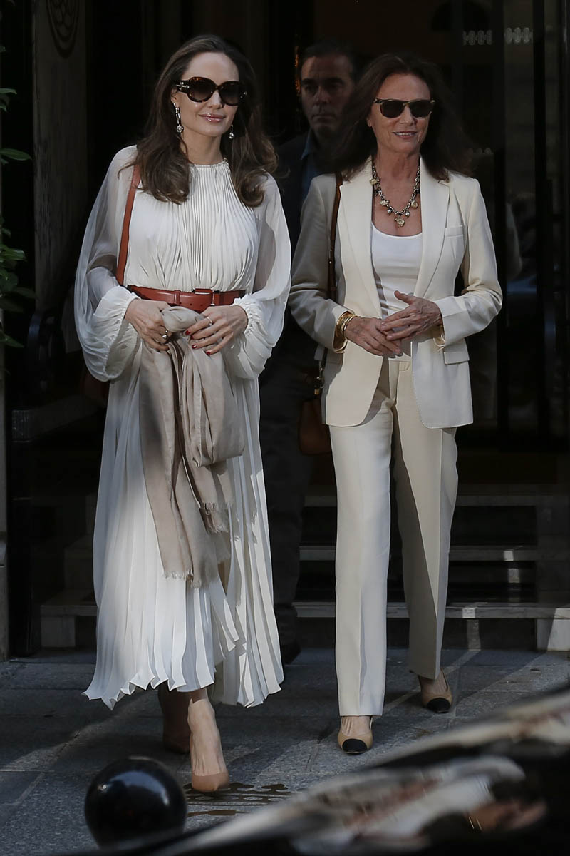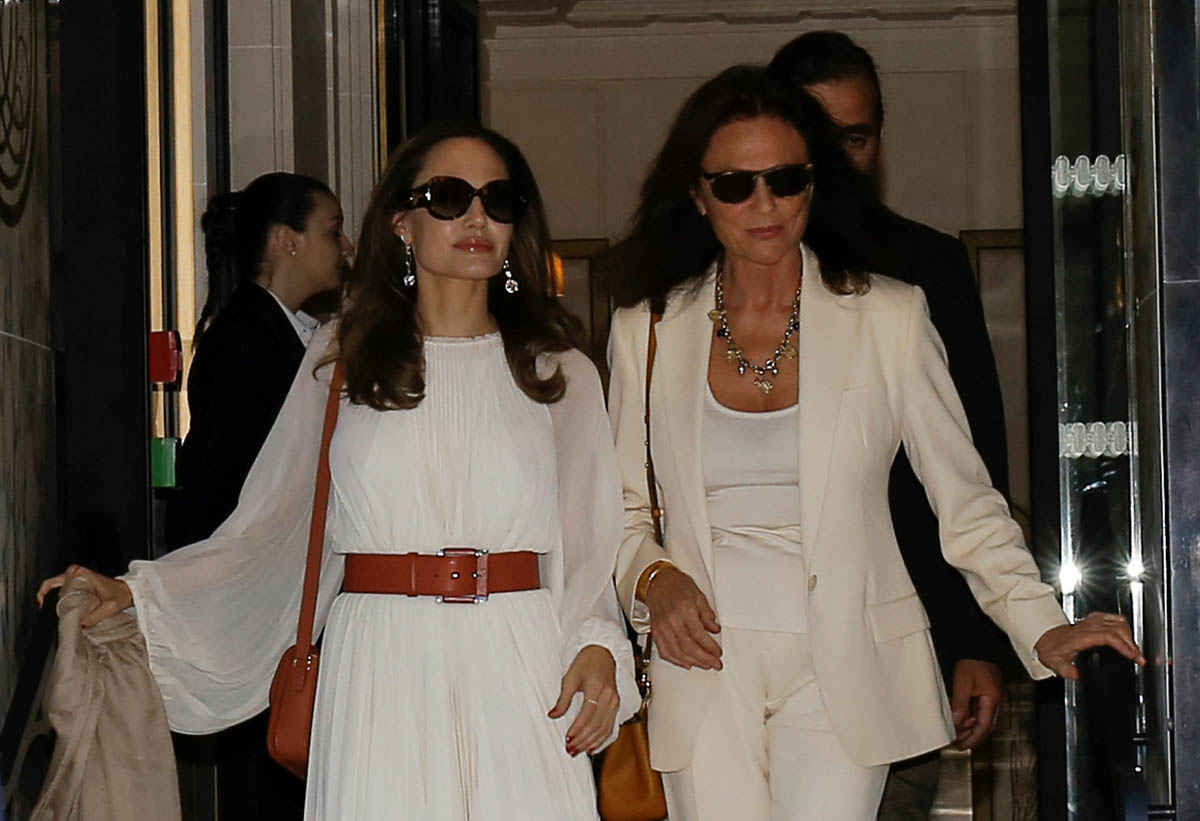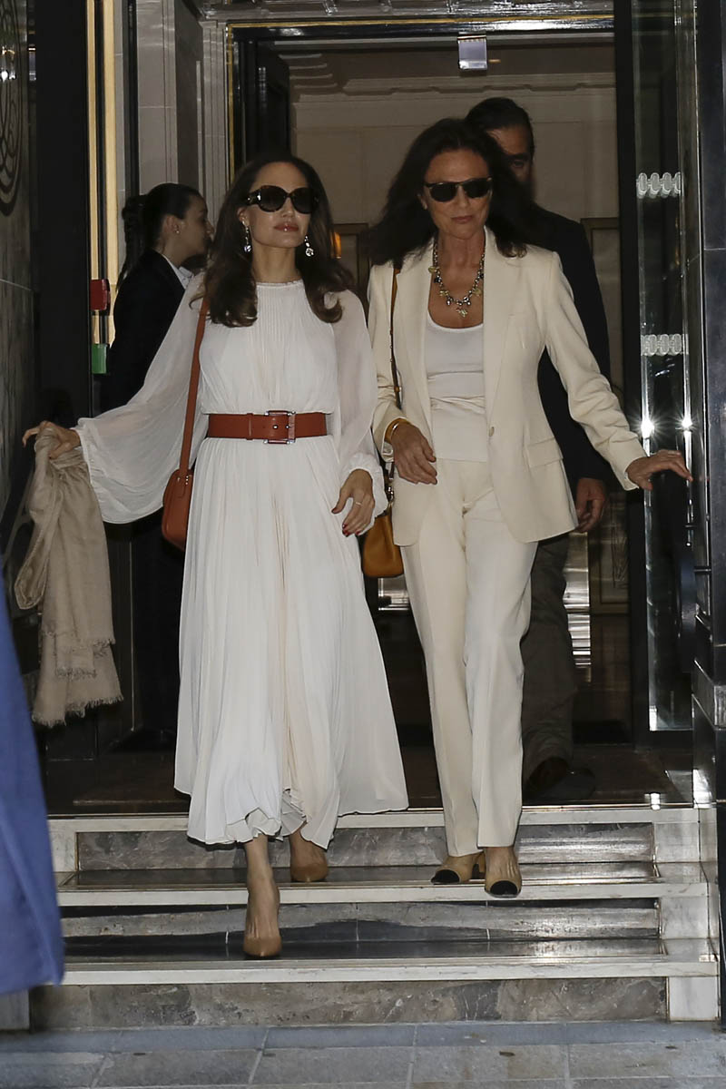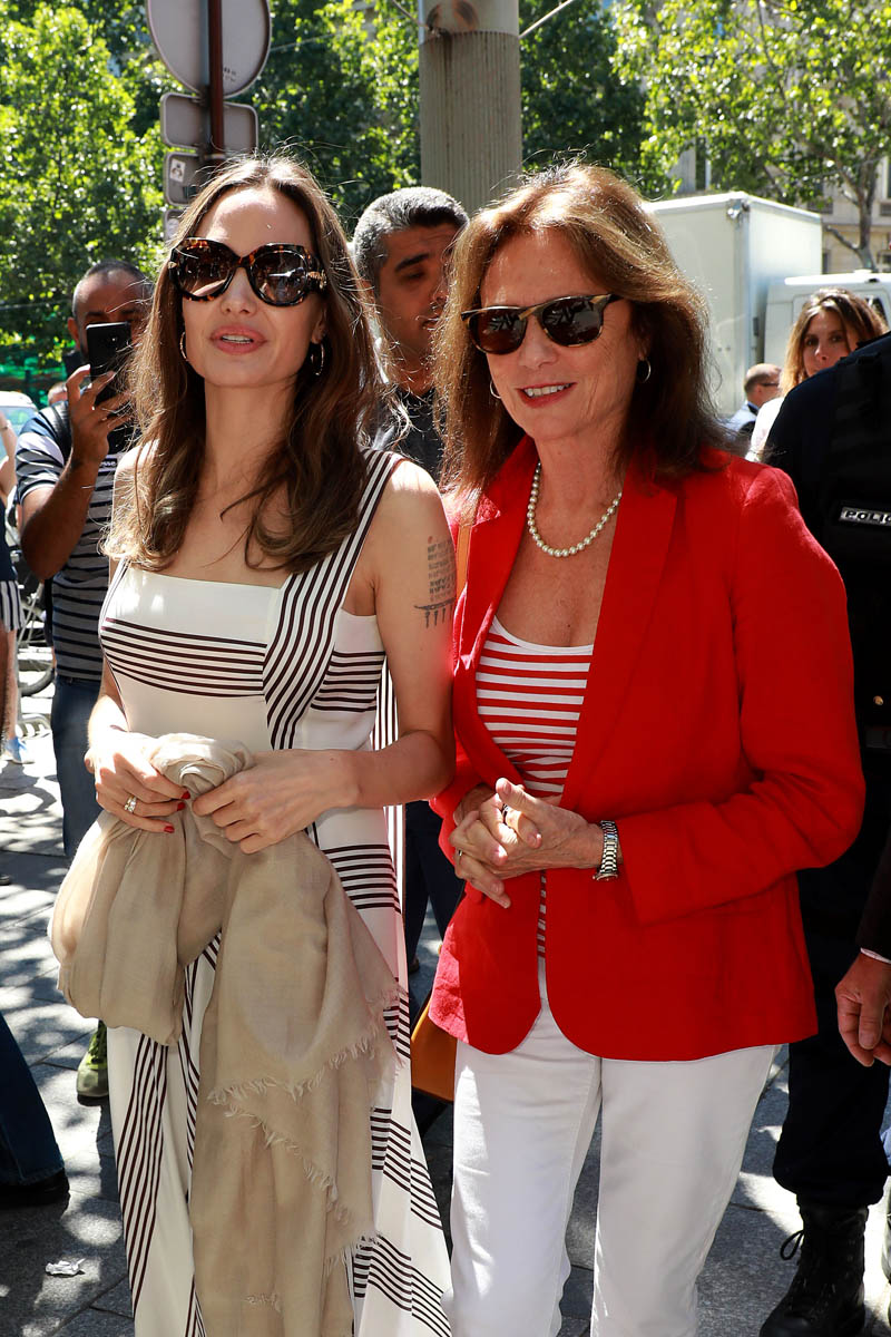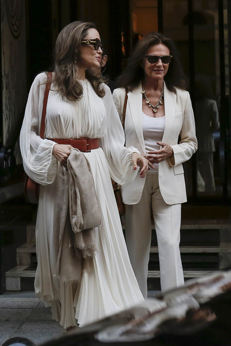 Angelina Jolie has been in Paris the last couple of days working with Guerlain. She is the brand ambassador and was seen yesterday shooting a new ad presumably for Mon Guerlain, the fragrance. Jacqueline Bisset is with her on the trip. They’ve been seen leaving the hotel together several times and today visited the Guerlain flagship, surrounded by photographers. Look at this scene:
