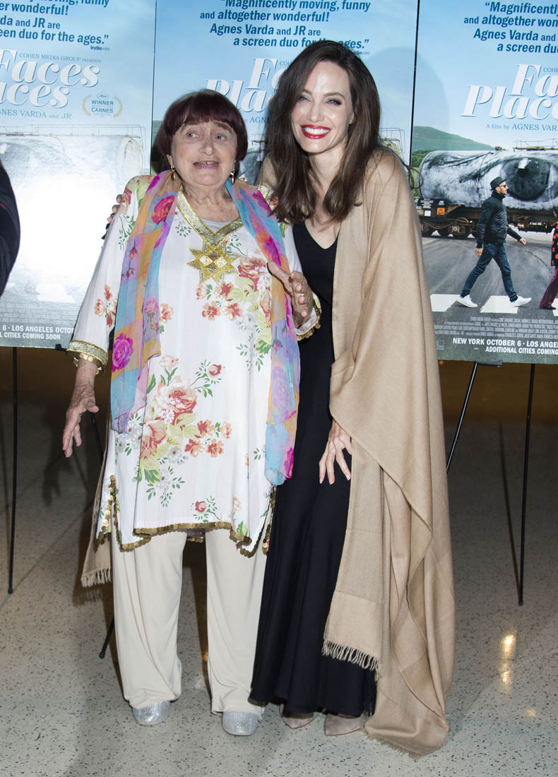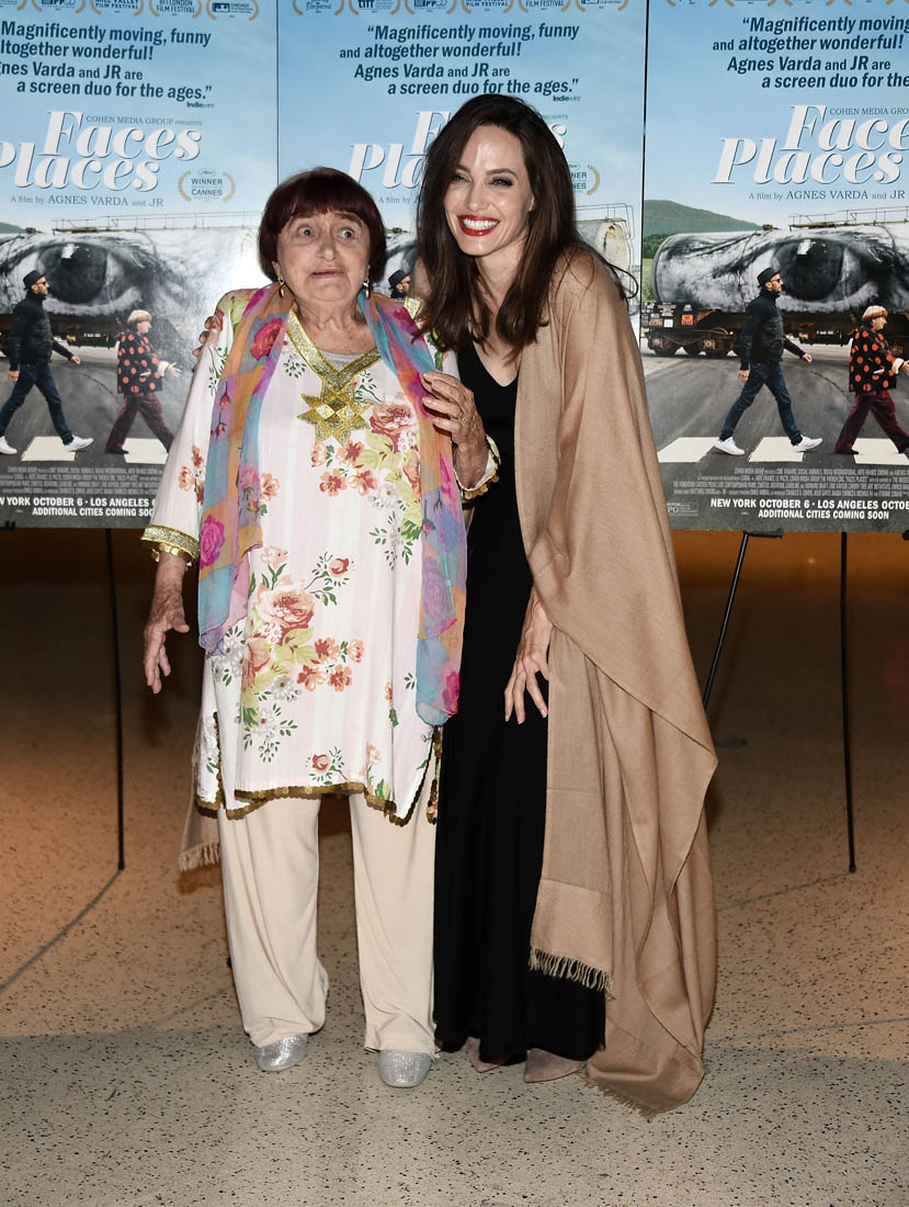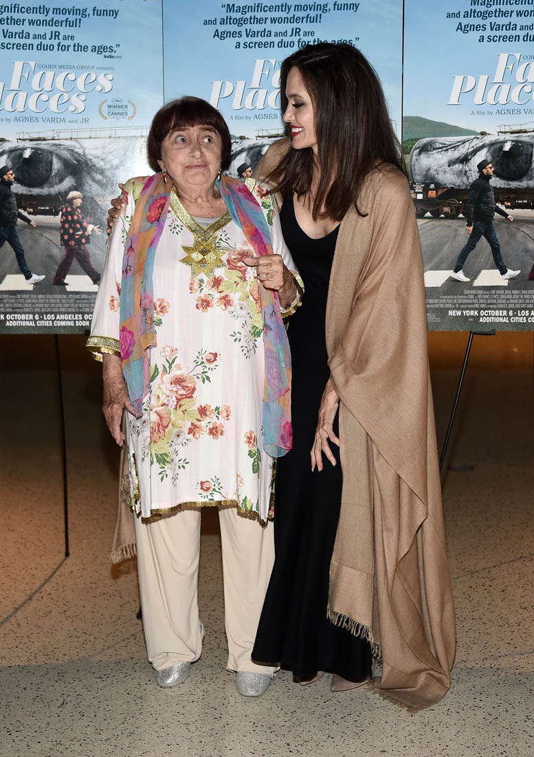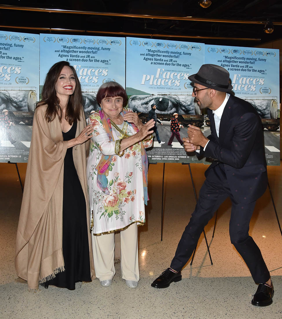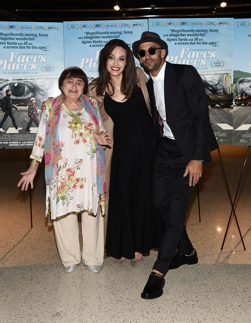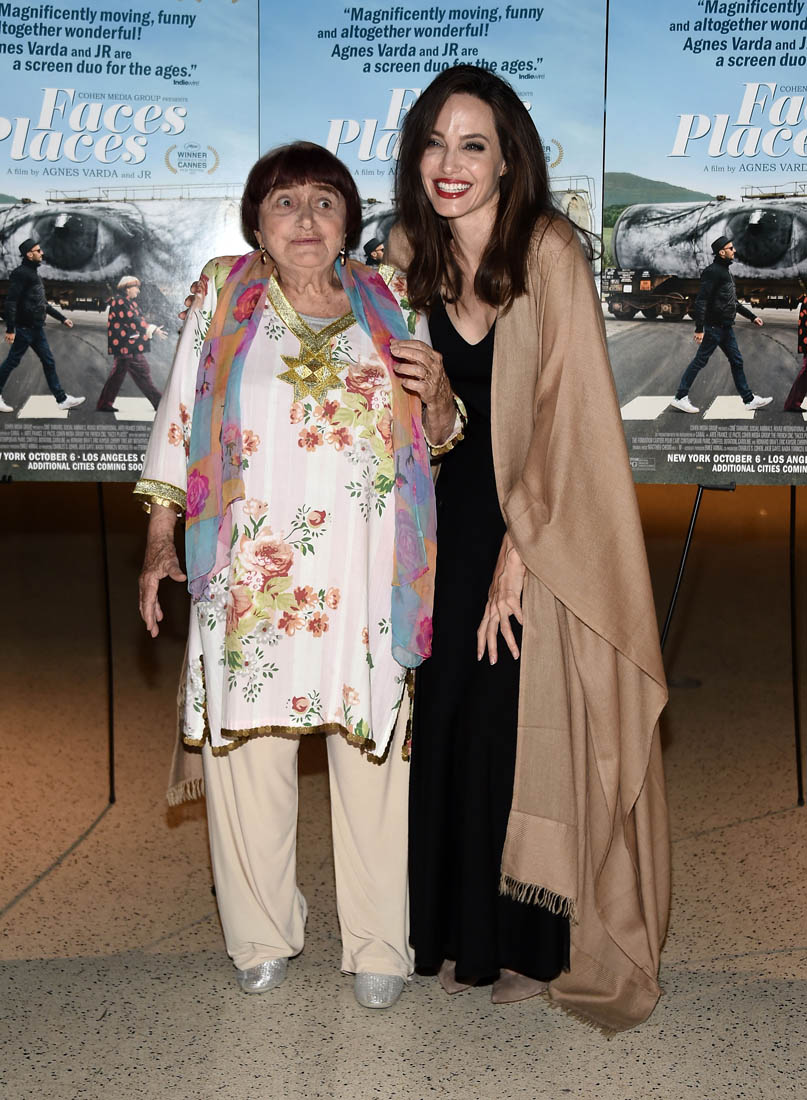 Both Angelina Jolie and Jennifer Lawrence were at the premiere of Faces Places last night in LA. Faces Places is an award-winning documentary directed by the acclaimed Agnes Varda and also JR. Angelina Jolie is very selective about the events she attends in Hollywood. Anytime she shows up anywhere it’s a story, the pictures get out there. The event gets a boost. I’m guessing here that’s she’s there out of respect for Agnes Varda, as you can see from the deference she’s showing in these photos.