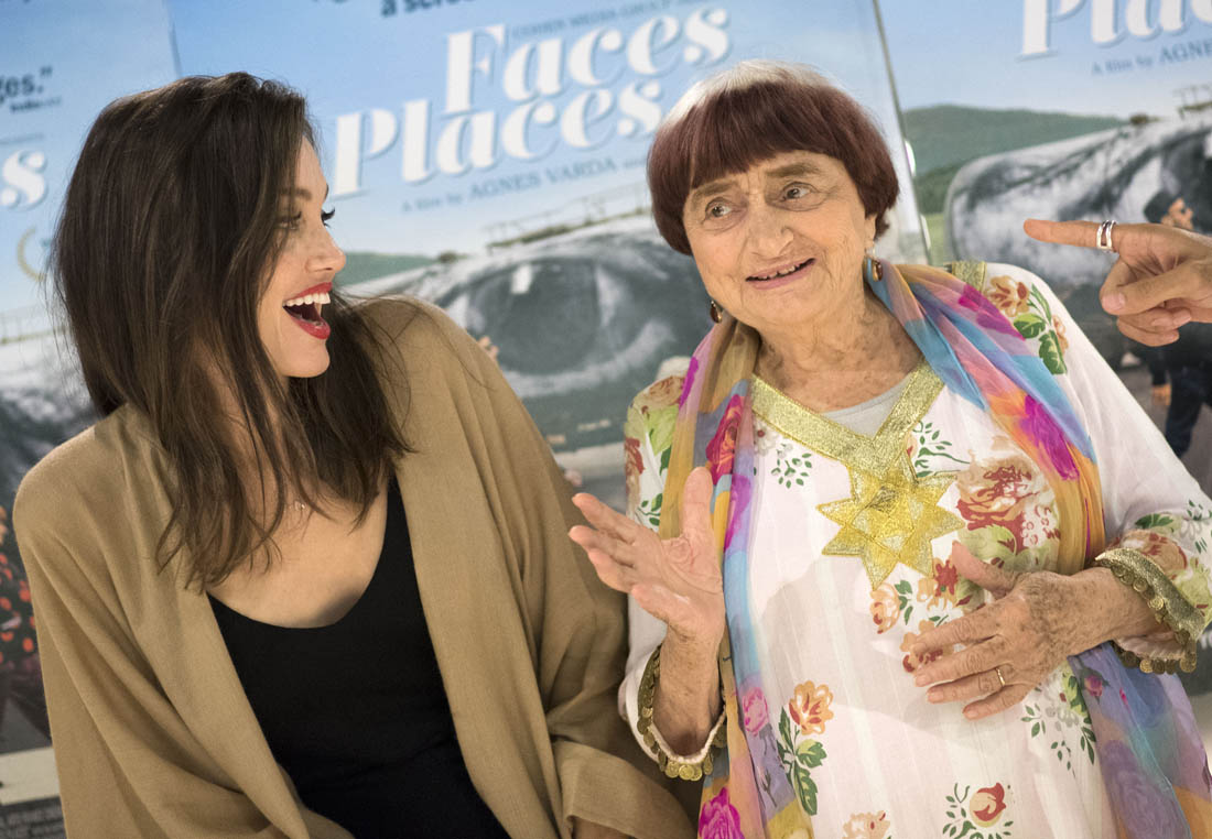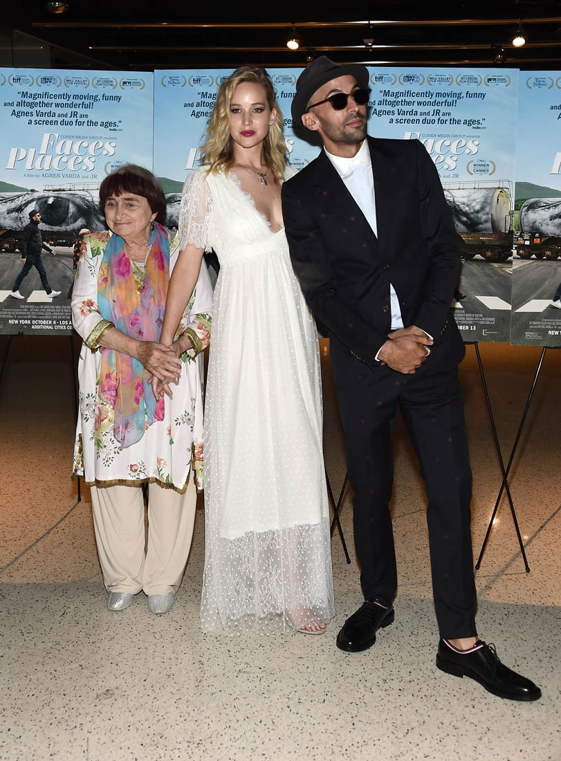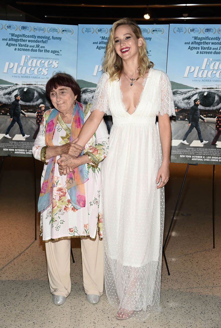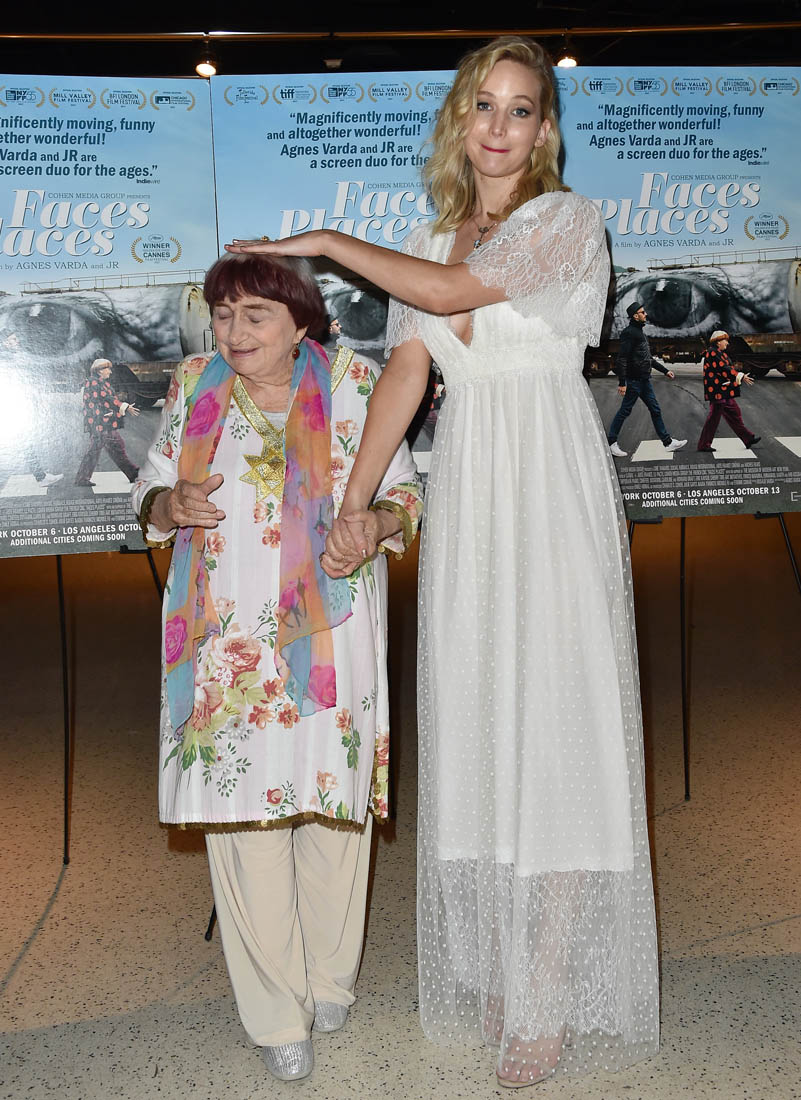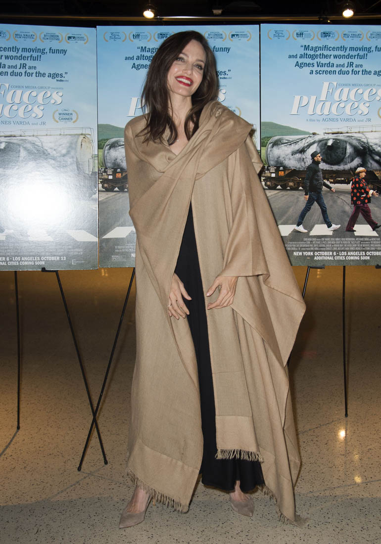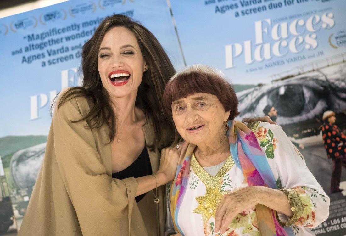 Both Angelina Jolie and Jennifer Lawrence were at the premiere of Faces Places last night in LA. Faces Places is an award-winning documentary directed by the acclaimed Agnes Varda and also JR. Angelina Jolie is very selective about the events she attends in Hollywood. Anytime she shows up anywhere it’s a story, the pictures get out there. The event gets a boost. I’m guessing here that’s she’s there out of respect for Agnes Varda, as you can see from the deference she’s showing in these photos.