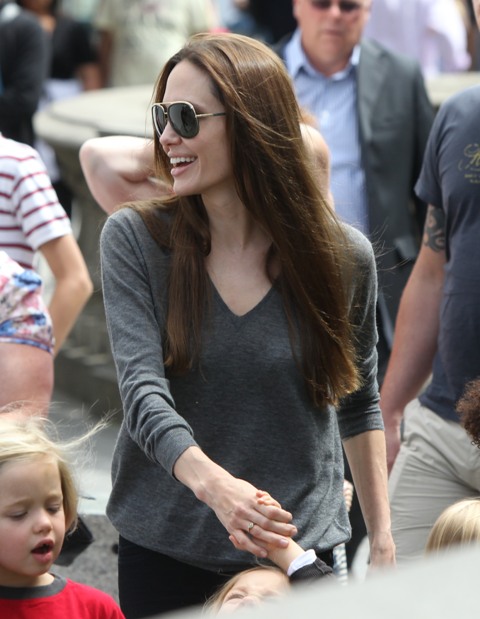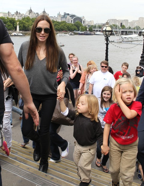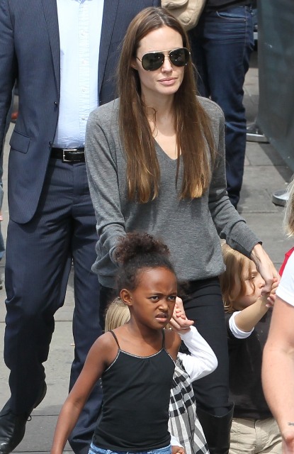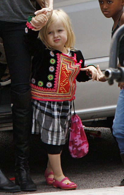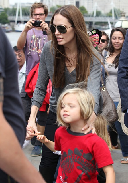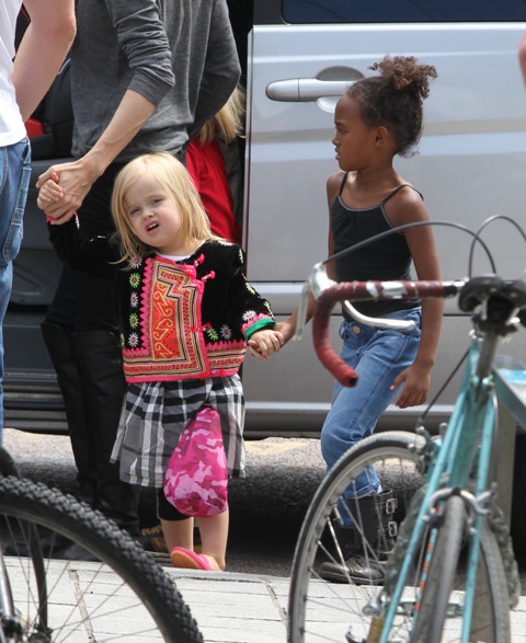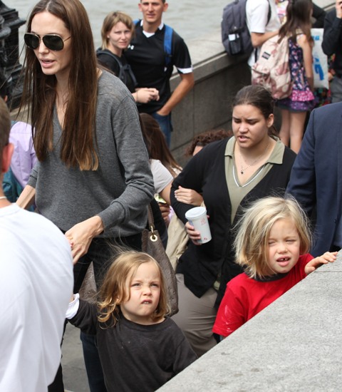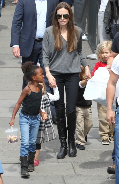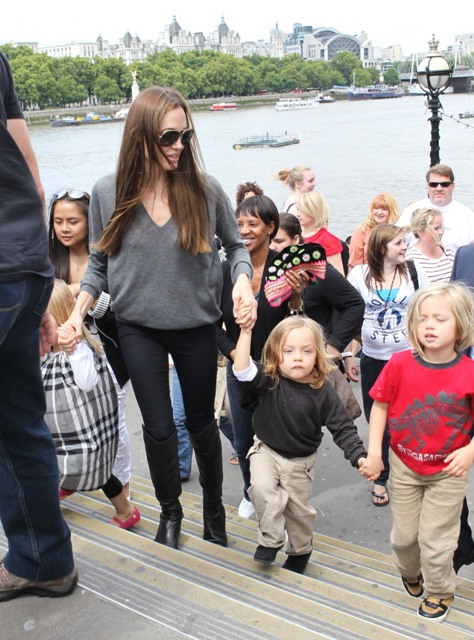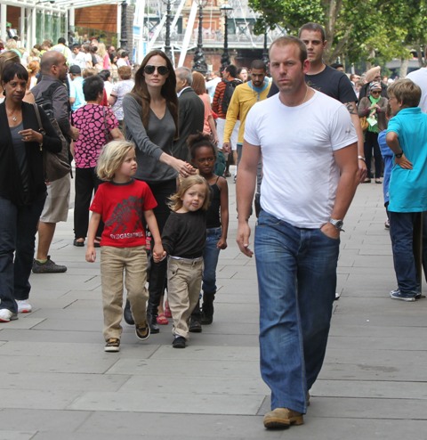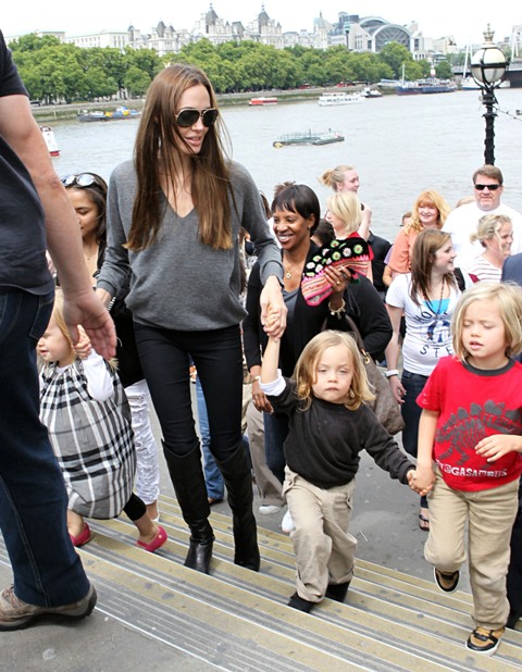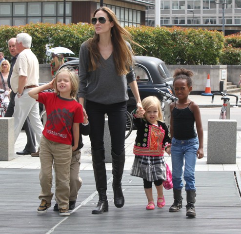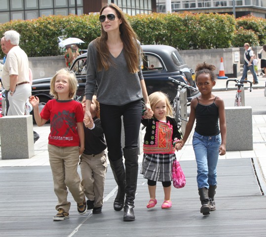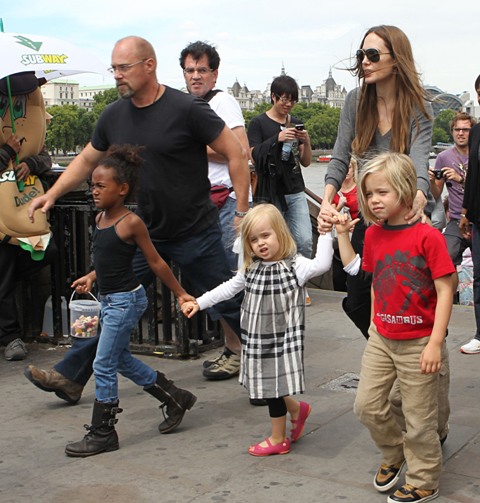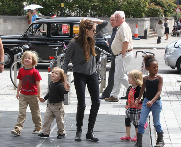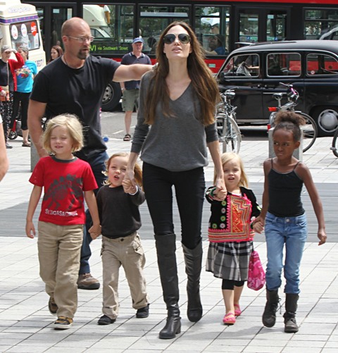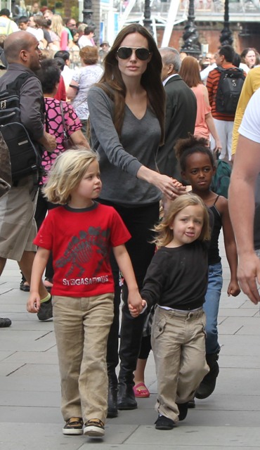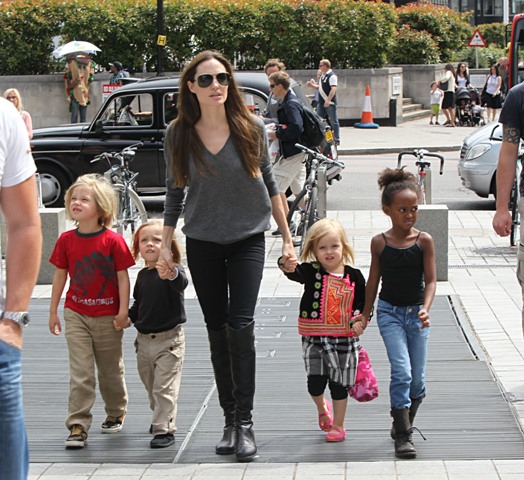 Like, neither of them would indulge in even one fry from McDonald’s. The Jolie leaves that up to the Chosen One who looked like she had to be restrained by her mother at one point because she was about to make a break for trouble. Here she is, with three of her siblings today in London getting shuffled back to the car after a visit to the aquarium before heading for the golden arches. Gwyneth Paltrow does not appove. G must think Angie is a terrible mother.