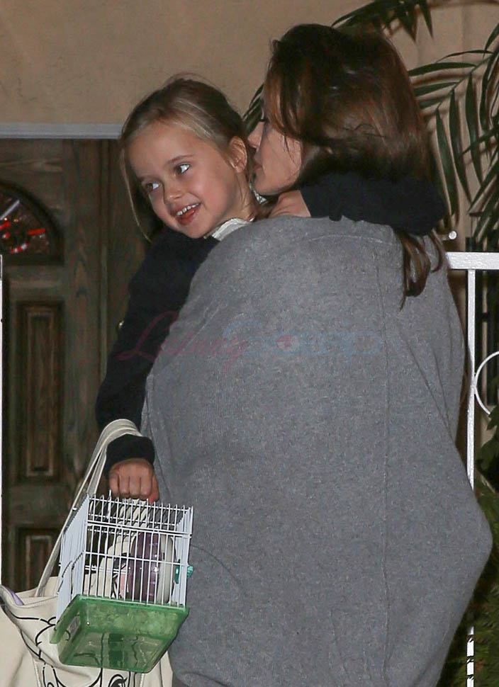 On Saturday she arrived back in LA with the kids. On Sunday she was photographed with Vivienne. According to photographers, she and V were dropping off one of V’s friends after a playdate. I guess the bird had to come along too. Maybe it’s a new bird and they’re taking it home. I hope so. Because, you know, if it’s not a new bird and the bird had to ride with the kids just because the kids thought it would be hilarious, I’m not sure the bird would have found that hilarious.