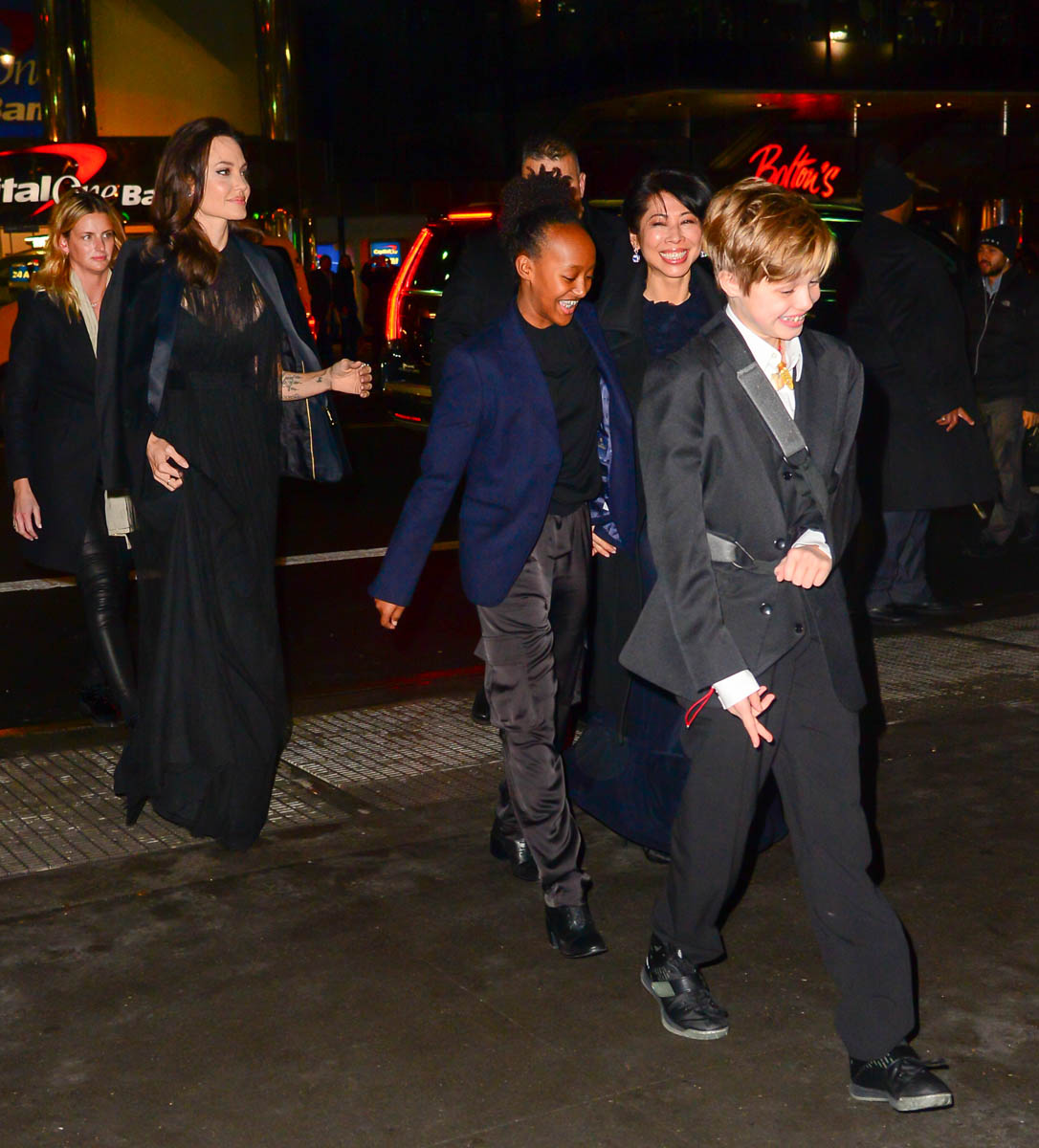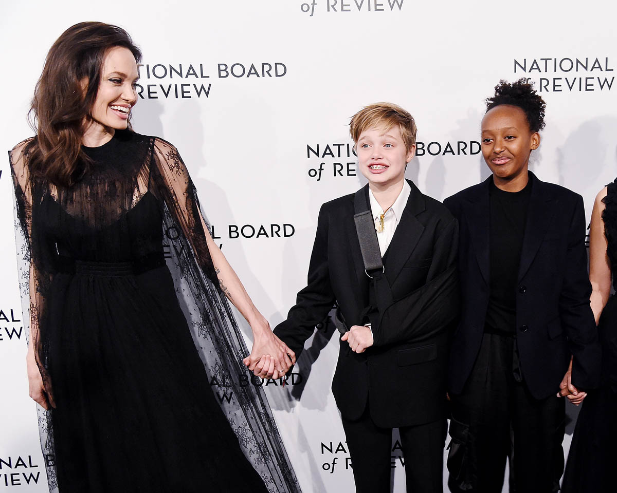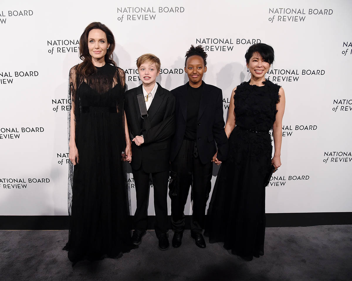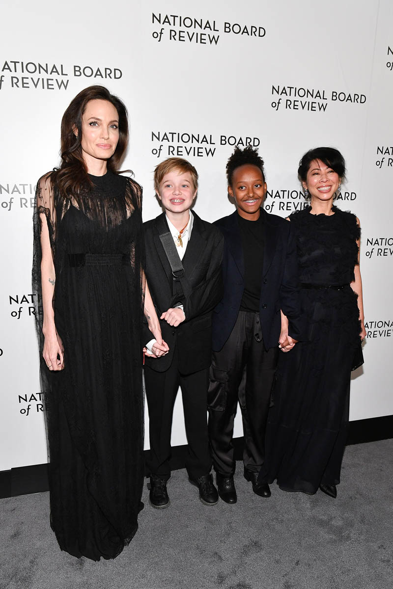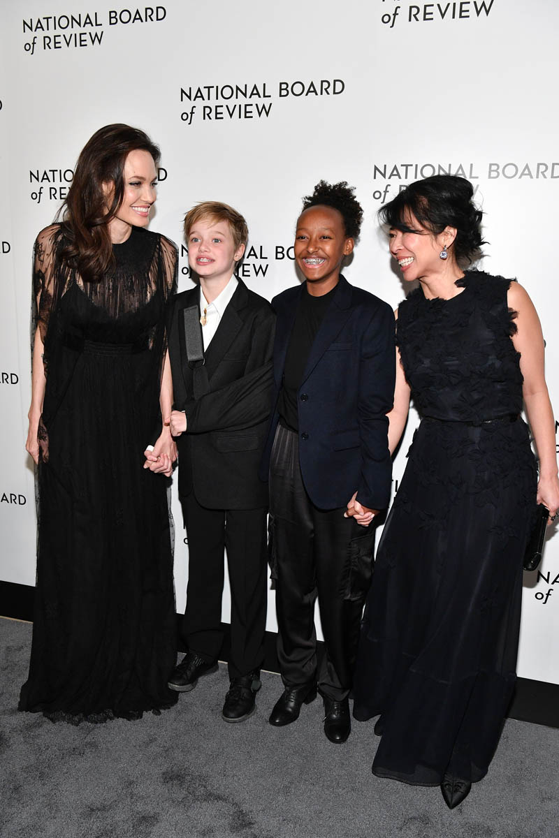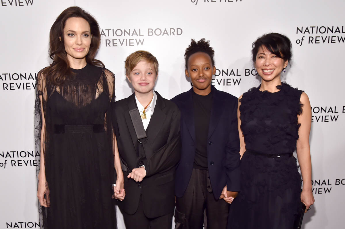 Angelina Jolie was in New York last night to accept the NBR Freedom of Expression Award for First They Killed My Father. She was joined by her collaborator and friend Loung Ung and daughters Zahara and Shiloh. As you can see, Shiloh has her arm in a sling. Apparently she injured it while snowboarding during the holidays. Sources tell PEOPLE that Shiloh is “fine” and she certainly seems fine and in great spirits on a girls’ night out.