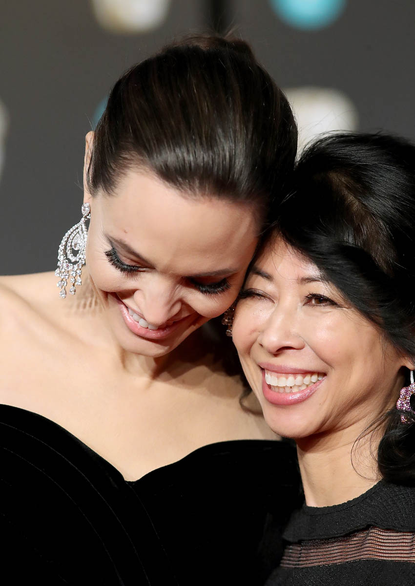 Angelina wore a champagne-coloured Elie Saab dress to the Cinematographers Awards and a black velvet Ralph & Russo to the BAFTAs. She looked like she was feeling herself on both nights. At the BAFTAs in particular, she seemed to really bring it, especially with the posing. You know what the universe could really do to blow our minds? Last week everyone was freaking out because Jennifer Aniston and Brad Pitt were both single again and at the same time. Jennifer Aniston and Angelina Jolie are also single again at the same time. What if, one day, they stepped out together, as friends, holding hands and giggling like Angelina’s doing here with Loung Ung? Debbie Reynolds and Elizabeth Taylor became friends in the end. One night they ended up on the same boat together and decided to have dinner. They got drunk. Everything was forgiven. Is that at all possible in this case?