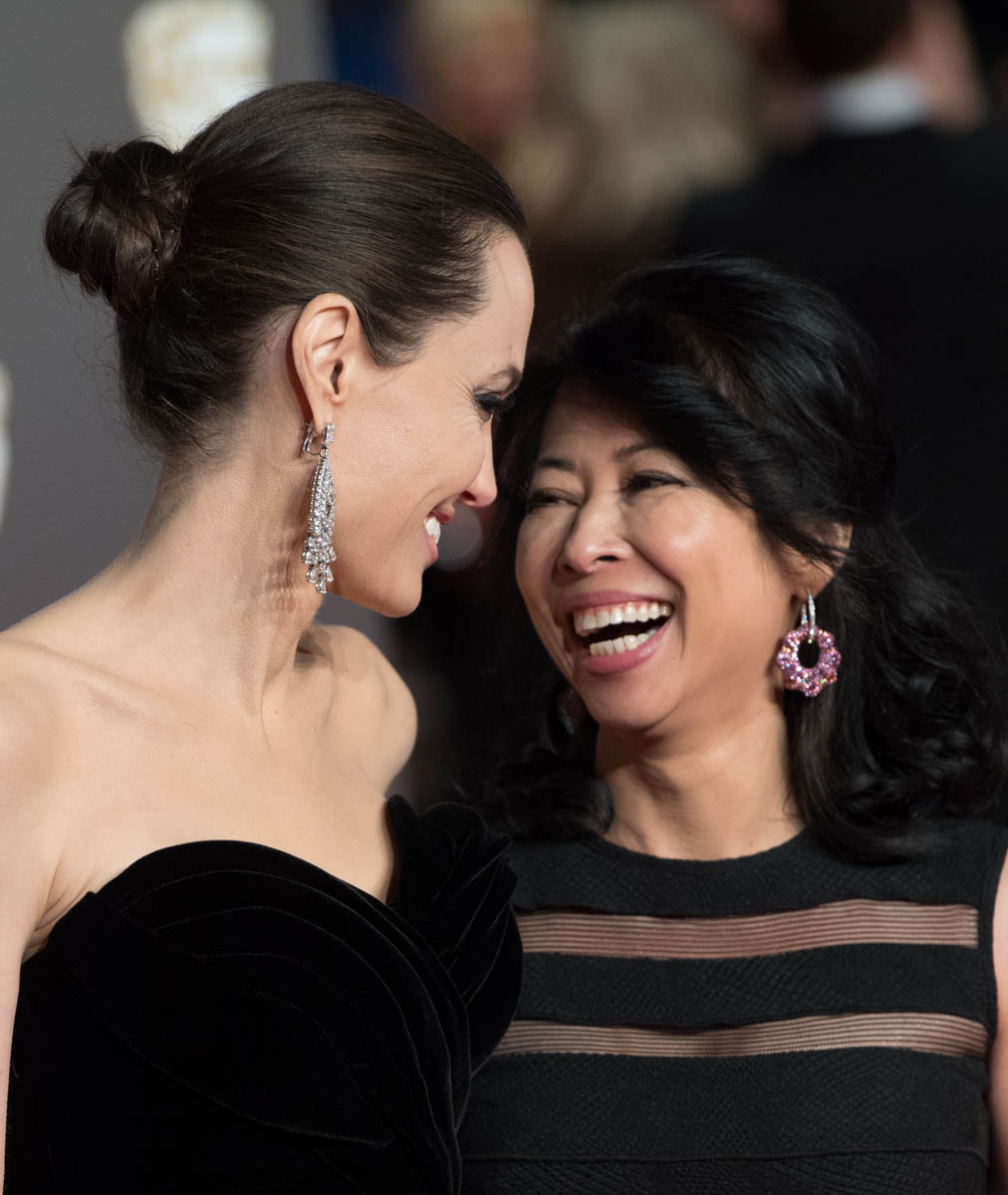 Angelina wore a champagne-coloured Elie Saab dress to the Cinematographers Awards and a black velvet Ralph & Russo to the BAFTAs. She looked like she was feeling herself on both nights. At the BAFTAs in particular, she seemed to really bring it, especially with the posing. You know what the universe could really do to blow our minds? Last week everyone was freaking out because Jennifer Aniston and Brad Pitt were both single again and at the same time. Jennifer Aniston and Angelina Jolie are also single again at the same time. What if, one day, they stepped out together, as friends, holding hands and giggling like Angelina’s doing here with Loung Ung? Debbie Reynolds and Elizabeth Taylor became friends in the end. One night they ended up on the same boat together and decided to have dinner. They got drunk. Everything was forgiven. Is that at all possible in this case?