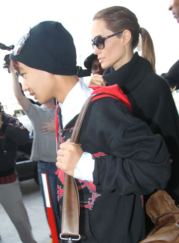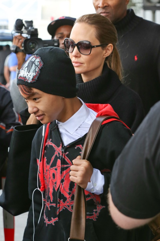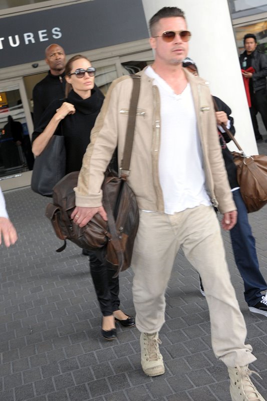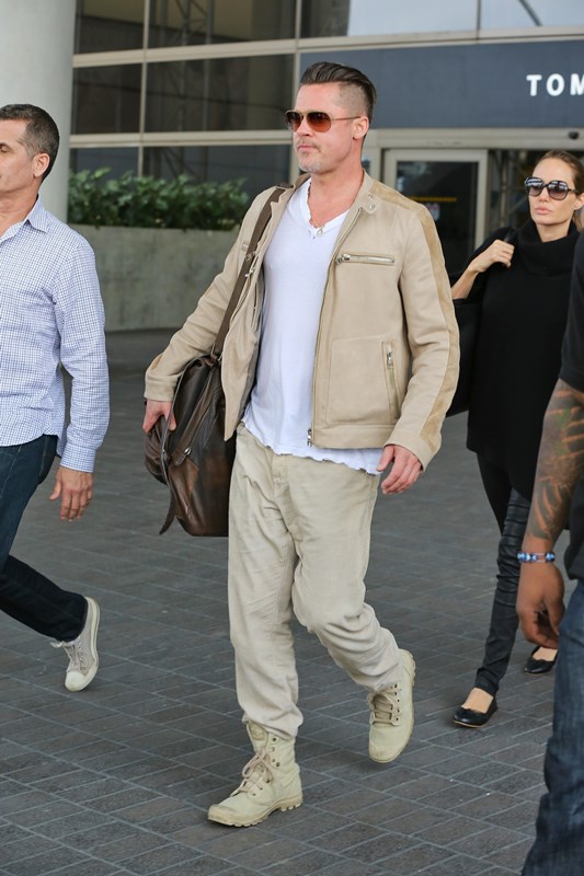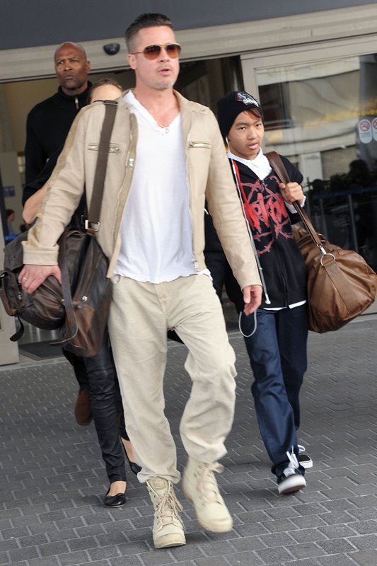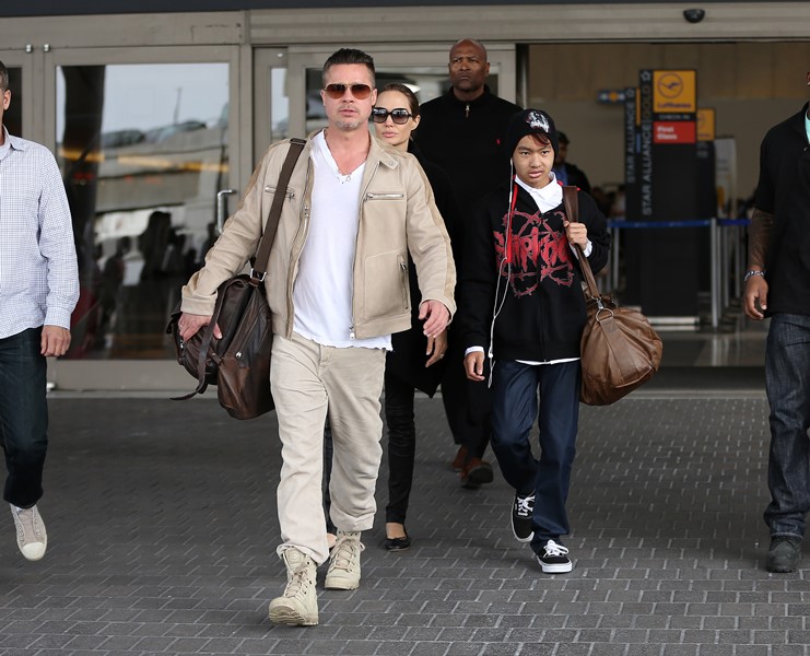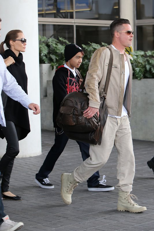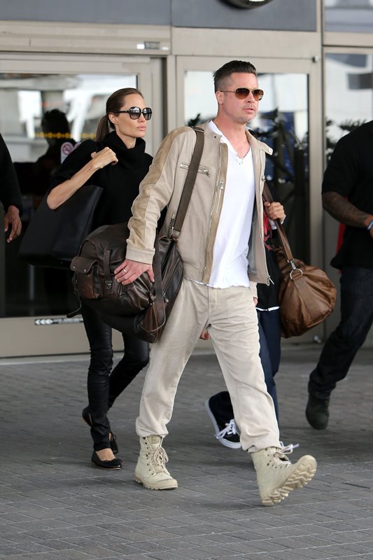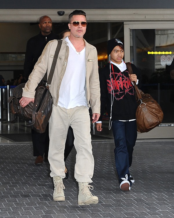 Angelina Jolie and Brad Pitt flew home from London with their son Maddox yesterday after attending the BAFTAs. With less than two weeks to go before the Oscars, and Angelina having wrapped on principle photography on Unbroken, LA will be home for now – and for the final push before ballots are due. As you can see, Brad seems to have exactly one travel outfit. At this point, their children are better dressed than they are. Where do you think they get that from?