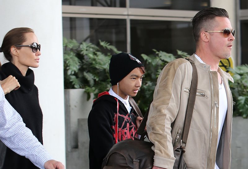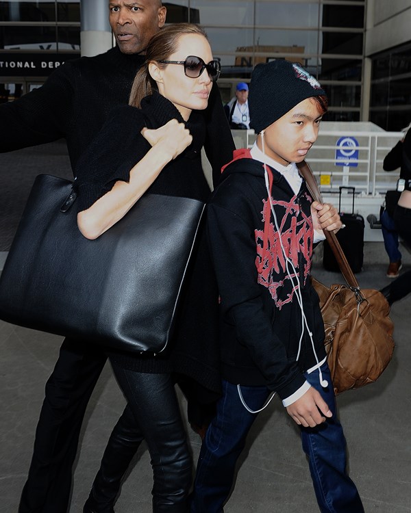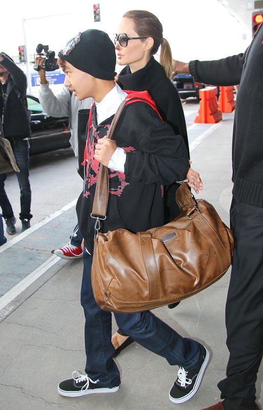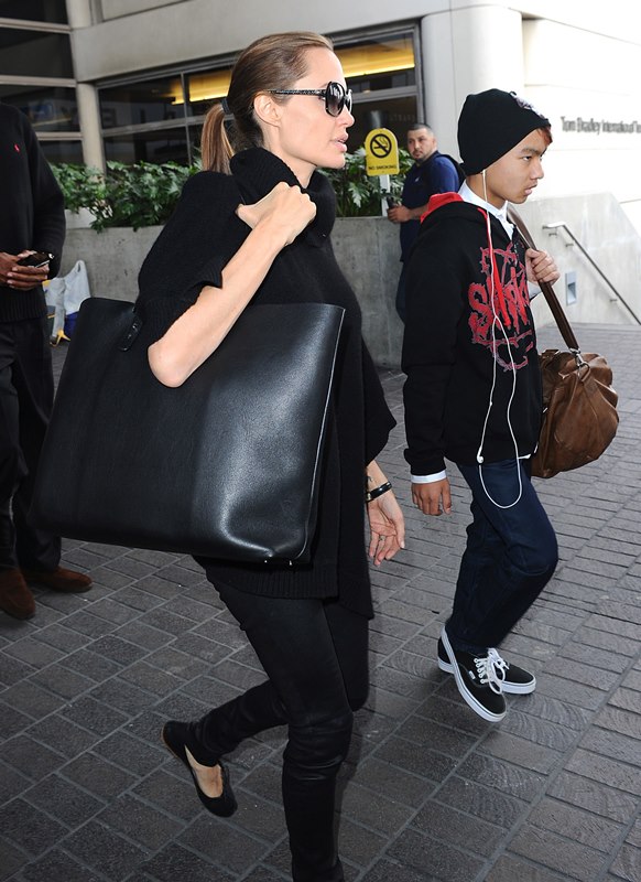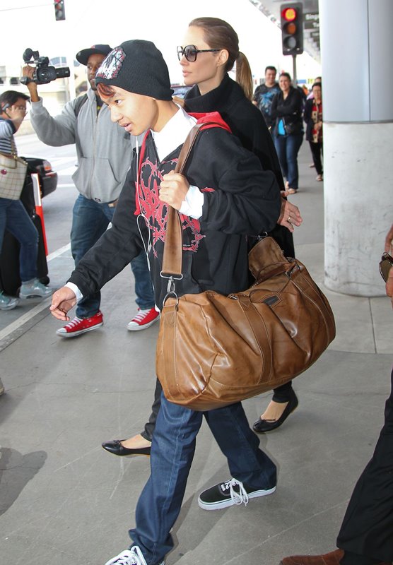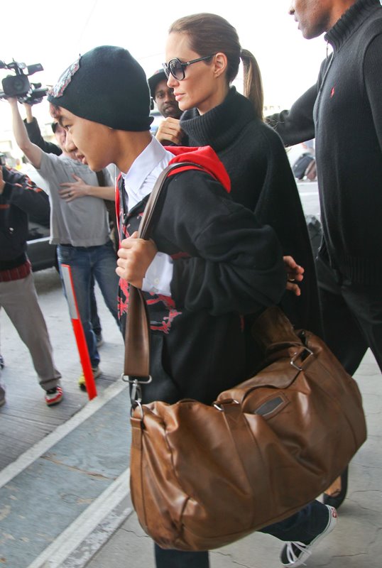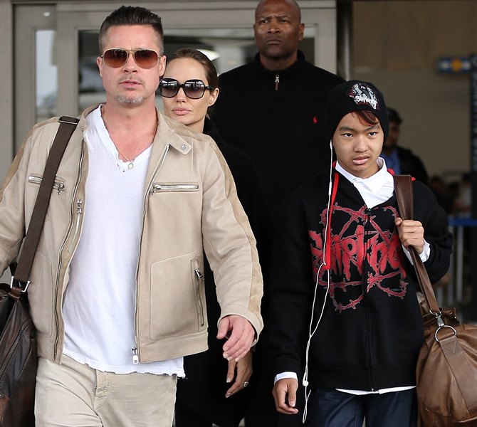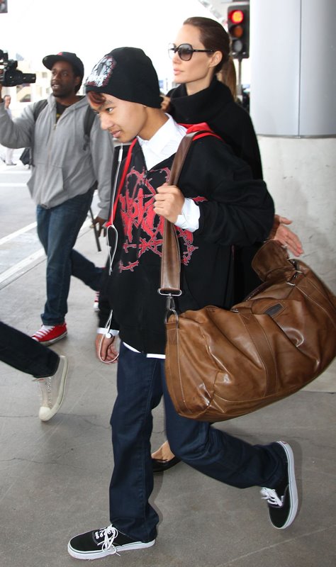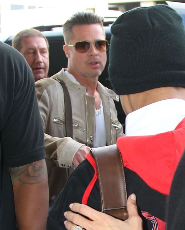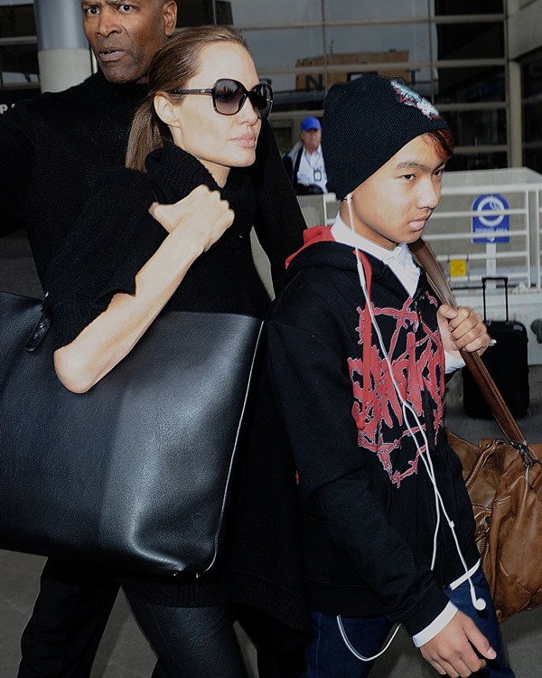 Angelina Jolie and Brad Pitt flew home from London with their son Maddox yesterday after attending the BAFTAs. With less than two weeks to go before the Oscars, and Angelina having wrapped on principle photography on Unbroken, LA will be home for now – and for the final push before ballots are due. As you can see, Brad seems to have exactly one travel outfit. At this point, their children are better dressed than they are. Where do you think they get that from?