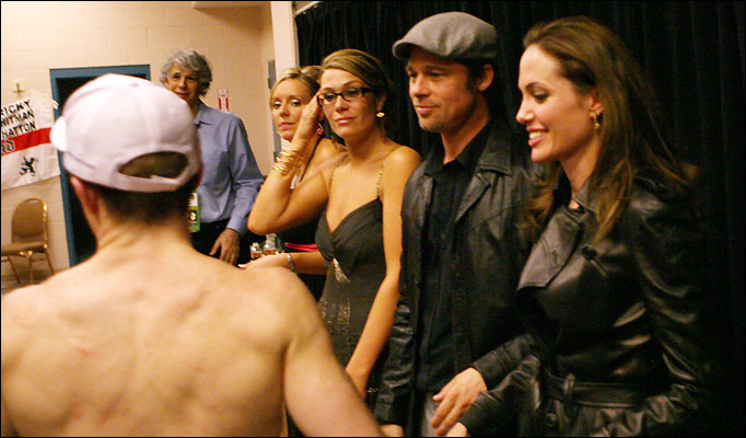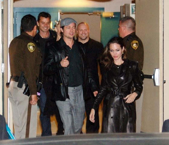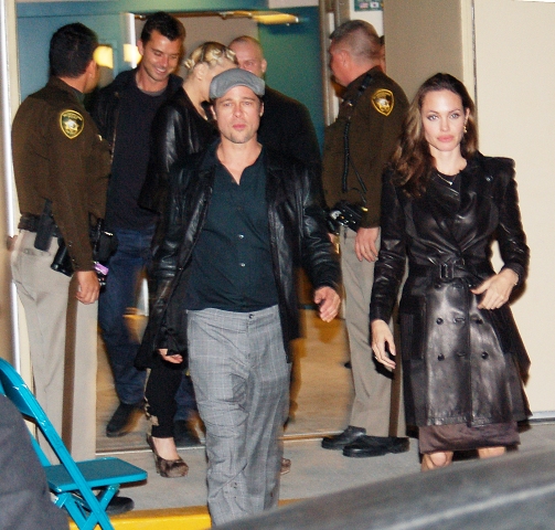 Surprise attendees at the Hatton-Mayweather fight in Vegas on Saturday night – Brad and Angelina showed up ringside as Angie reportedly grimaced her way through the bout, especially towards the end when Hatton was pummelled to the mat. They ended up in his dressing room afterwards to offer encouragement as Angie also chatted up the scrappy boxer’s mother before joining Gwen Stefani and Gavin, both glamourous couples heading into the same limo presumably to gush about their children.