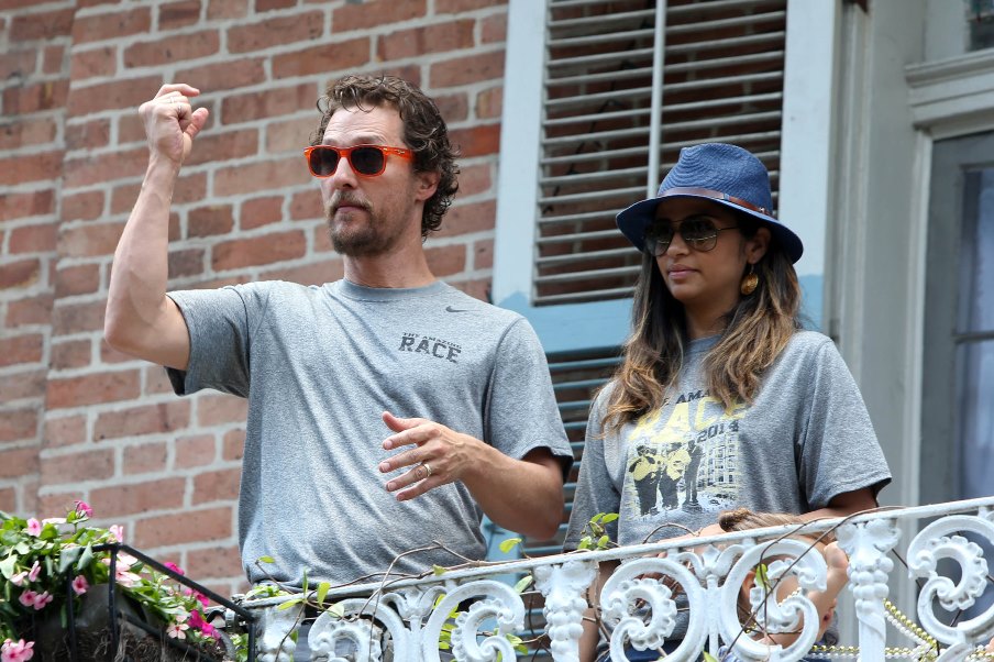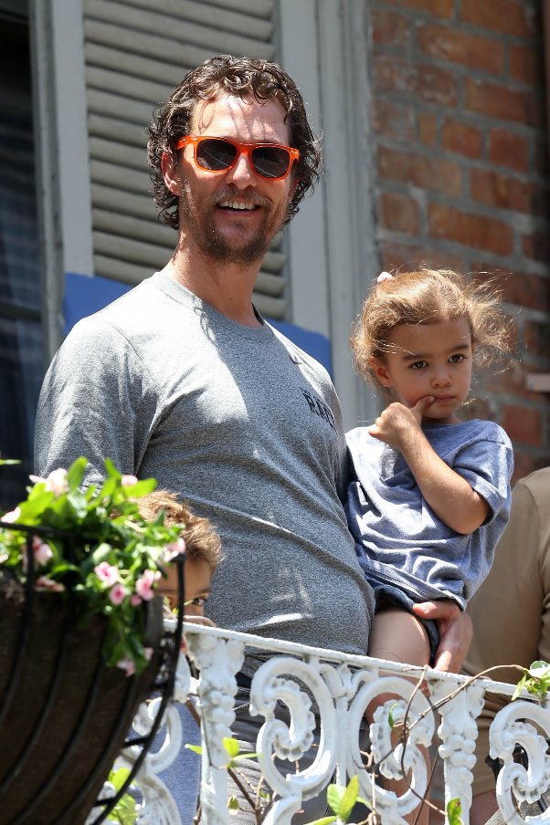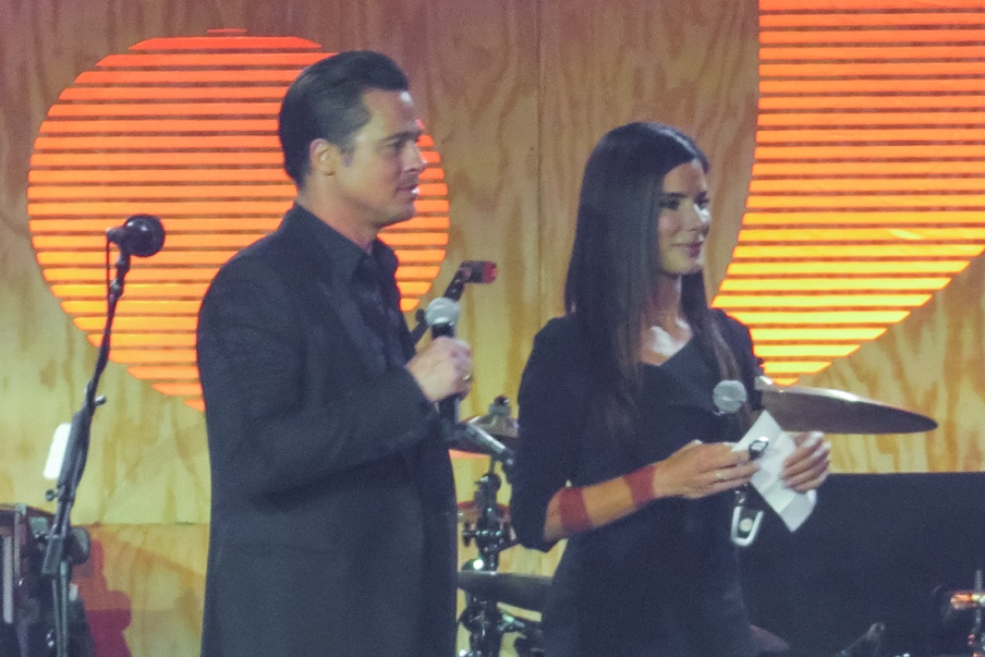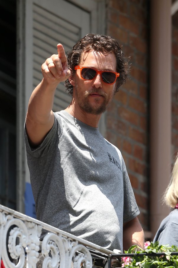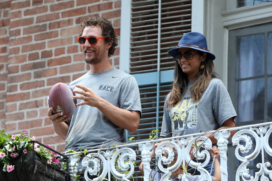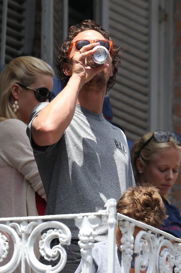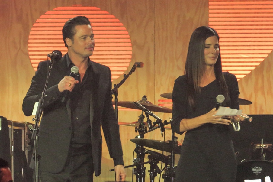 Angelina did not speak. But at one point Brad was on stage with Sandra Bullock. Sandy’s ex and good friend Matthew McConaughey was also in New Orleans on Saturday. He was also hosting a charity event for his Just Keep Living Foundation. And it turns out that Brad and Matthew were staying across from each other. So they threw a football back and forth and then Brad tossed Matthew a beer and all the penises were happy. Video of the exchange is below, if you can stand the sound of that woman moaning like she’s the ball and they’re throwing her around.
