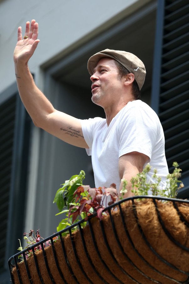In this video at the Mirror, on Brad’s balcony, you get a glimpse of what looks to be one of his kids (maybe Knox?) in a red t-shirt stepping out for just a quick moment before heading back inside. That’s nine children between the two actors. I would suggest a playdate but I’m not sure anyone would appreciate it.