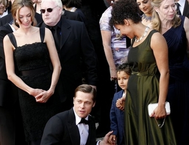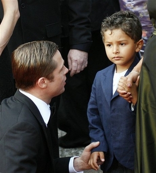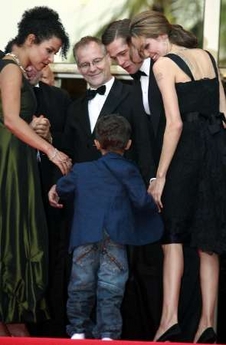 Also loved Brad’s affection for little Adam Pearl who was clearly overwhelmed by the situation. There’s no photo of it but as they headed into the Palais after waving to the crowd, Angelina mussed up Adam’s hair and made a silly face and poked him in the armpit. He laughed, she laughed, and then she took Brad’s hand and they entered the theatre.