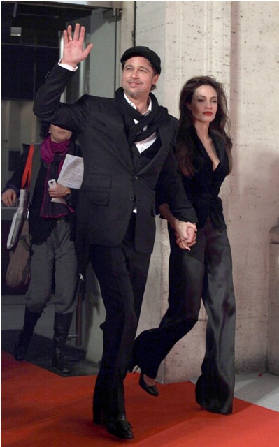 And then last night, at the Spanish premiere, Brad pulled out his steezy leather pants again and his gait, always his gait, the best gait in Hollywood, and Angelina showed so much promise from the waist up. It’s beautiful. And her face. Look. At. That. Face. Crazy. Her face is a legend. And then... the skirt. You know those Dracula costumes for Halloween? The cape? Cheap polyester that smells after an hour? The way they’ve put this together it’s like she’s fashioned one around her waist. Incredibly frustrating.