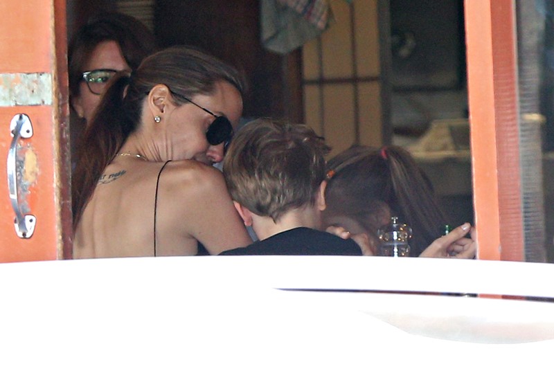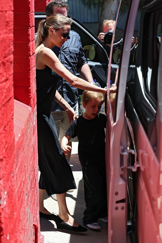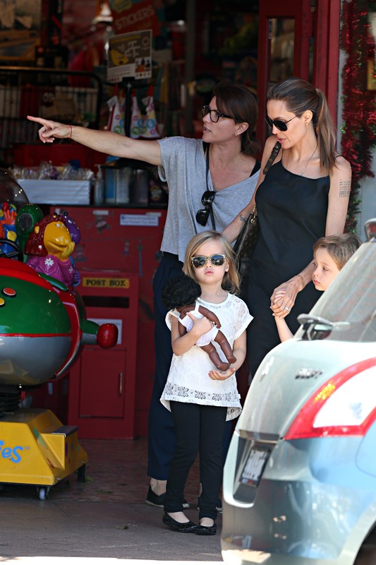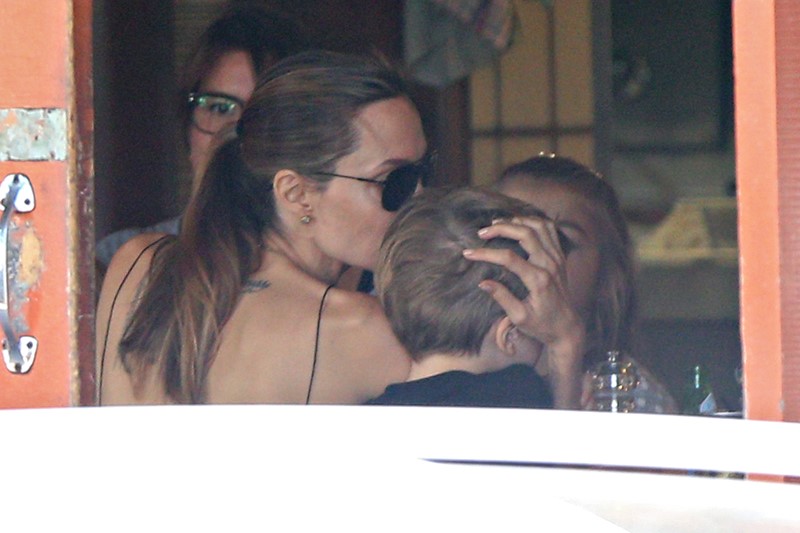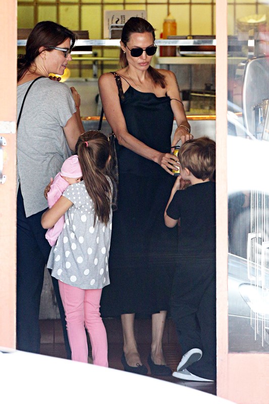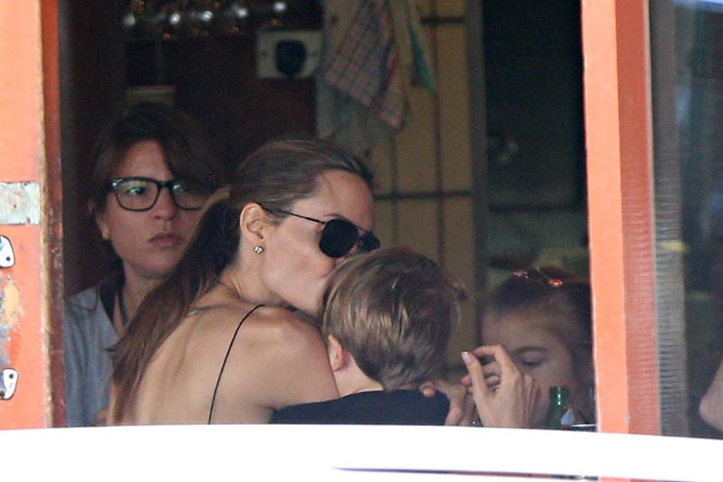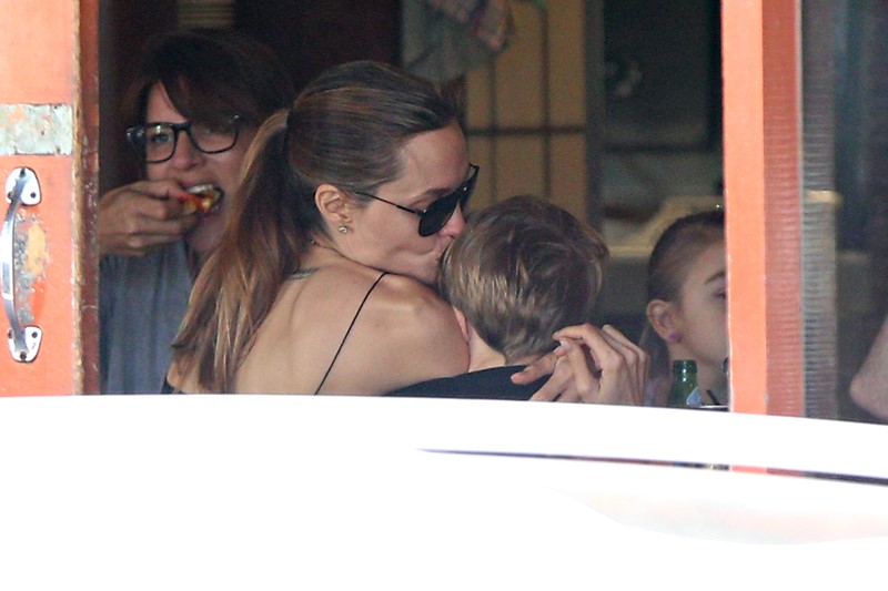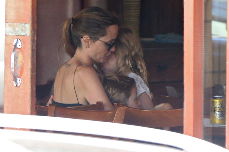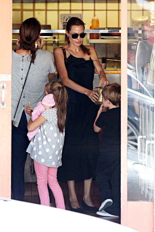 Here’s the Jolie being affectionate with Vivienne and Knox in Australia the other day.