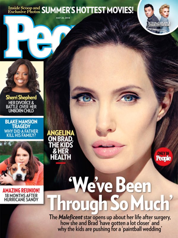 Today is the one year anniversary of Angelina Jolie’s op-ed in The New York Times in which she revealed that she’d had a preventative double mastectomy. May 14, 2013. Click here to re-read it. This year she’s appearing in a different kind of publication. It’s a different kind of message. Check out the Jolie on the cover of the new issue of PEOPLE in advance of the release of Maleficent. And there’s an exclusive interview about when she and Brad Pitt are getting married and what her relationship with him is like.