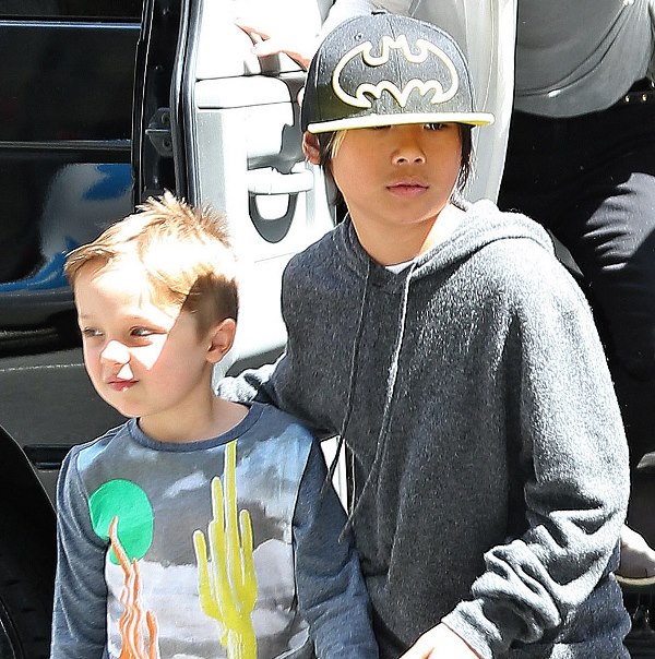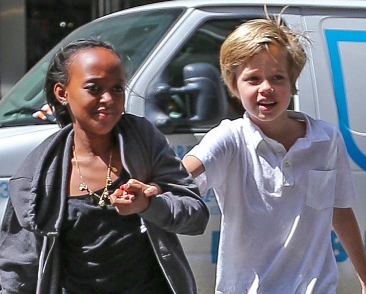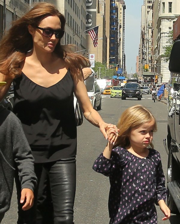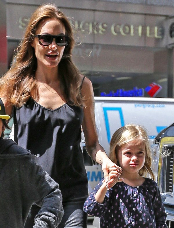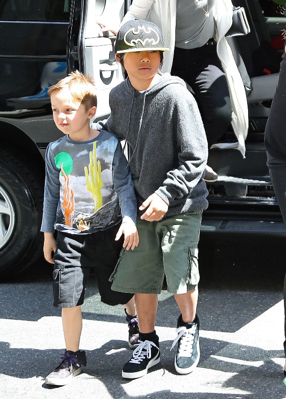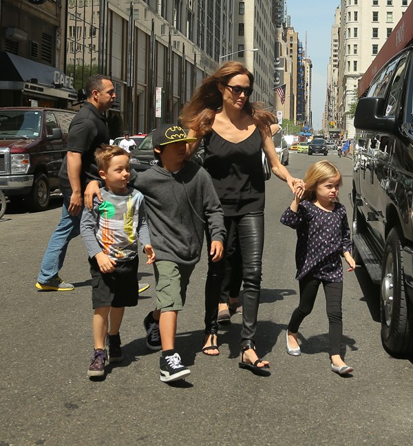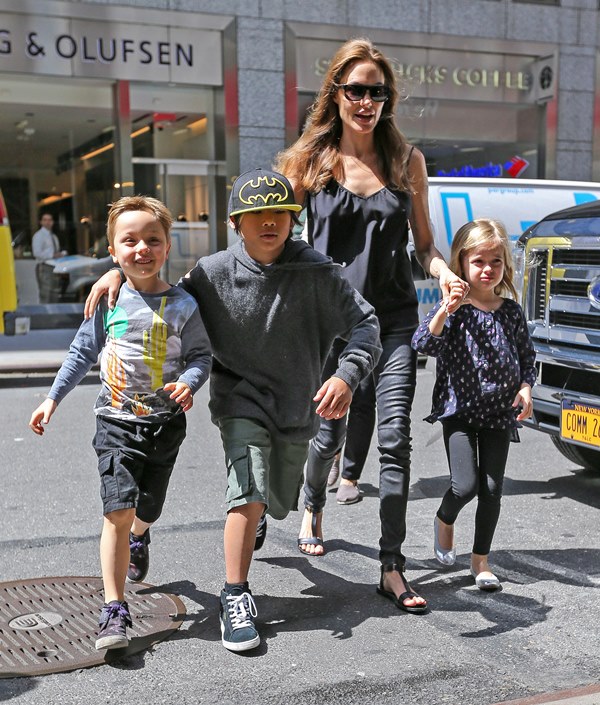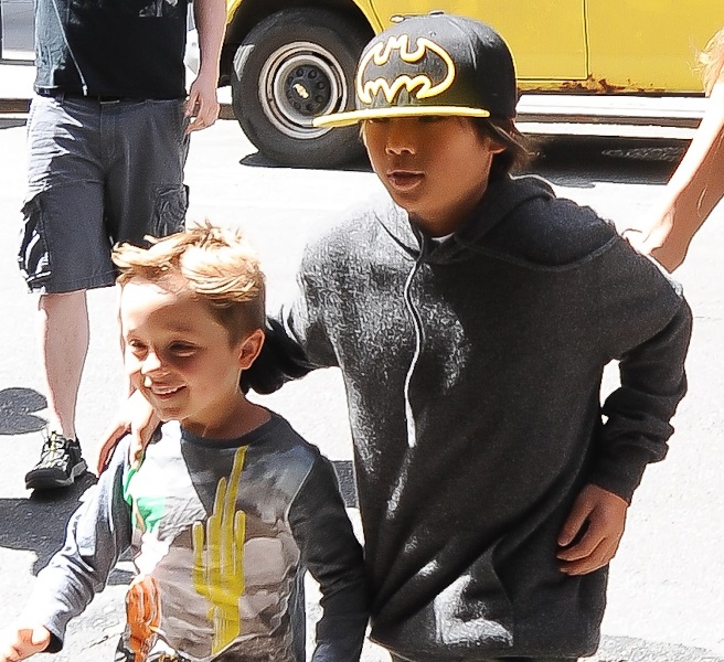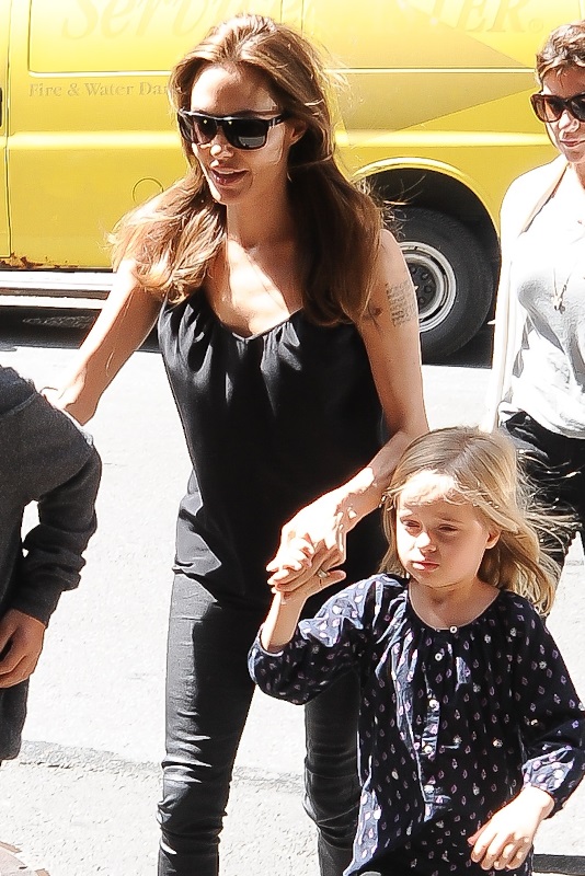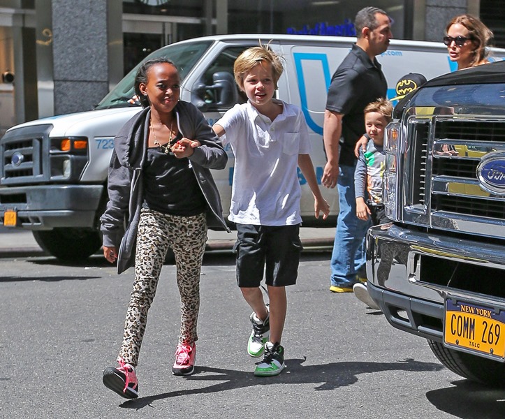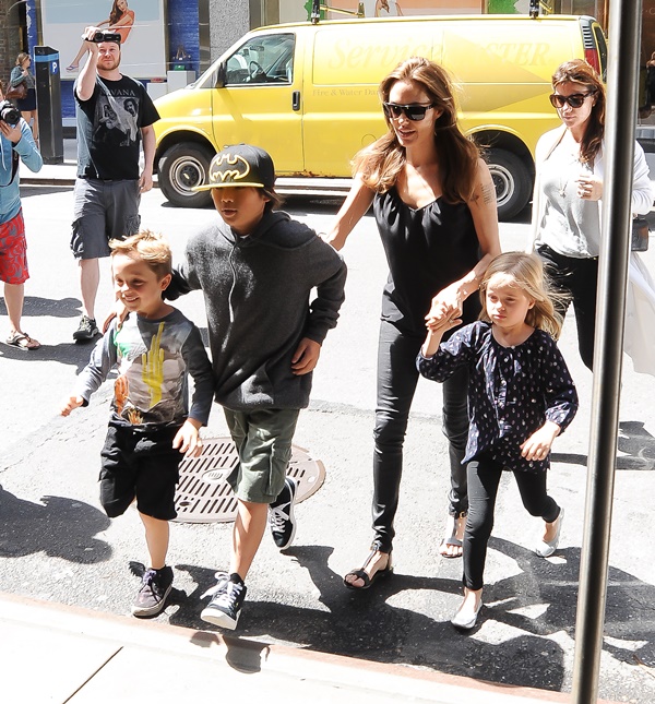 Speaking of the kids, she was out with them in New York yesterday. All of them except for Maddox went to FAO Schwarz. Miss Zahara and Shiloh the Chosen One are still thick as thieves. Pax has a protective arm around his little brother Knox. And Vivienne, as Angelina has previously explained, is attached to her ma.