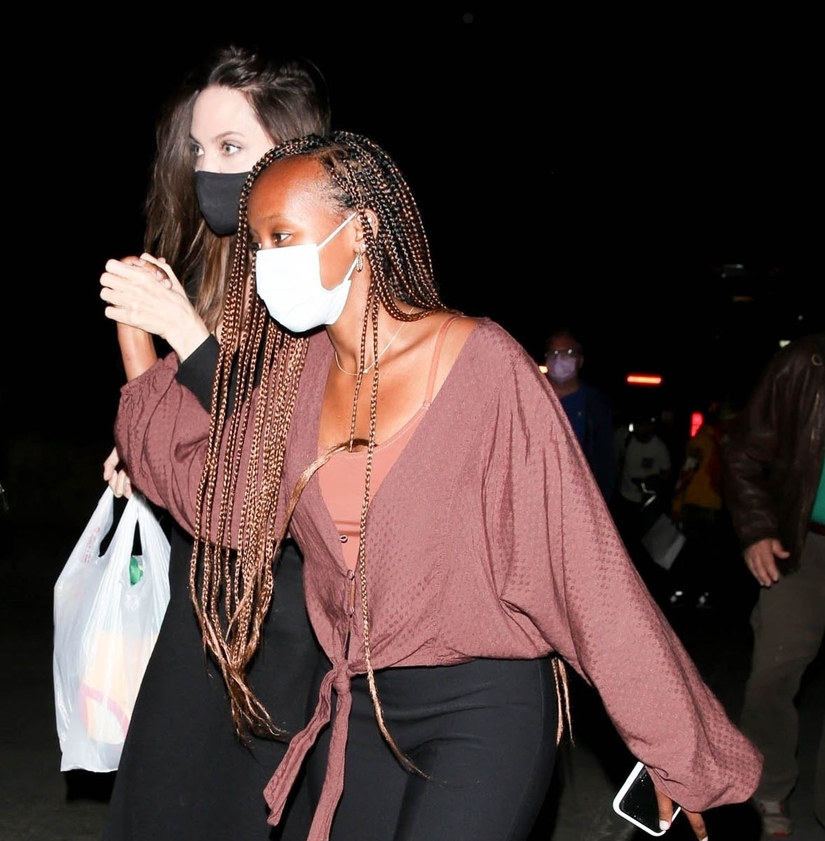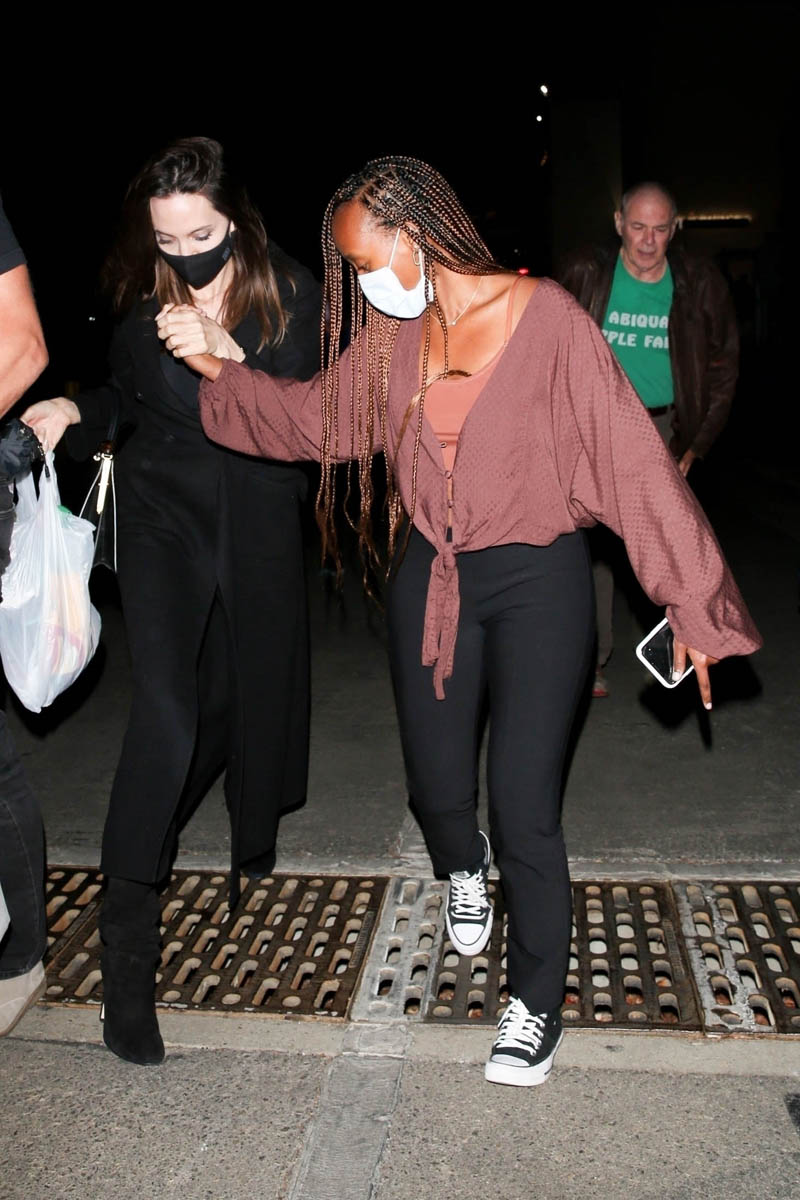 This was Friday though. Because now Angelina is back in LA and I guess there’s no jet lag because on Sunday night she and Zahara were seen at the Ziggy Marley show at the Hollywood Bowl. What’s in the plastic bag? Angelina Jolie, just like us? Getting merch at a concert?
