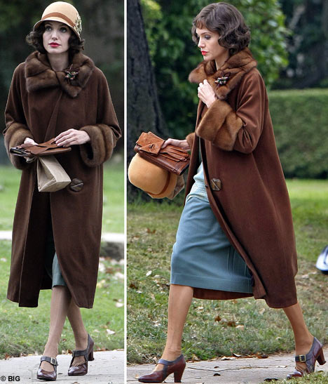 The Family Pitt left NYC last week to return to LA where Angelina will be shooting The Changeling directed by Clint Eastwood. Check out Angie in costume wearing a very cute outfit and shoes but looking pretty old which could be just the character requirement but the gauntness of her face doesn’t help either.