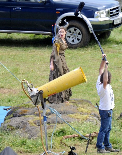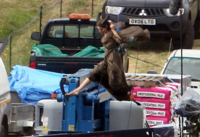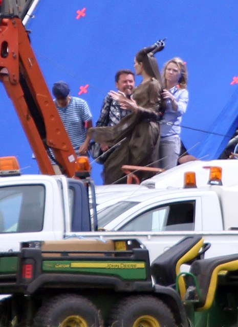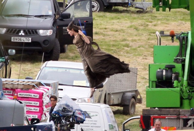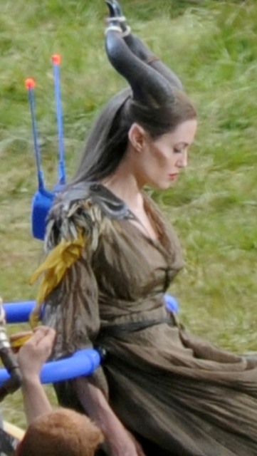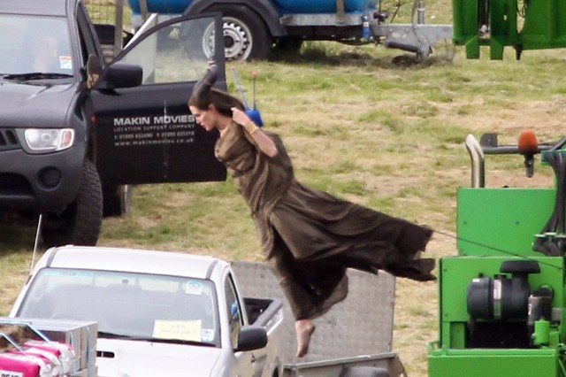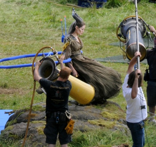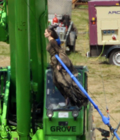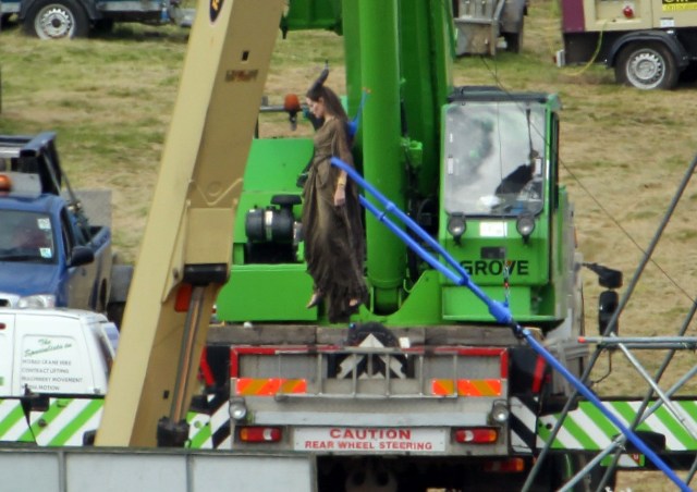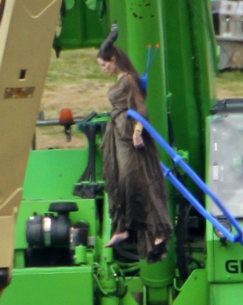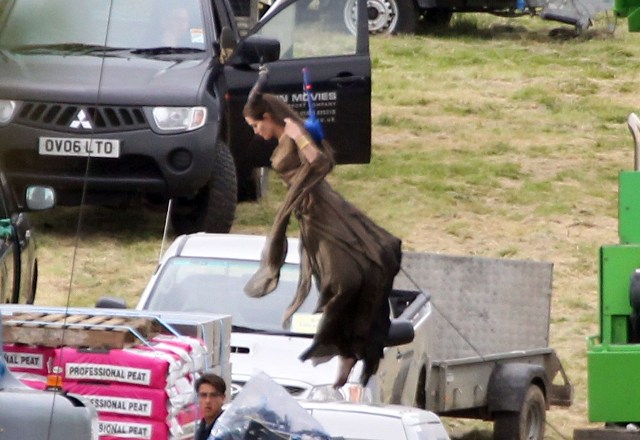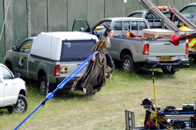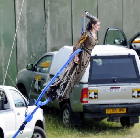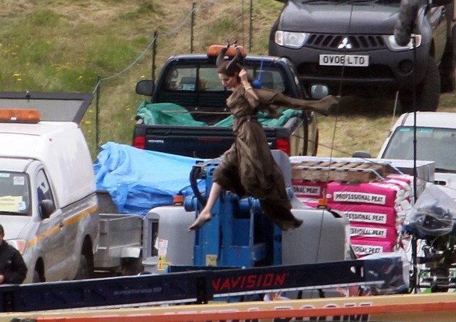 Angelina Jolie’s Maleficent can apparently fly. Here she is on set today in England suspended against a green screen. Am now very interested to see what they do with this in post and how real it will look when they’re done. Will it actually seem like the Jolie is airborne outside?