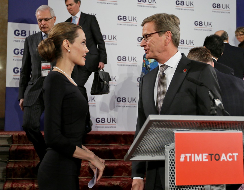 Angelina Jolie spoke at the G8 summit in London today where the forum announced a £23 million initiative aimed at ending war zone rape and sexual violence. She has worked closely, in her capacity as UN Special Envoy, with William Hague, British Foreign Secretary, to push the agreement forward. “The G8 has also agreed that there should be no amnesty for sexual violence in peace agreements, and committed to developing an international protocol to investigate such crimes. Soldiers, who are sometimes the first to come across victims in conflict zones, will receive dedicated training to deal with such scenarios.” (Source)