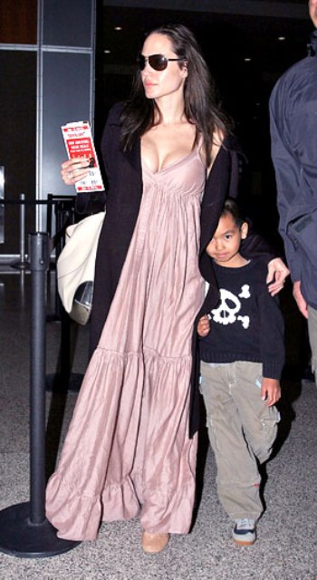 In response to your emails yesterday, many from soon to be moms!, about Angelina Jolie’s pink dress at the airport in Austin –attached.