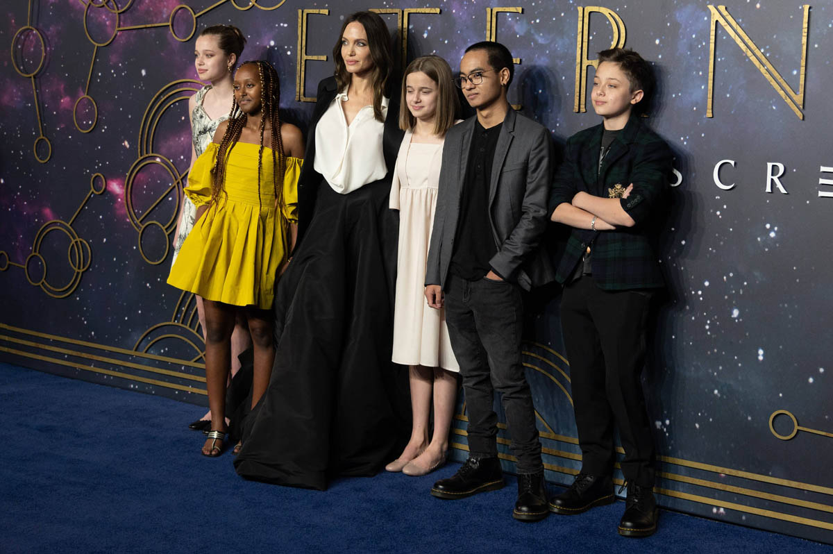 As expected, Angelina Jolie attended the UK premiere of Marvel’s Eternals with five of her children. Earlier this week, four of her youngest were with her as she promoted the movie in Italy and also fit in some travel school, and now we know that her oldest, Maddox, also made the trip. So we’re getting a sequel to the Hollywood premiere last week when they all joined her on that carpet and her kids have become a fashion story unto themselves.