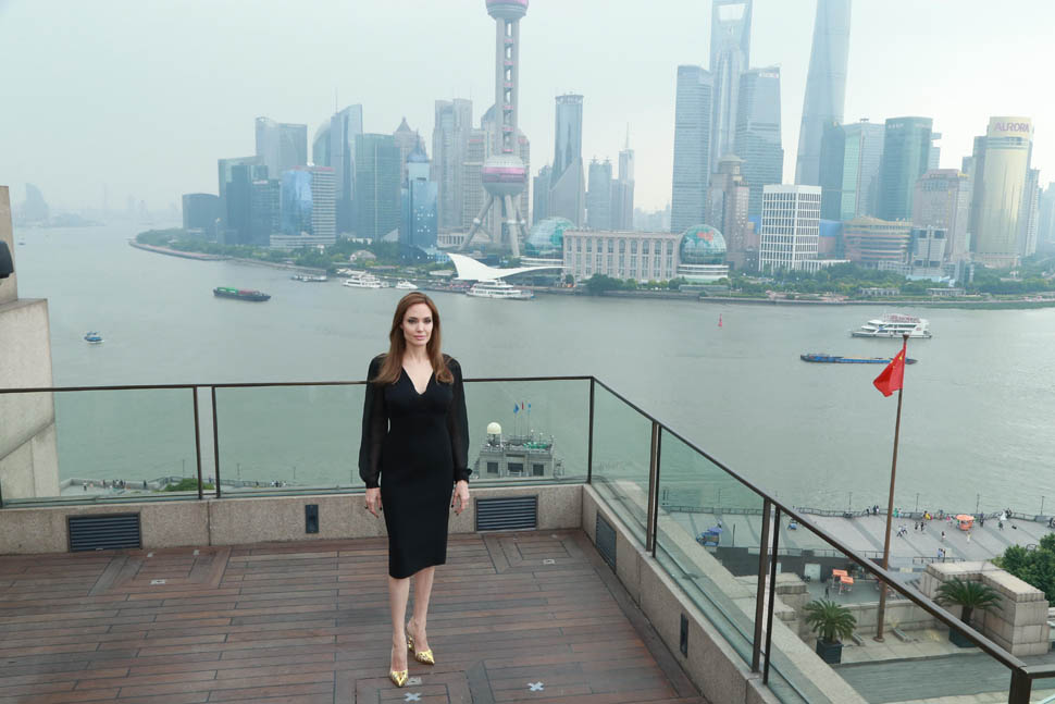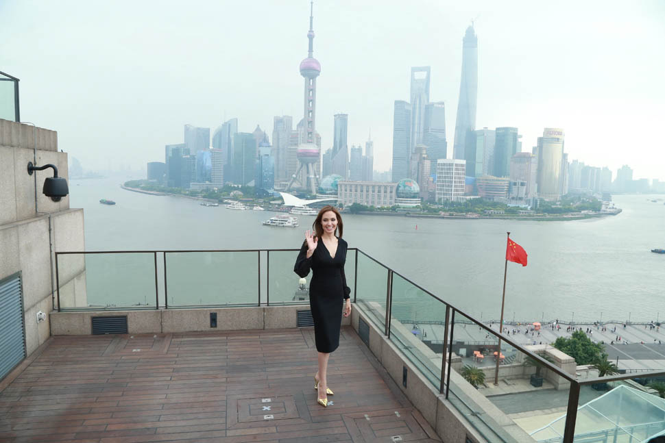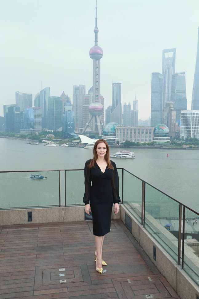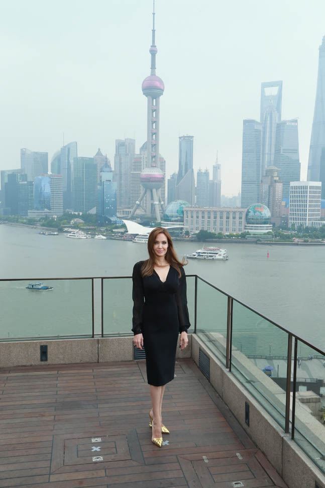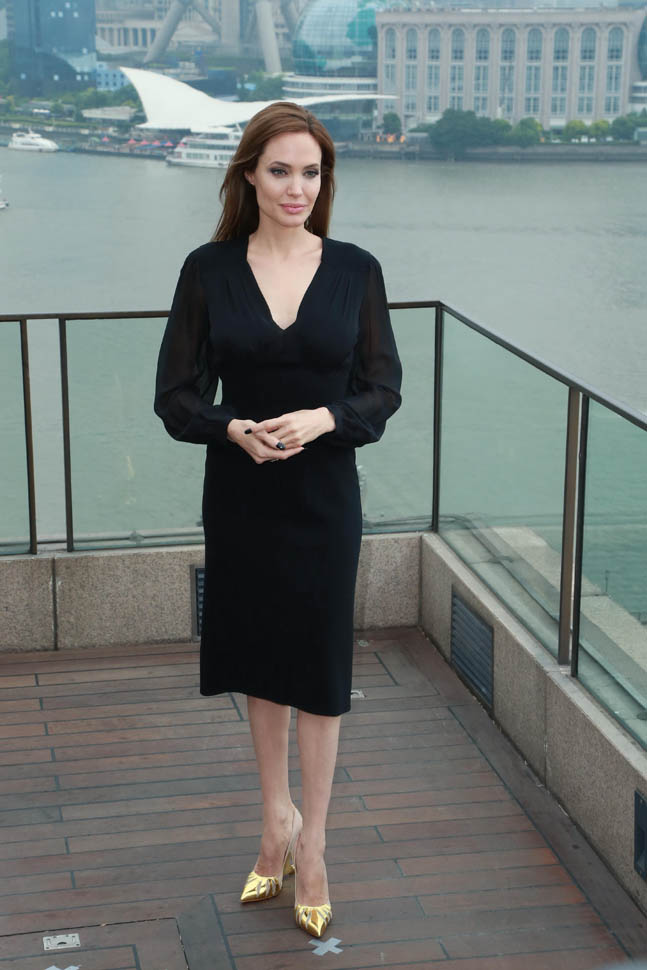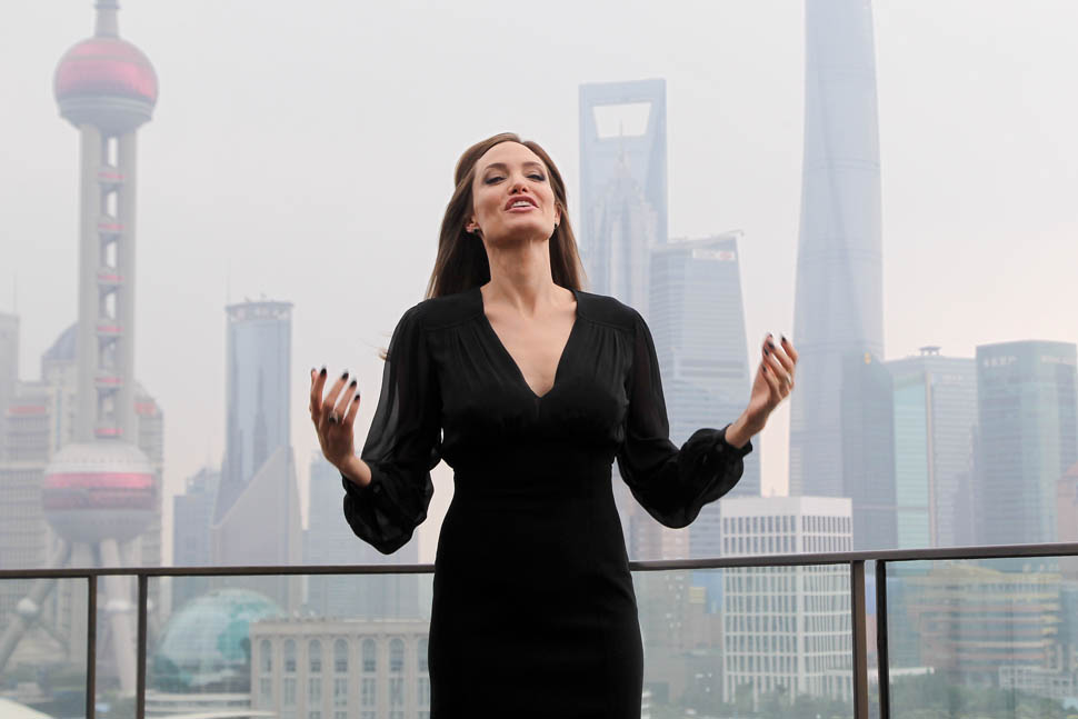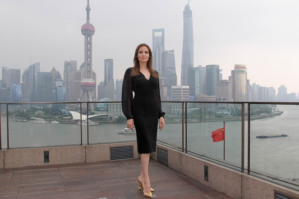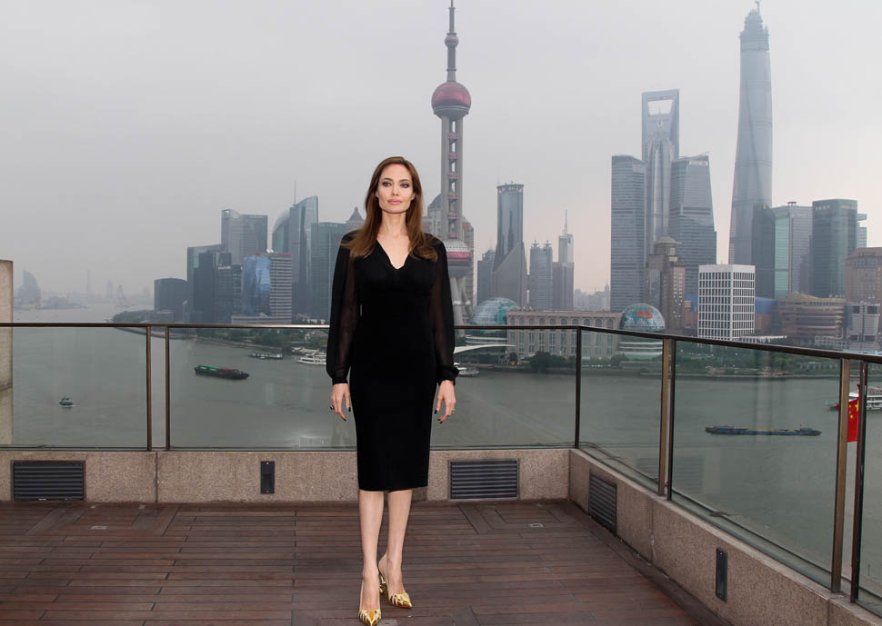 Angelina Jolie is in Shanghai promoting Maleficent. The movie did well at the box office here. And there’s so much money over in China, she has to go get it. Brad Pitt did not join her for the trip. We’ll come back to him later.