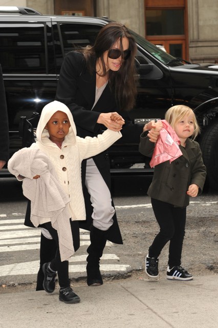 She’s been in New York this week, said to be prepping for production on Salt, the Tom Cruise movie that was gender switched to accommodate her amazingness. It’s back to the badass bitch we know on screen: Angelina plays a spy, wrongly accused, so she runs around the world eluding capture while gathering evidence to prove her innocence. So like Jason Bourne. But femme. And maybe no amnesia? Whatever…it doesn’t matter.