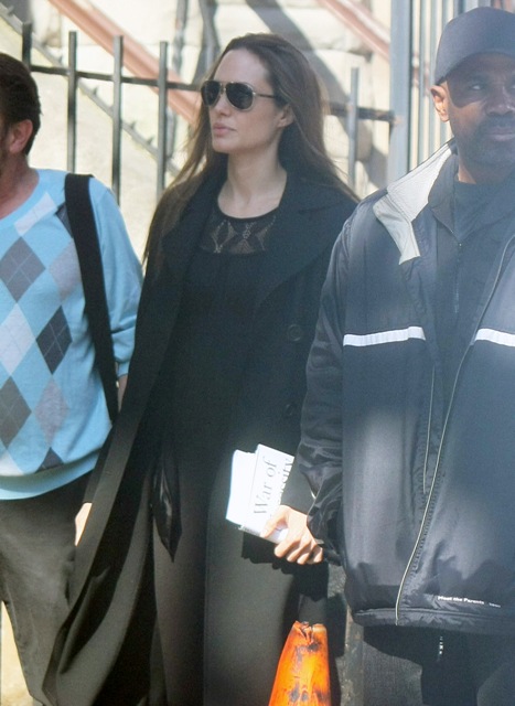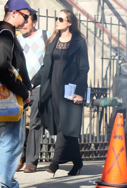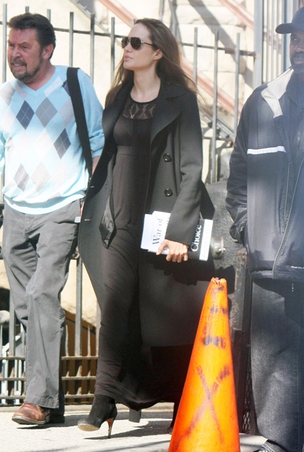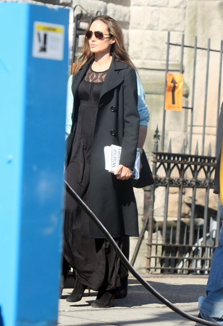 It’s Angelina Jolie today in NYC on the set of Salt. The dress is long and flowy which totally means next week the bottom feeding rags will be announcing her pregnancy: