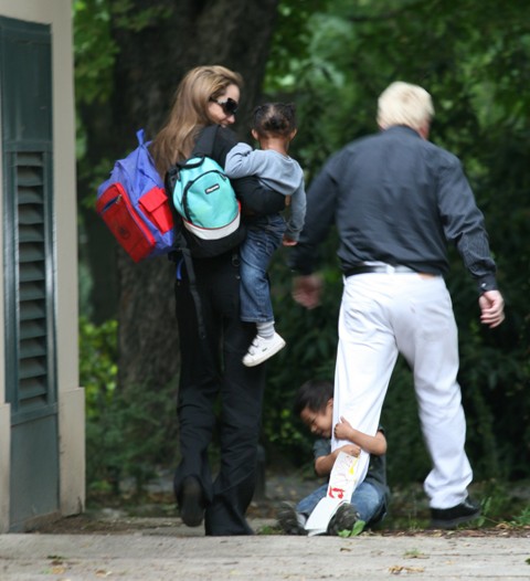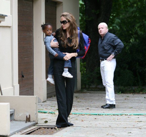 Also pics from earlier this week, Angelina picking up the kids while Brad was off shooting a commercial. As you can see, Pax seems rather attached to their trusty security dude Mickey. I remember when we were in Cannes, he’d stalk up and down the lobby at the du Cap, casing out the terrace before she came down for drinks, interrogating people like he owned the place if she was at the bar.