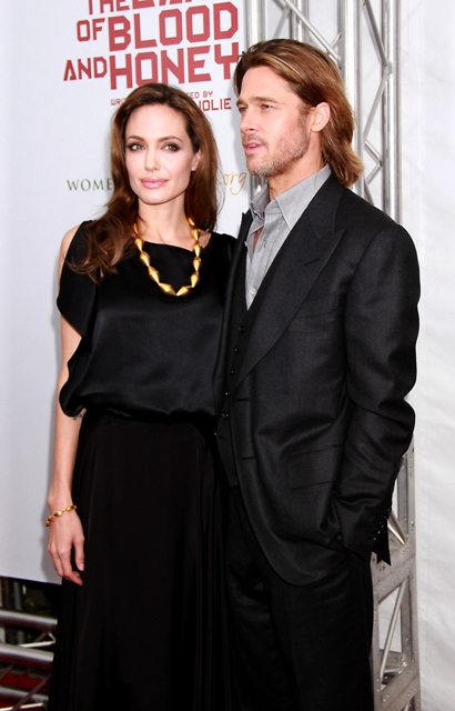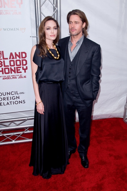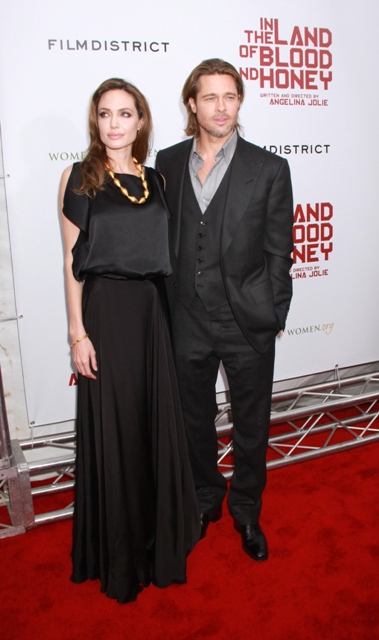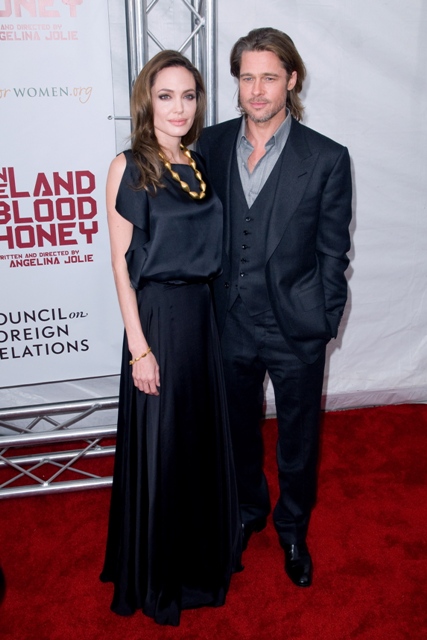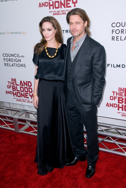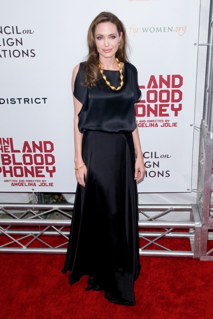 It was another case of the Sister Wife in sateen last night for Angelina Jolie in New York at the premiere of In The Land Of Blood And Honey. What is her deal with this material? And WHY does she insist on dressing like she wants to be on TLC?