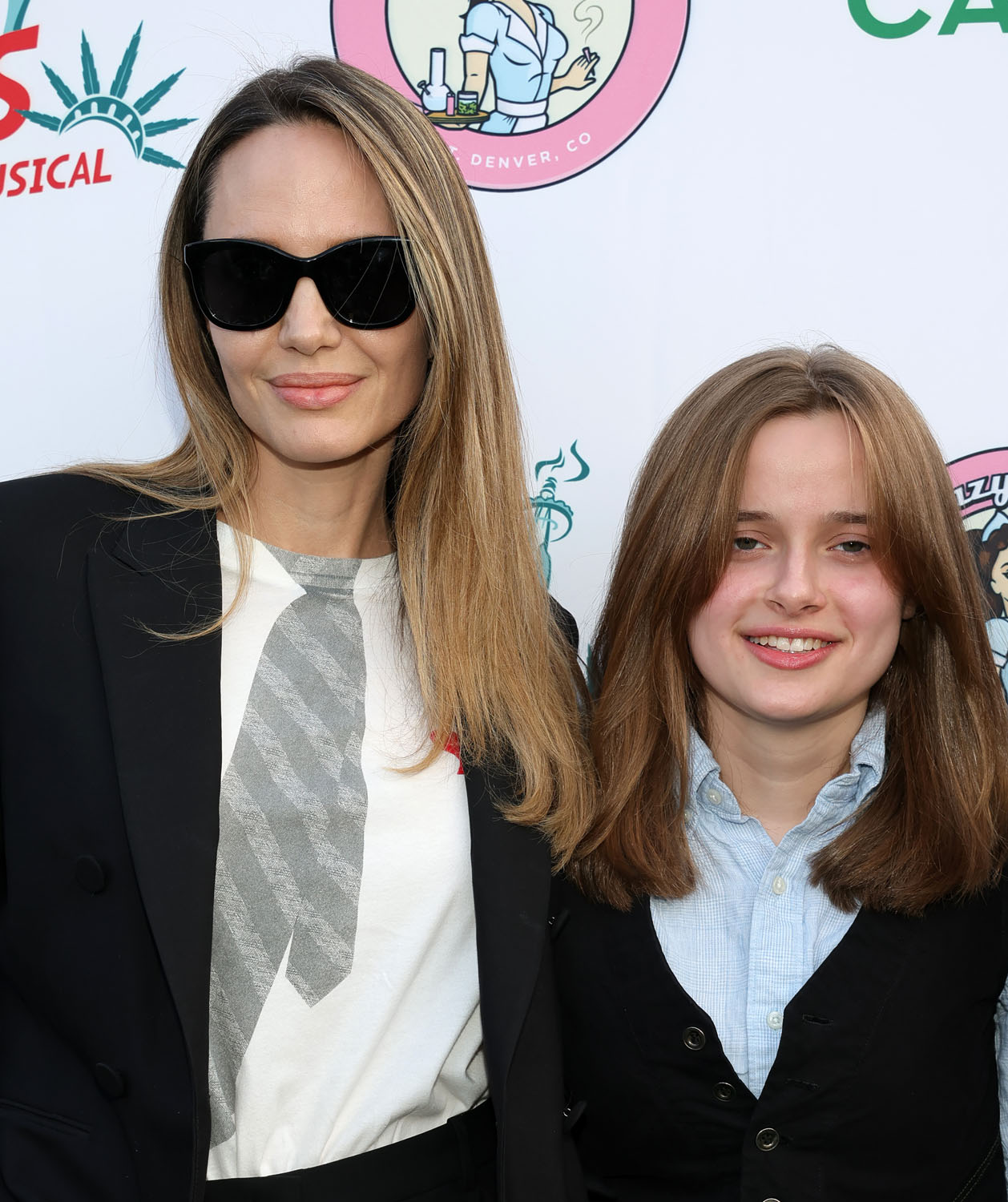 Angelina Jolie and her youngest daughter, Vivienne, got involved as producers of the musical adaptation of The Outsiders at least in part because Vivienne is, apparently, a musical theater nerd. Well, the theater kid strikes again as Angelina and Vivienne went to the premiere of a revival of Reefer Madness The Musical in Los Angeles yesterday. Angelina wore giant movie star sunglasses and an ironic tee shirt.