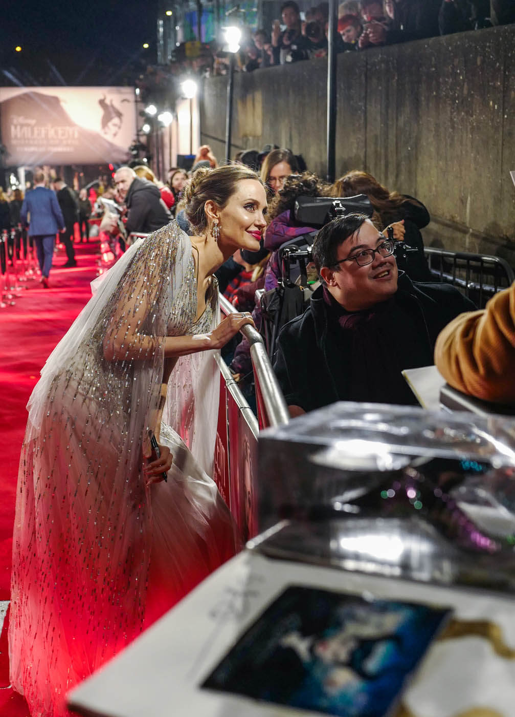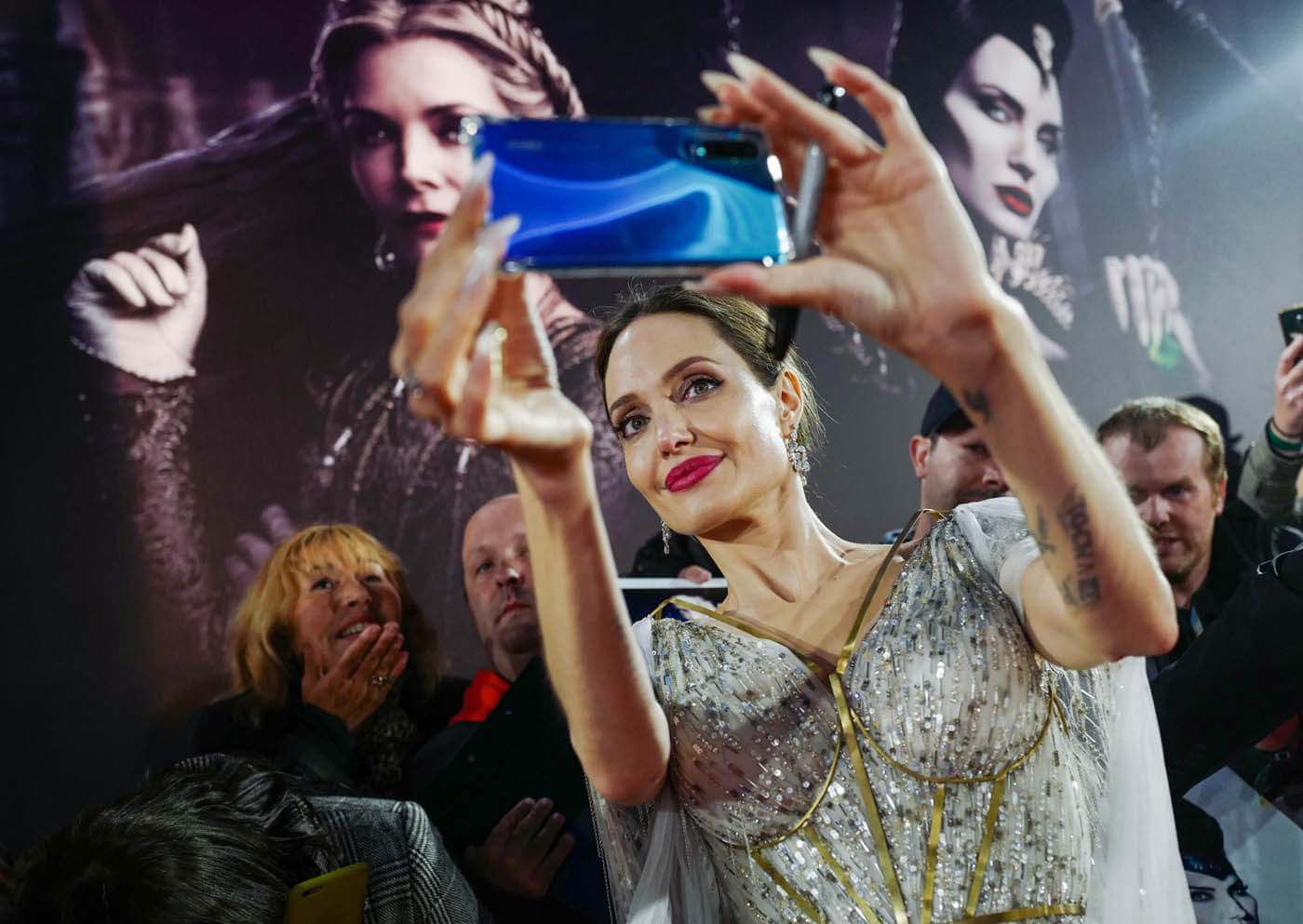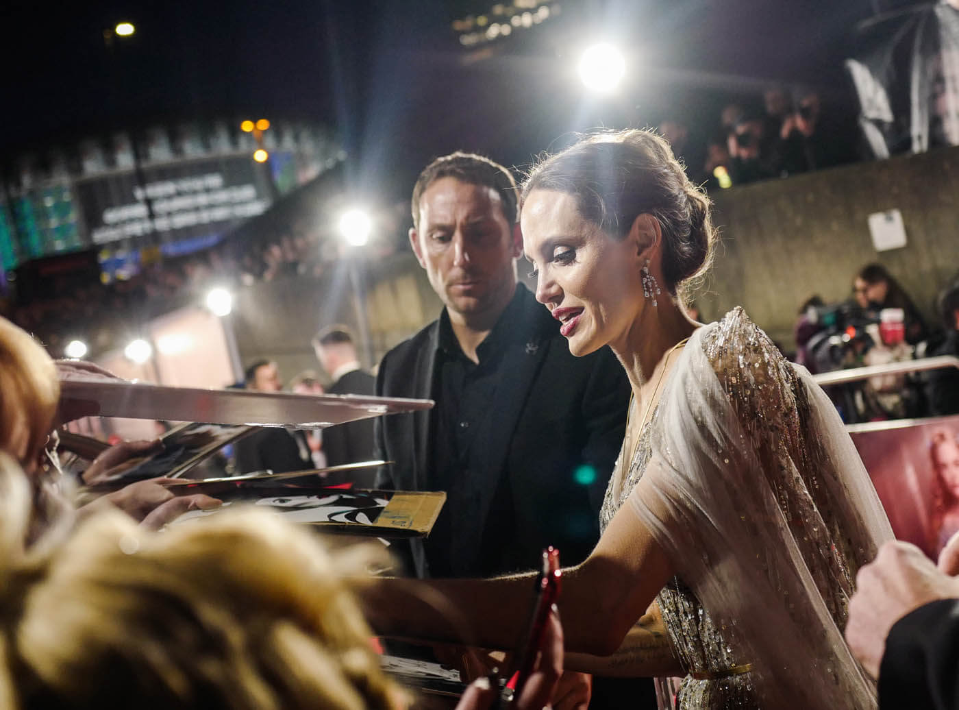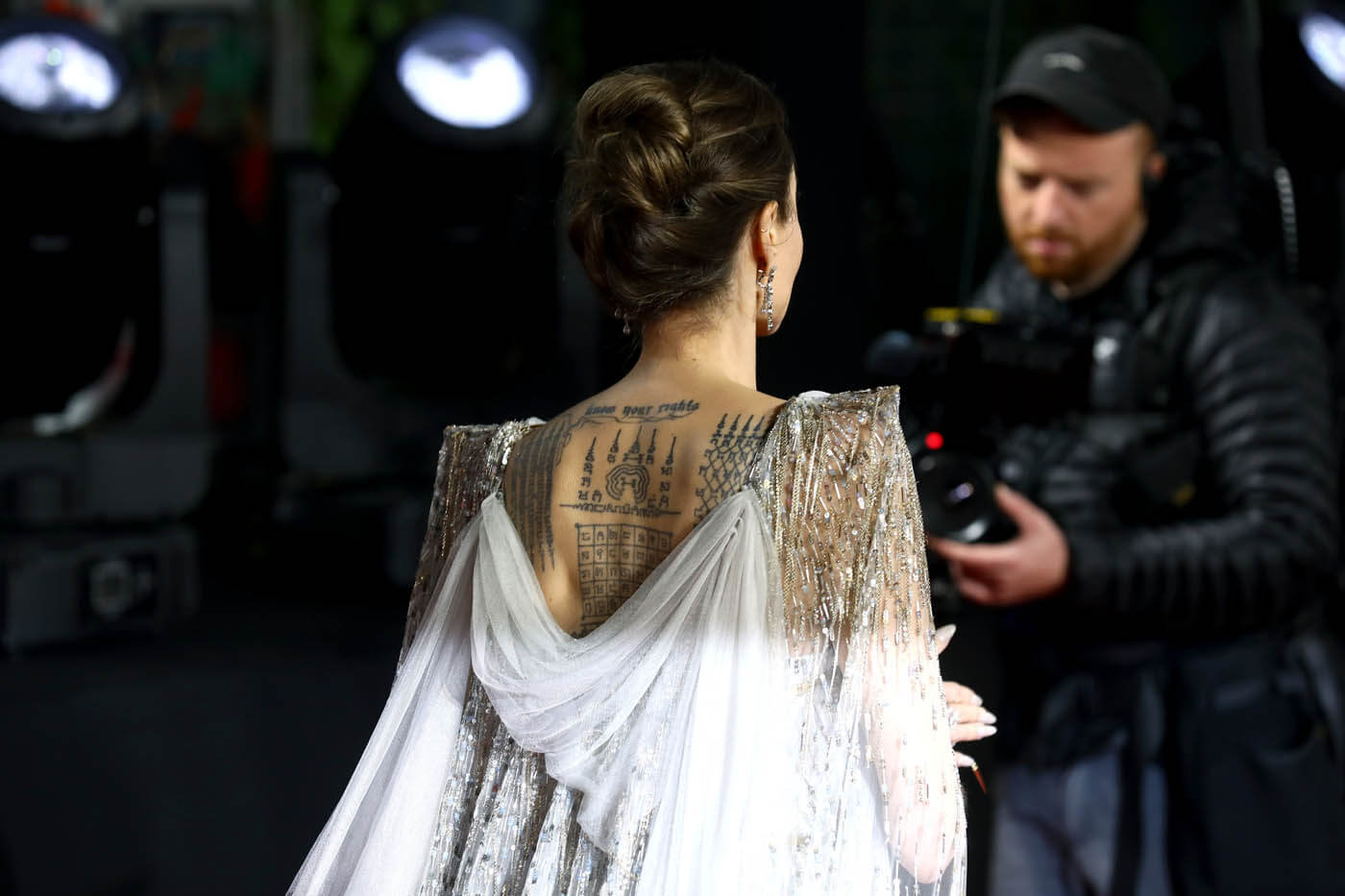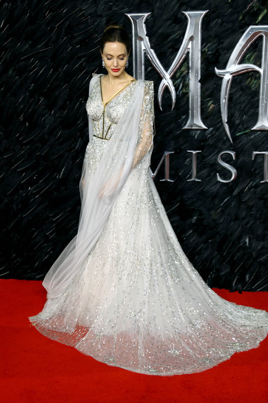 Here she is at the London premiere of Maleficent: Mistress of Evil, saving the most spectacular dress she’s worn this press tour – and over the last few years, a Ralph and Russo shimmering gown with a drop cape. Check out the back of it, the way it dips between the shoulders. It’s exquisite: