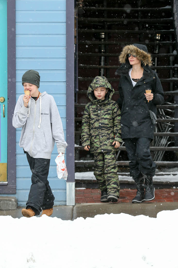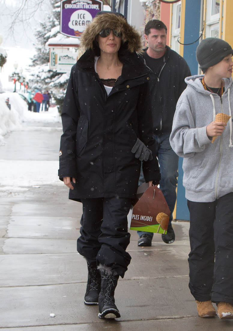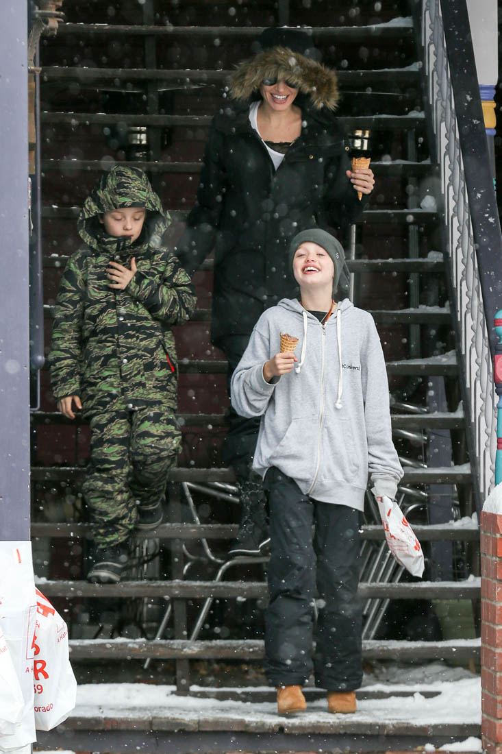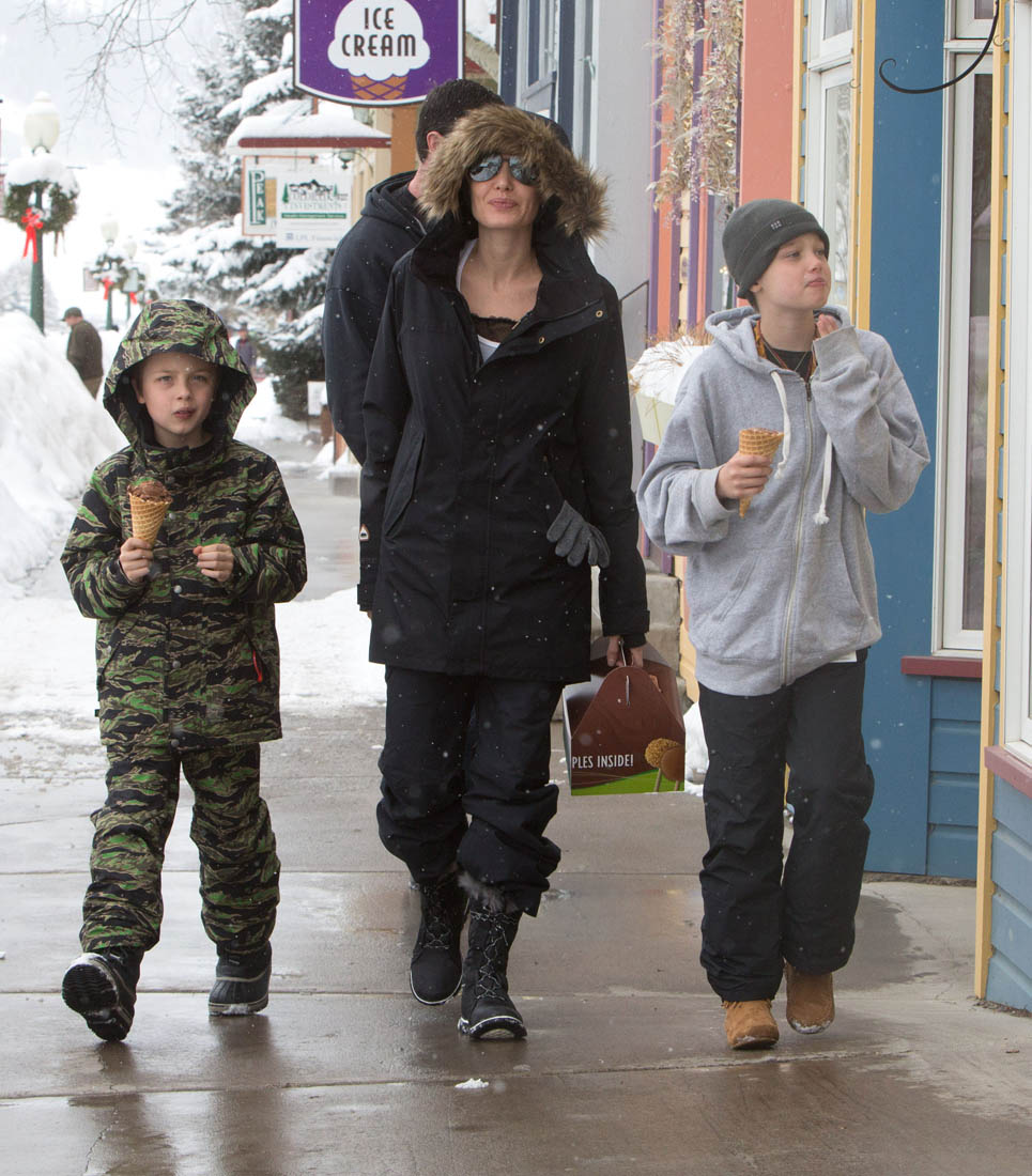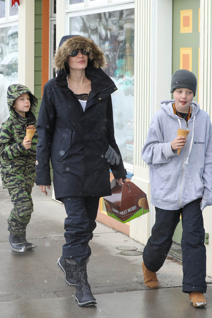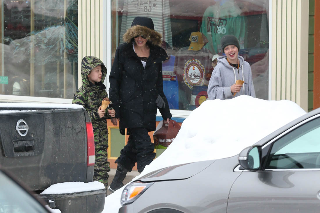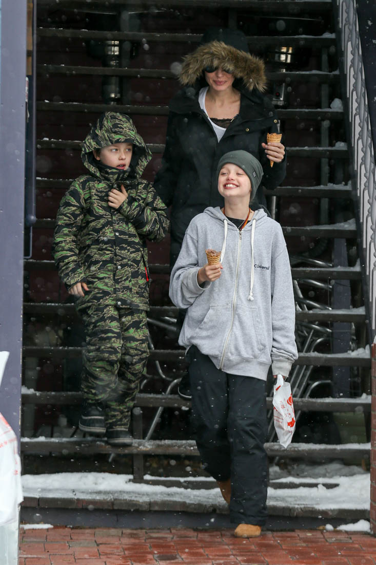 Angelina Jolie and the children were in Crested Butte, Colorado for NYE. Here she is with Shiloh and Knox out for ice cream. The Daily Mail has other photos of her with Vivienne and in some of the shots you can see that Mariane Pearl is with them. Mariane Pearl is a journalist and the widow of the late Daniel Pearl. Angelina Jolie played her in A Mighty Heart. Mariane wrote about their friendship for Glamour Magazine in 2014. So they’re on holiday together. And obviously they are still close.