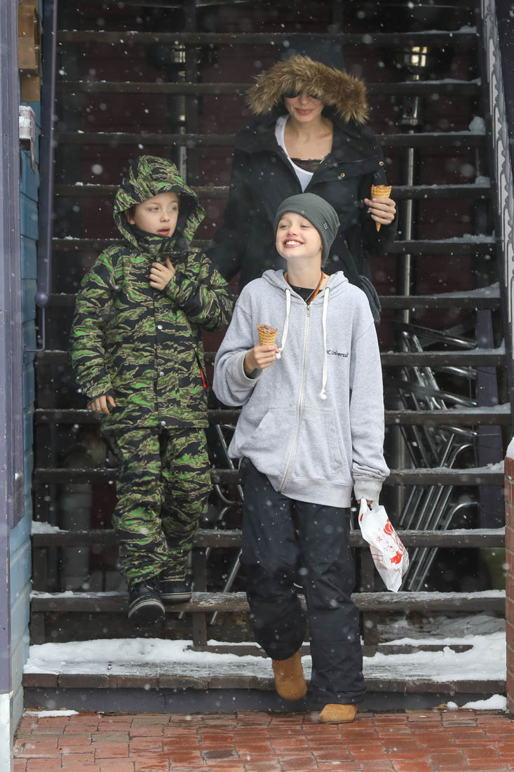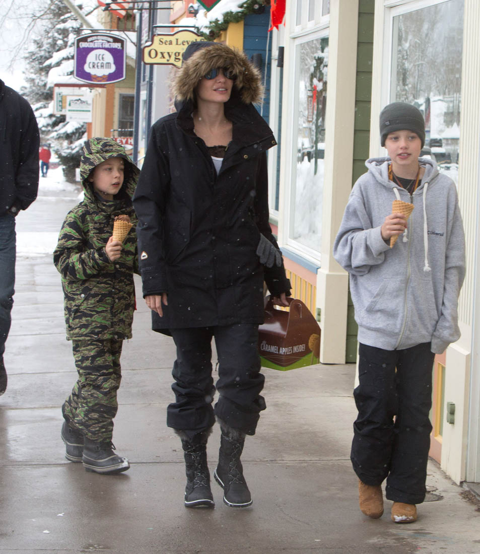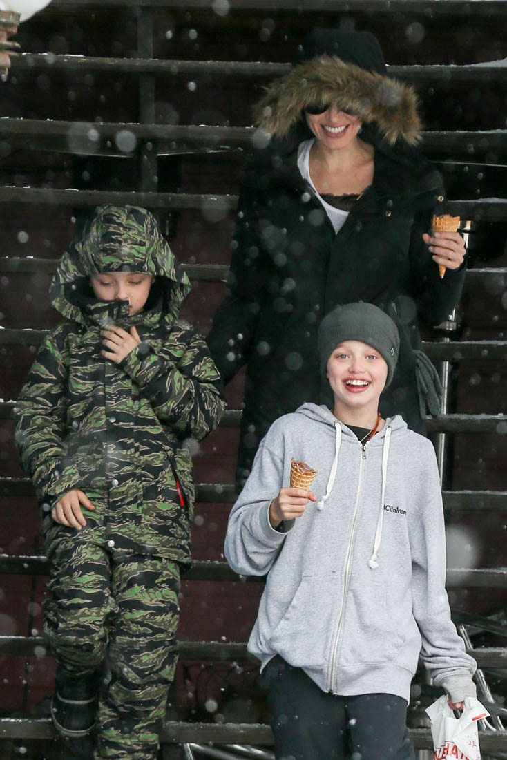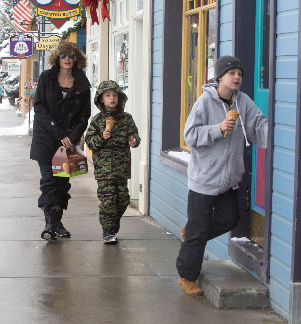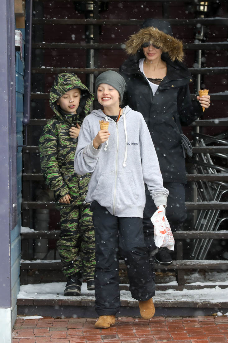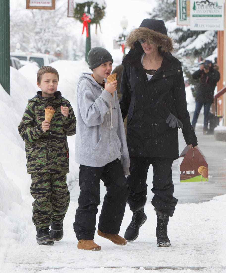 Angelina Jolie and the children were in Crested Butte, Colorado for NYE. Here she is with Shiloh and Knox out for ice cream. The Daily Mail has other photos of her with Vivienne and in some of the shots you can see that Mariane Pearl is with them. Mariane Pearl is a journalist and the widow of the late Daniel Pearl. Angelina Jolie played her in A Mighty Heart. Mariane wrote about their friendship for Glamour Magazine in 2014. So they’re on holiday together. And obviously they are still close.