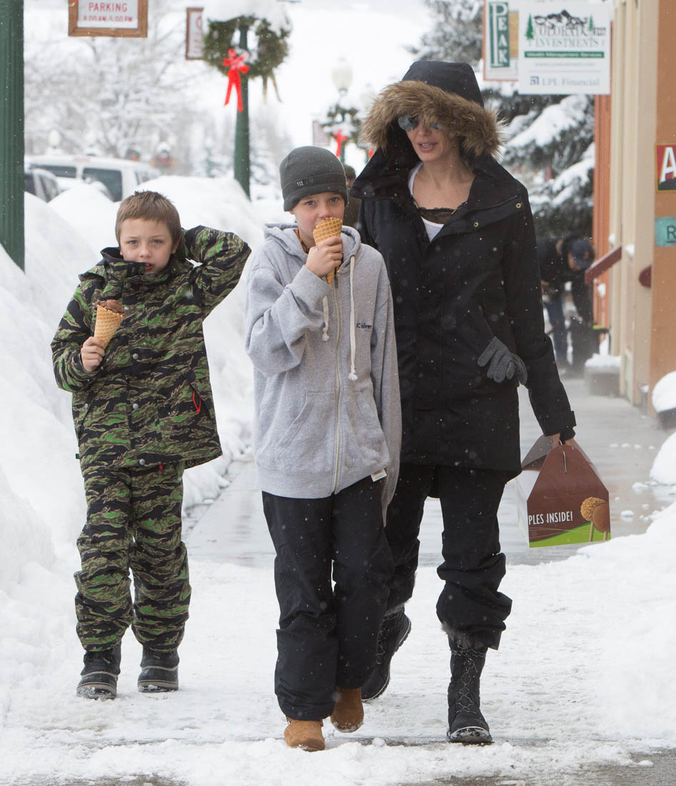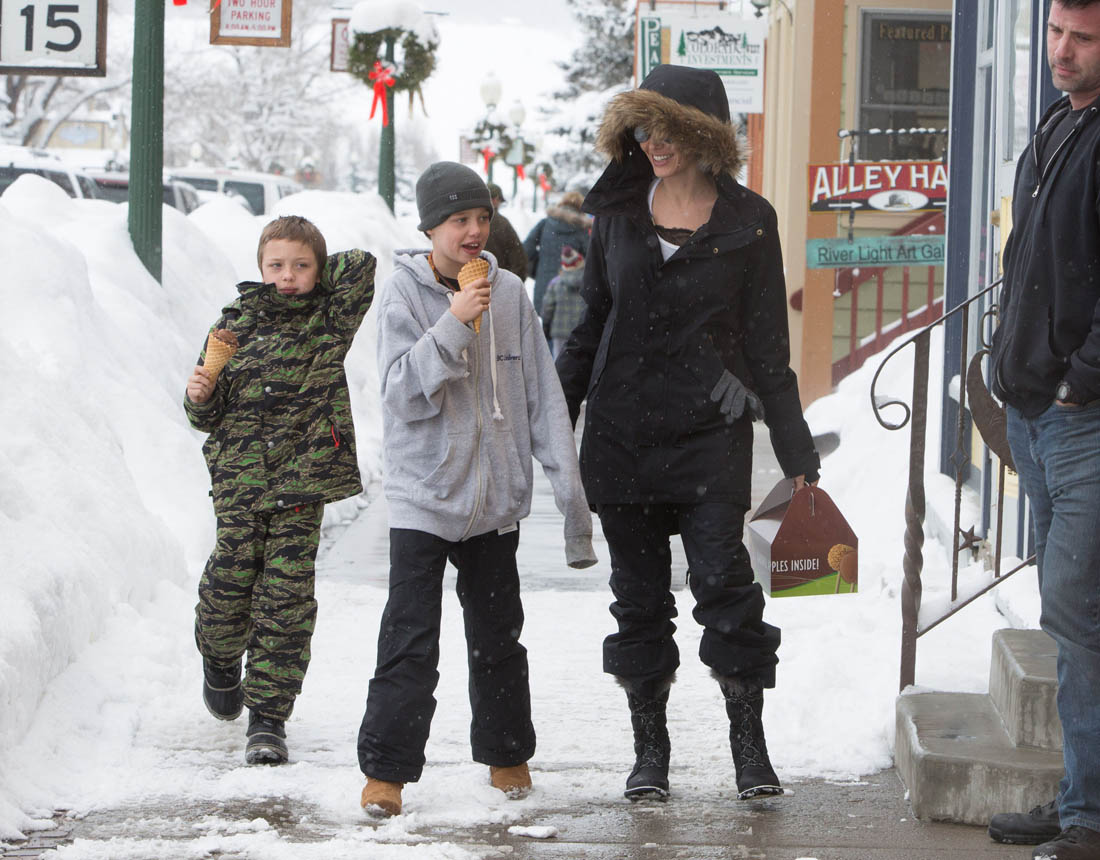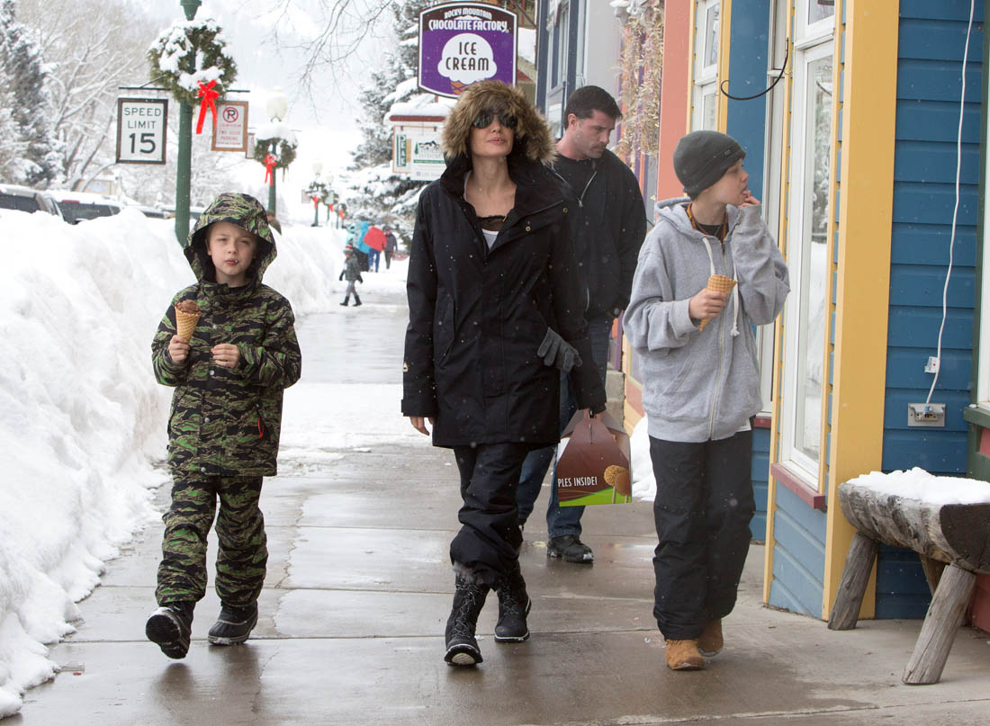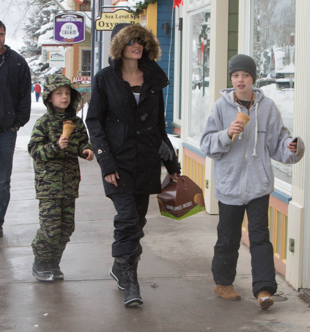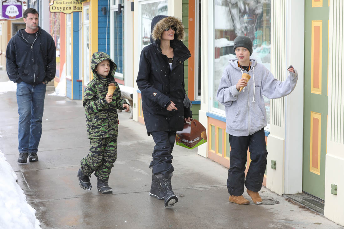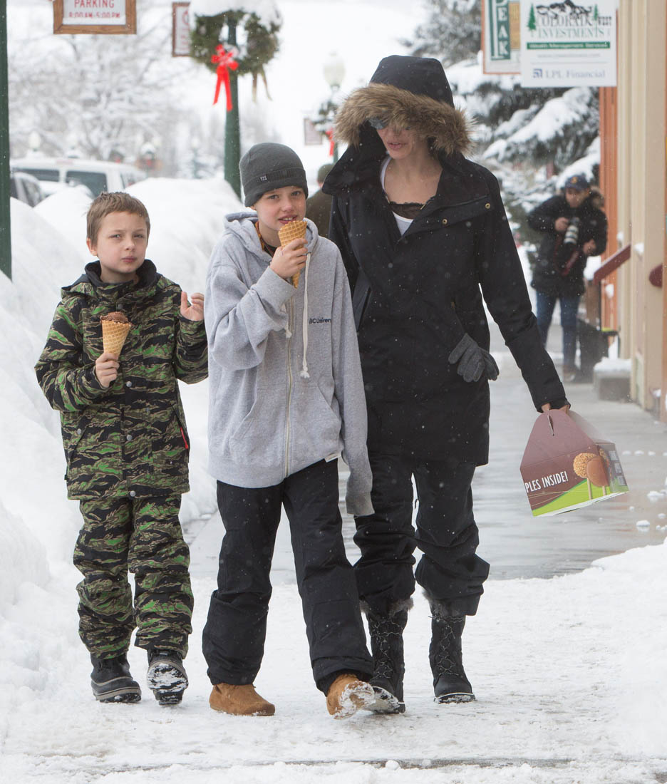 Angelina Jolie and the children were in Crested Butte, Colorado for NYE. Here she is with Shiloh and Knox out for ice cream. The Daily Mail has other photos of her with Vivienne and in some of the shots you can see that Mariane Pearl is with them. Mariane Pearl is a journalist and the widow of the late Daniel Pearl. Angelina Jolie played her in A Mighty Heart. Mariane wrote about their friendship for Glamour Magazine in 2014. So they’re on holiday together. And obviously they are still close.