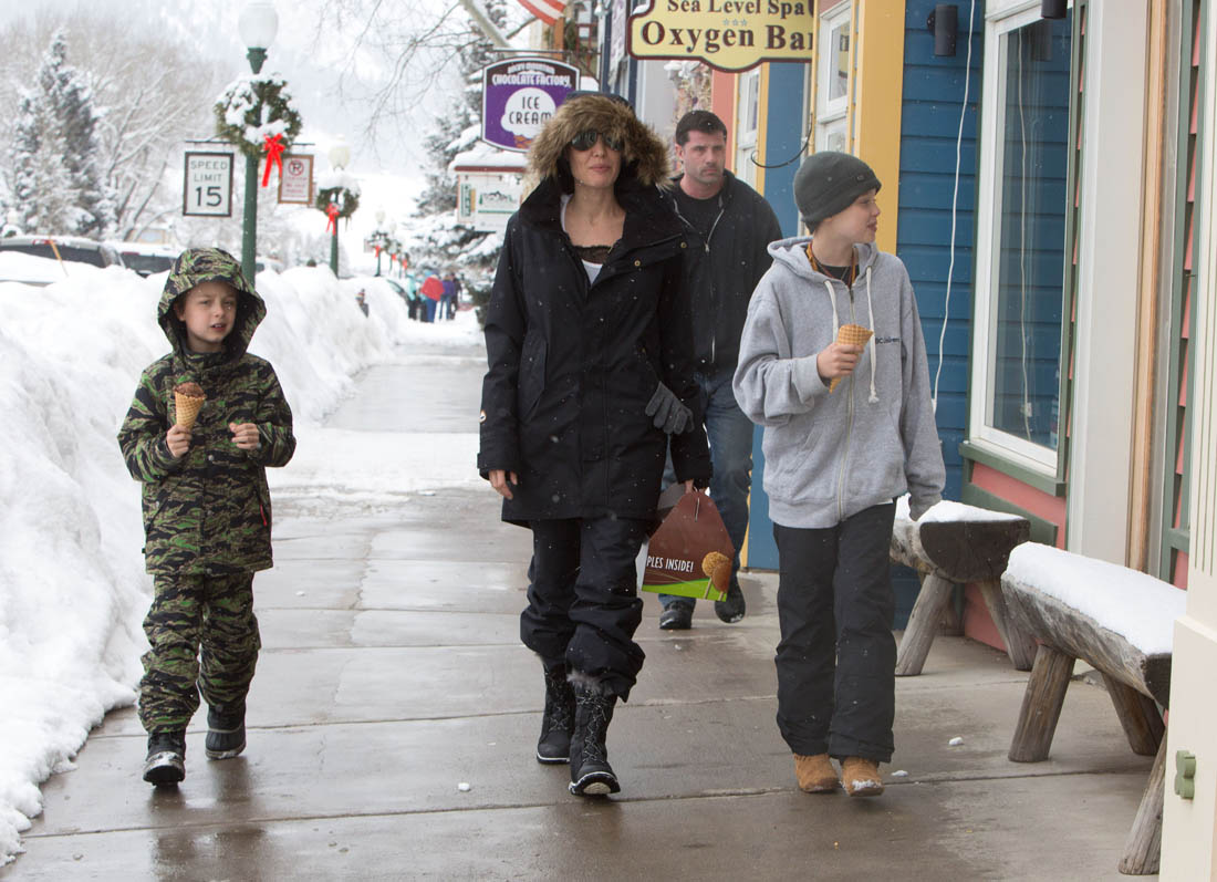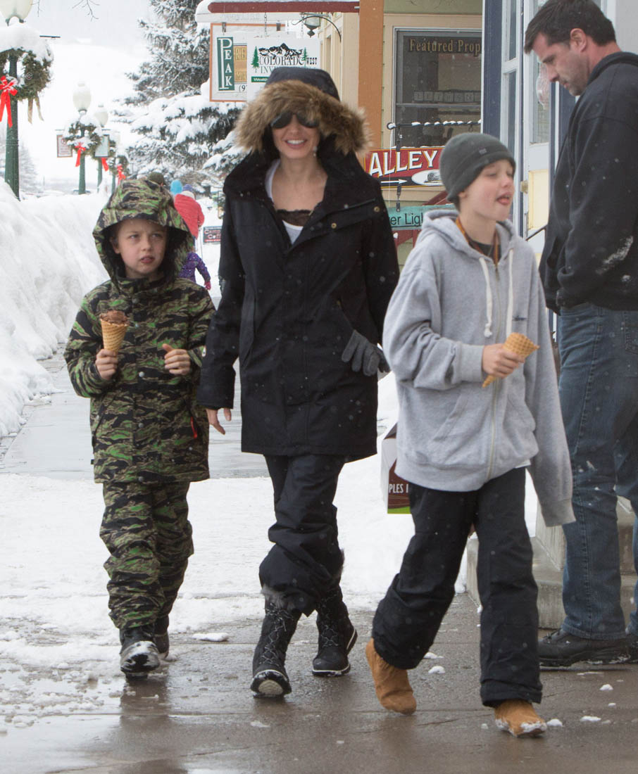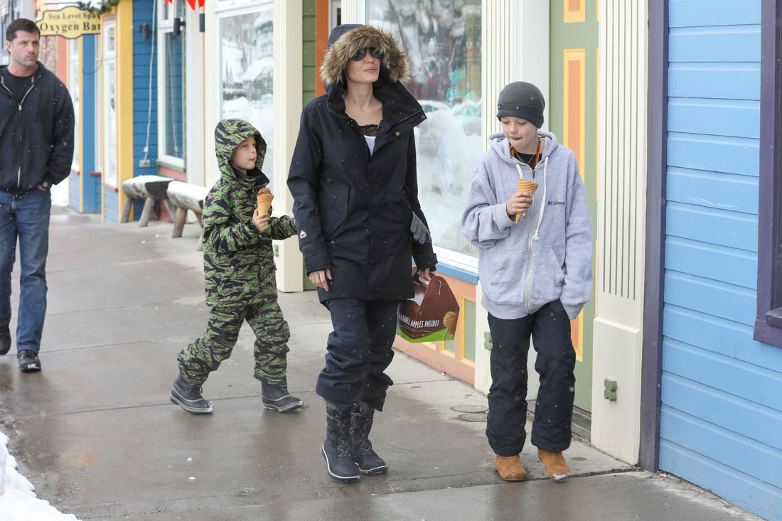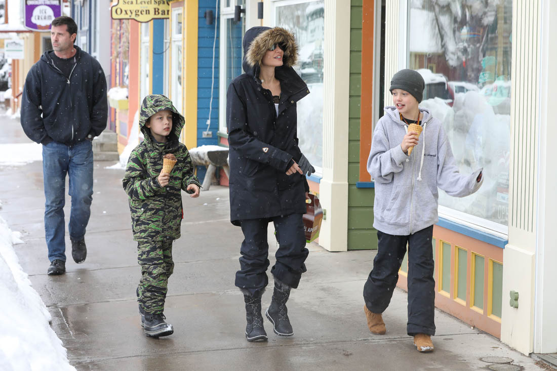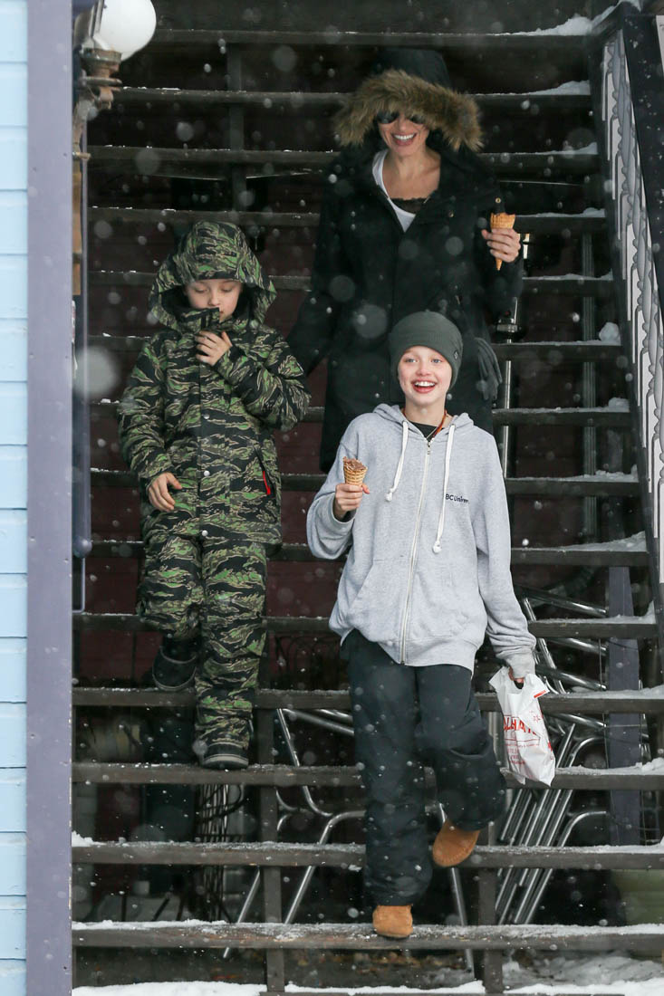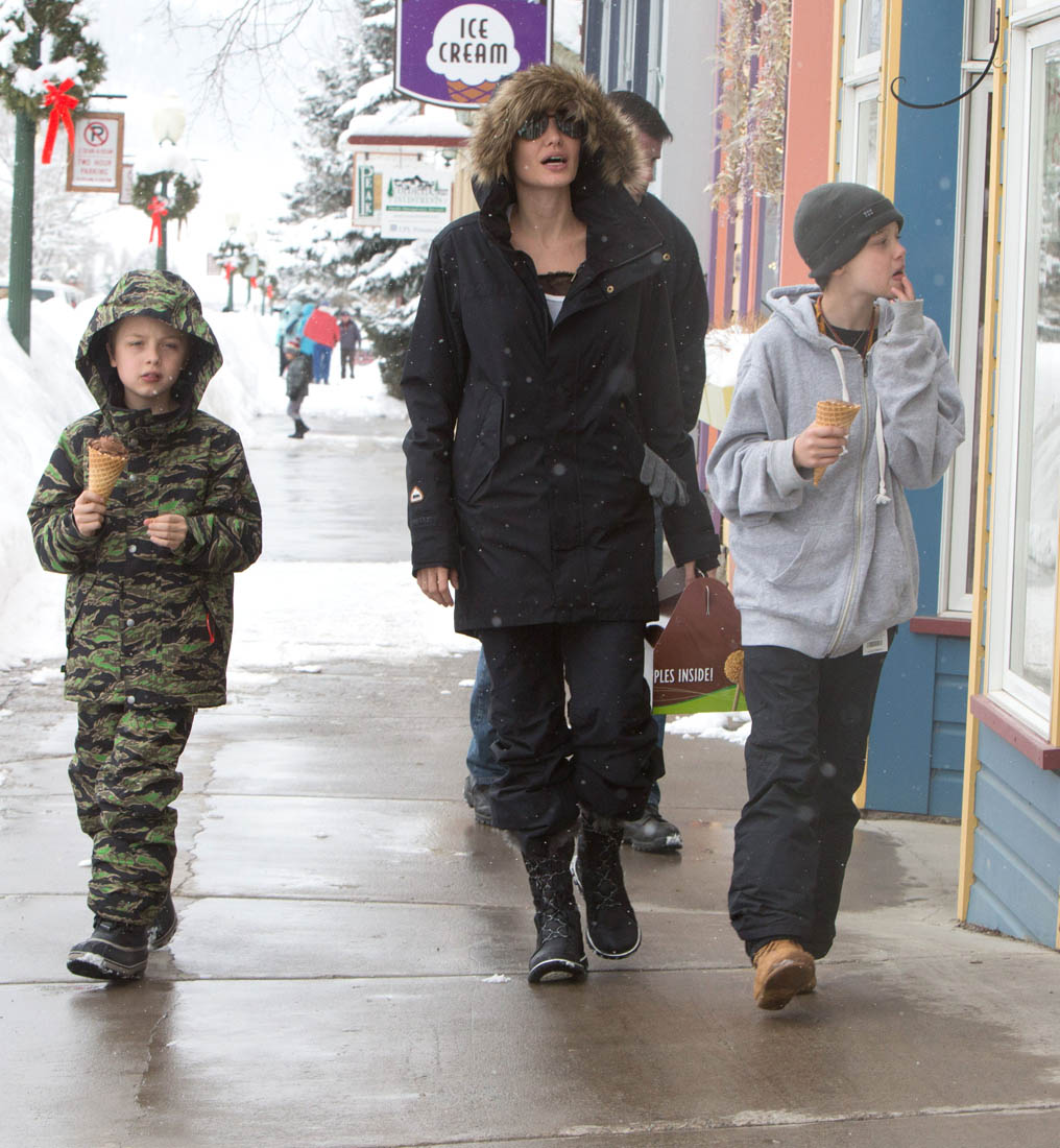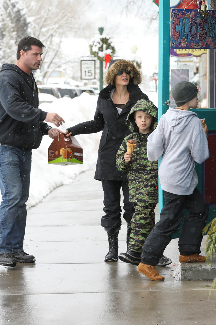 Angelina Jolie and the children were in Crested Butte, Colorado for NYE. Here she is with Shiloh and Knox out for ice cream. The Daily Mail has other photos of her with Vivienne and in some of the shots you can see that Mariane Pearl is with them. Mariane Pearl is a journalist and the widow of the late Daniel Pearl. Angelina Jolie played her in A Mighty Heart. Mariane wrote about their friendship for Glamour Magazine in 2014. So they’re on holiday together. And obviously they are still close.